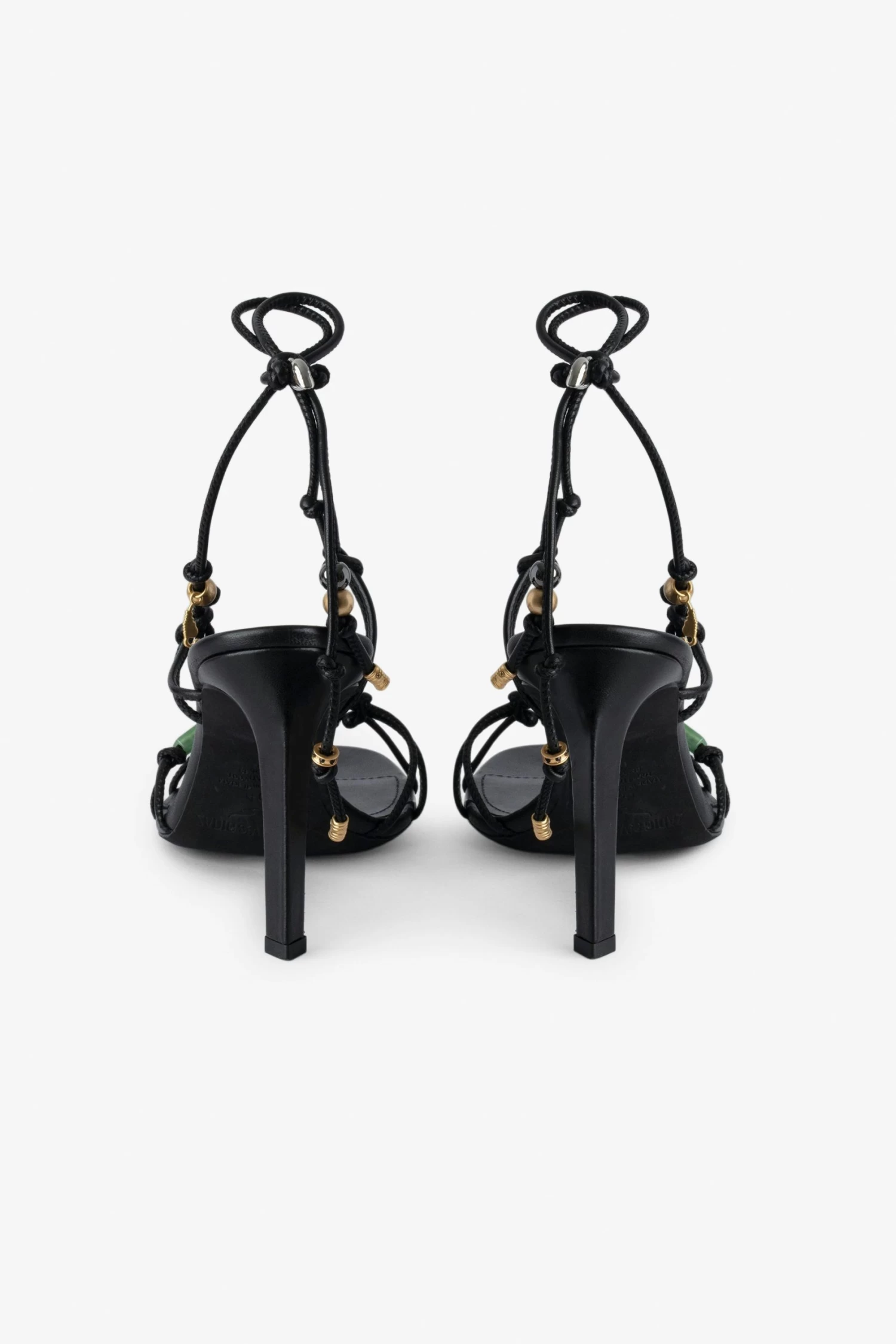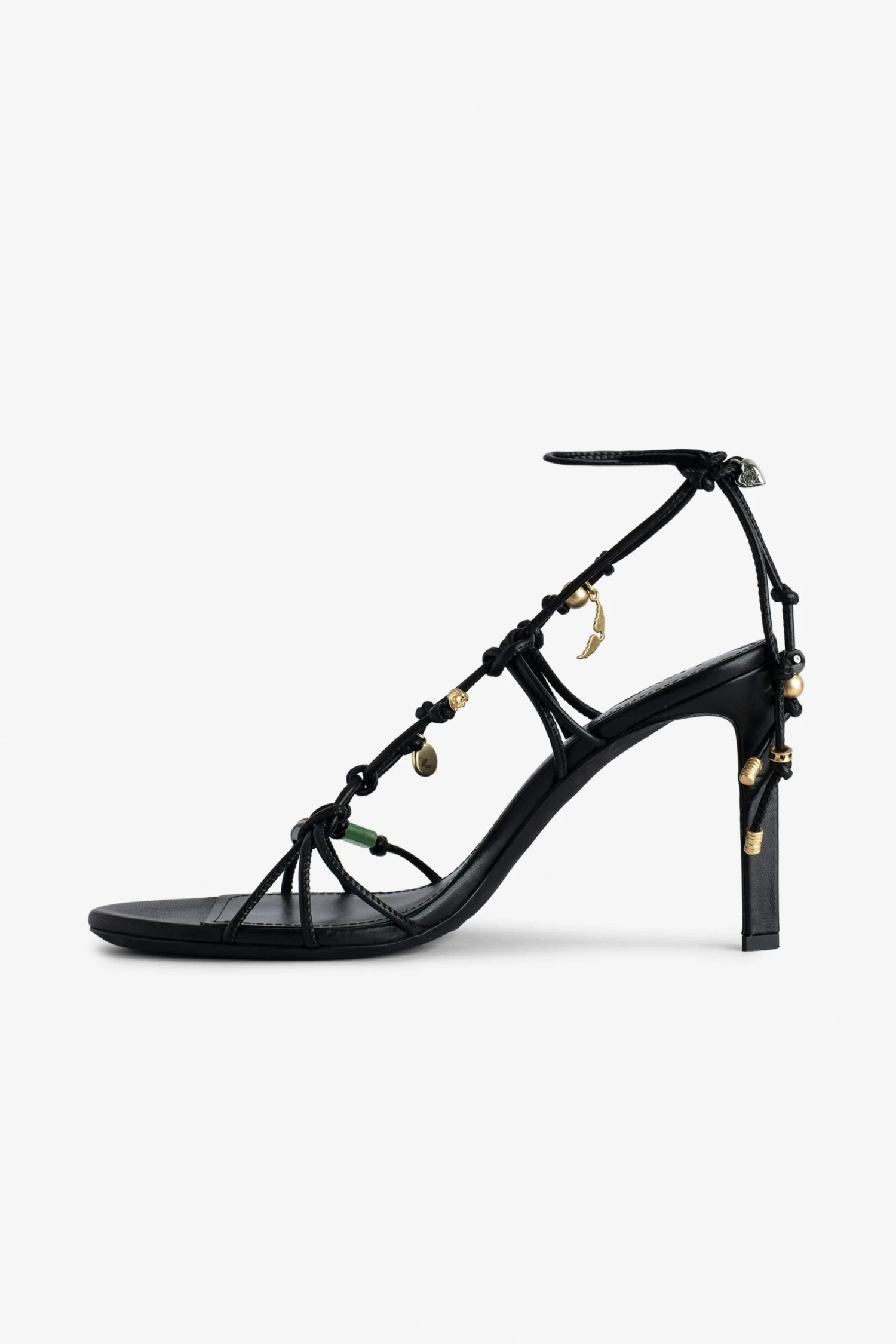 Women’s black smooth leather heeled sandals with tied straps and charms.