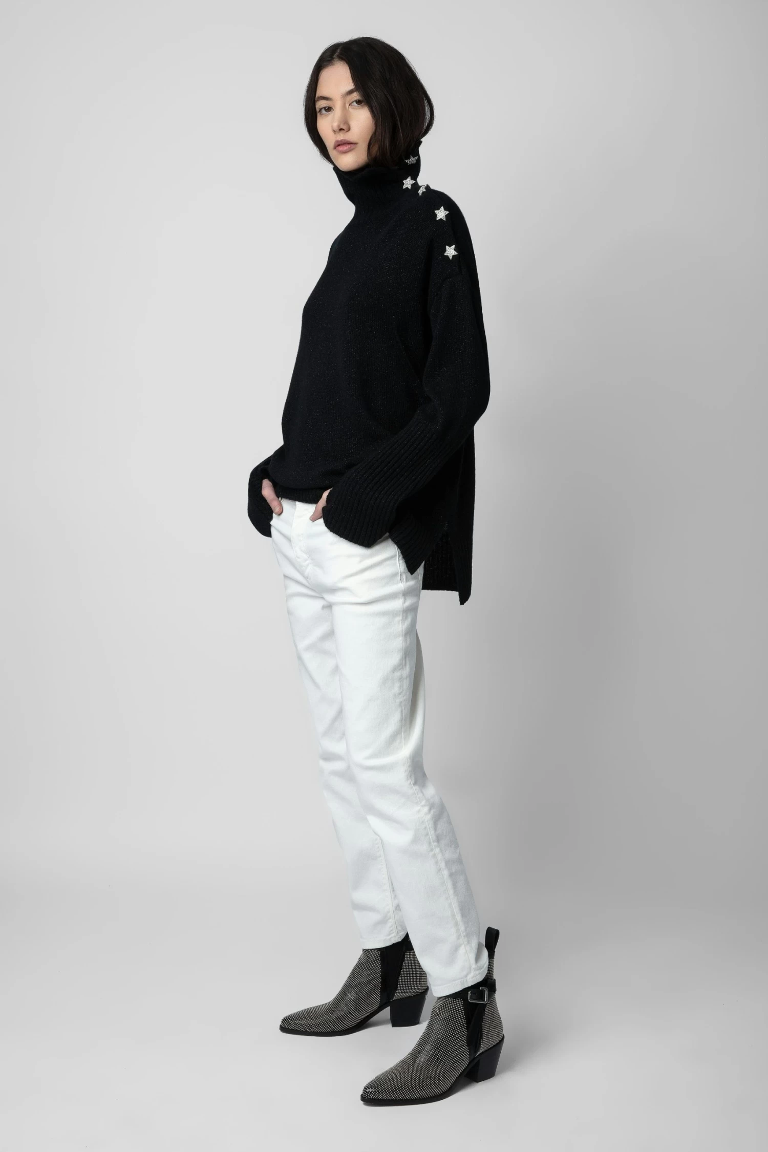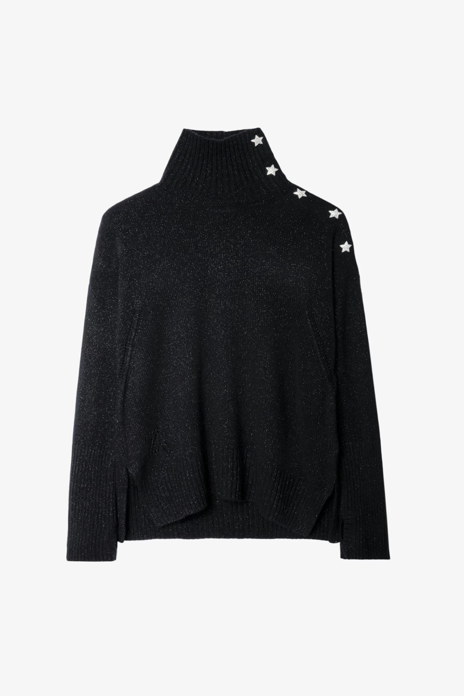 Women’s cashmere turtleneck sweater with star buttons in black.