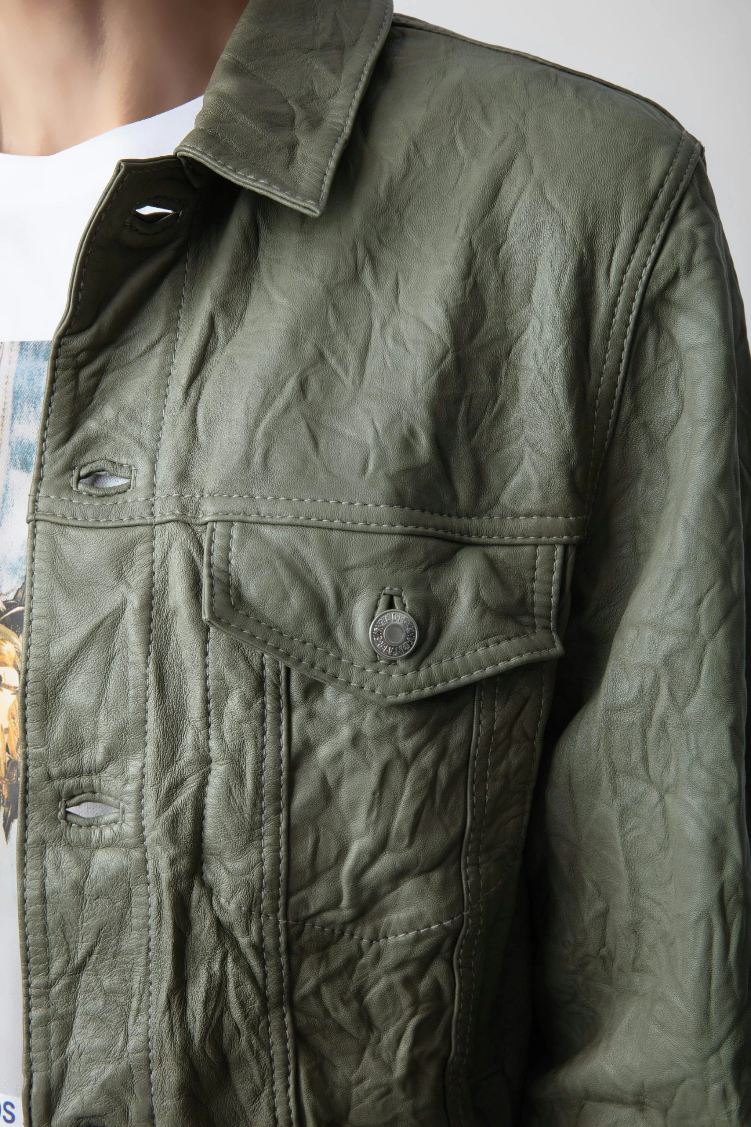 – Men’s crinkled leather jacket – Shirt collar – 2 flat button pockets on chest – Long sleeves with rounded cuffs – Snap buttons down frontModel is 188 cm / 6′ 2″ and is wearing a size M