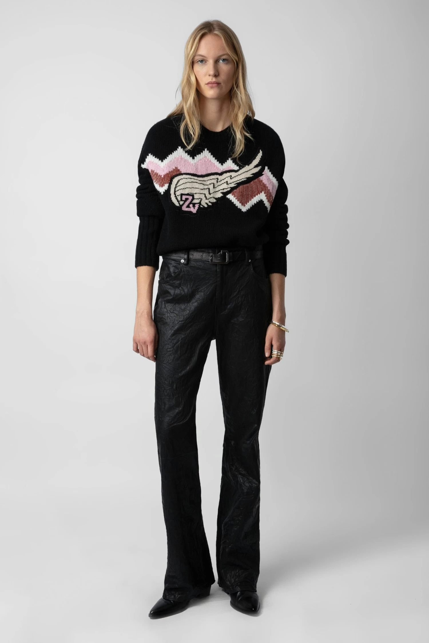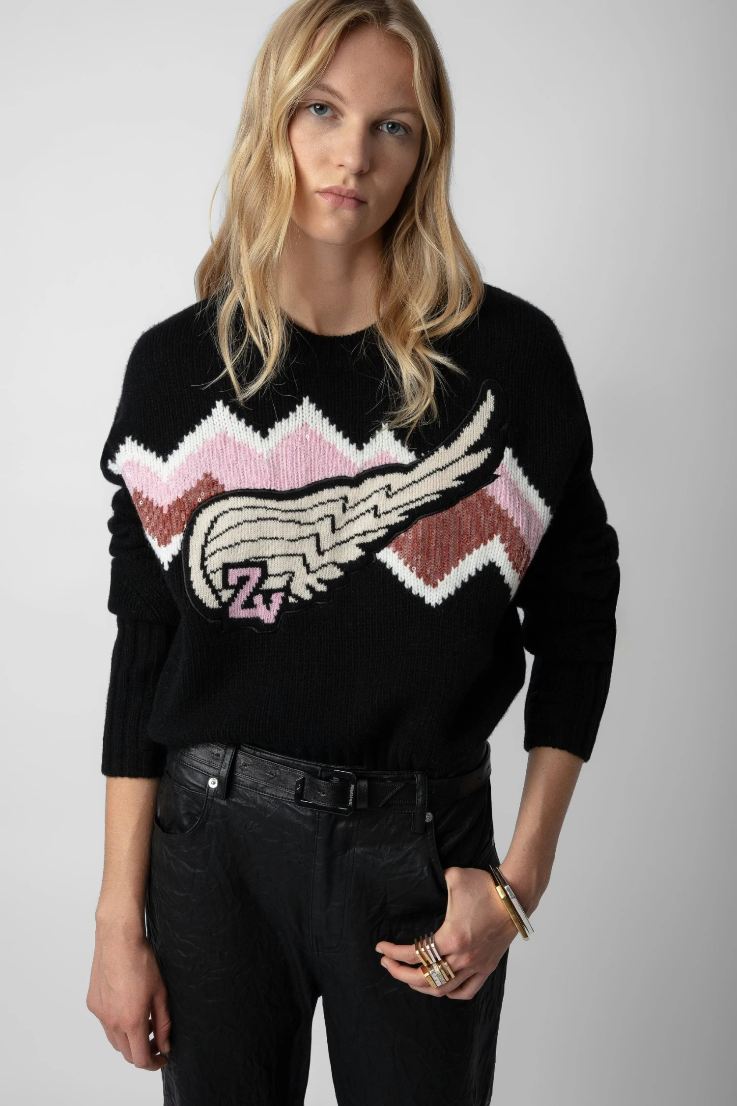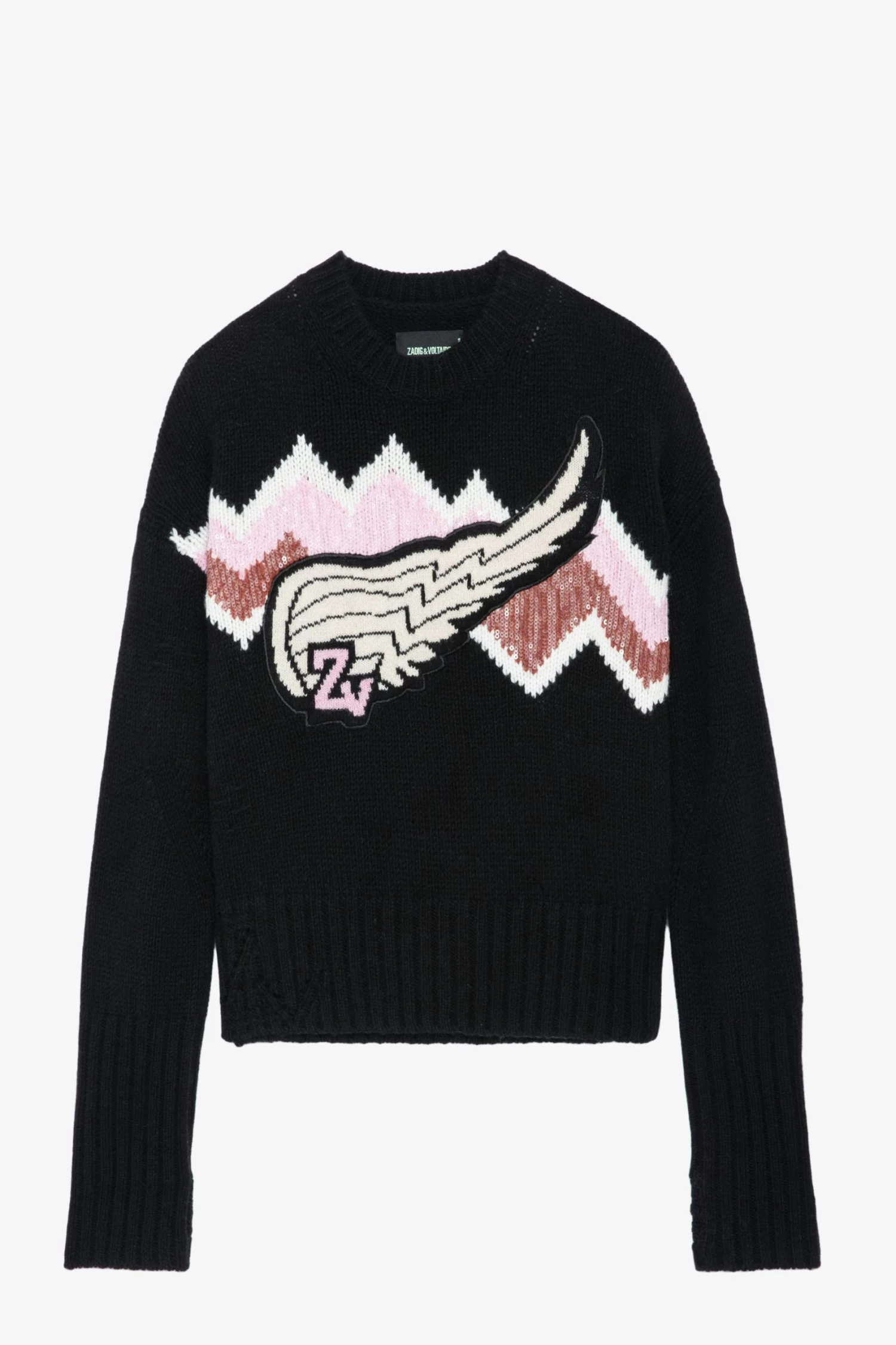 Women’s black cashmere sweater with pink chevron pattern, wing motif, and sequin embroidery