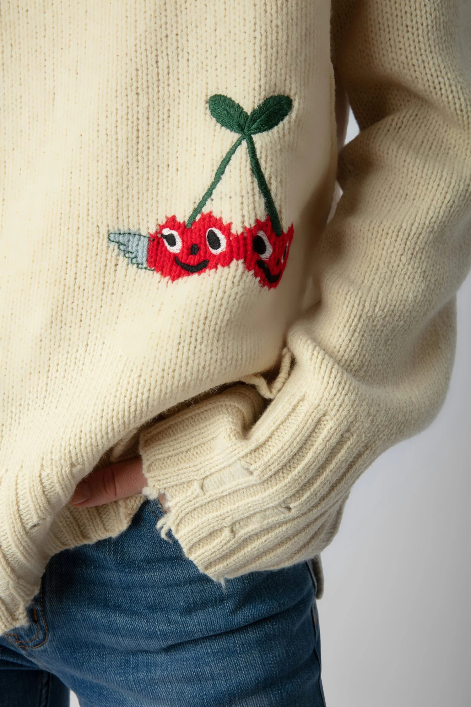 Customized details designed by Humberto Cruz, an artist and illustrator from San Diego. Influenced by pop culture, fashion and colors, he describes his work as spontaneous and quirky. – Women’s ecru merino wool sweater – Mock neck, notched at the back – Long sleeves and distressed-effect ribbed trim – Motifs and slogans in intarsia jacquard and pointelle ZV signature Model is 180 cm / 5′ 10″ and is wearing a size S*Contains 100% RWS certified woolThe Responsible Wool Standard (RWS) guarantees animal welfare and respect for pastures. It also ensures end-to-end traceability of the wool through the supply chain
