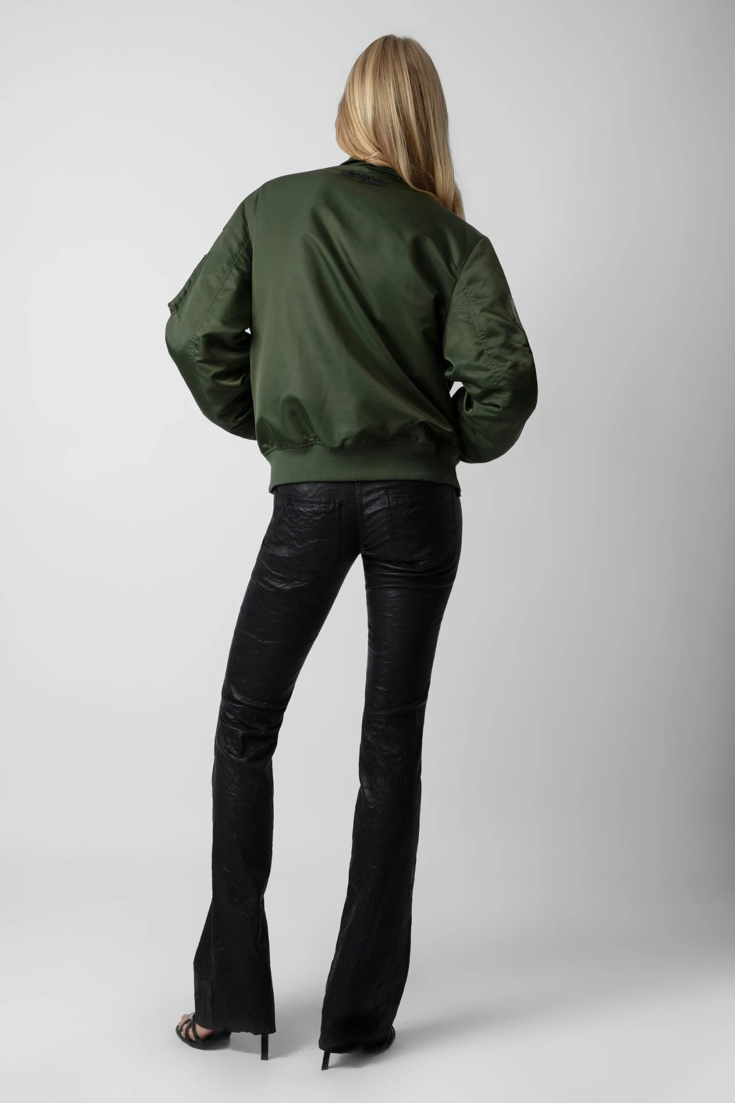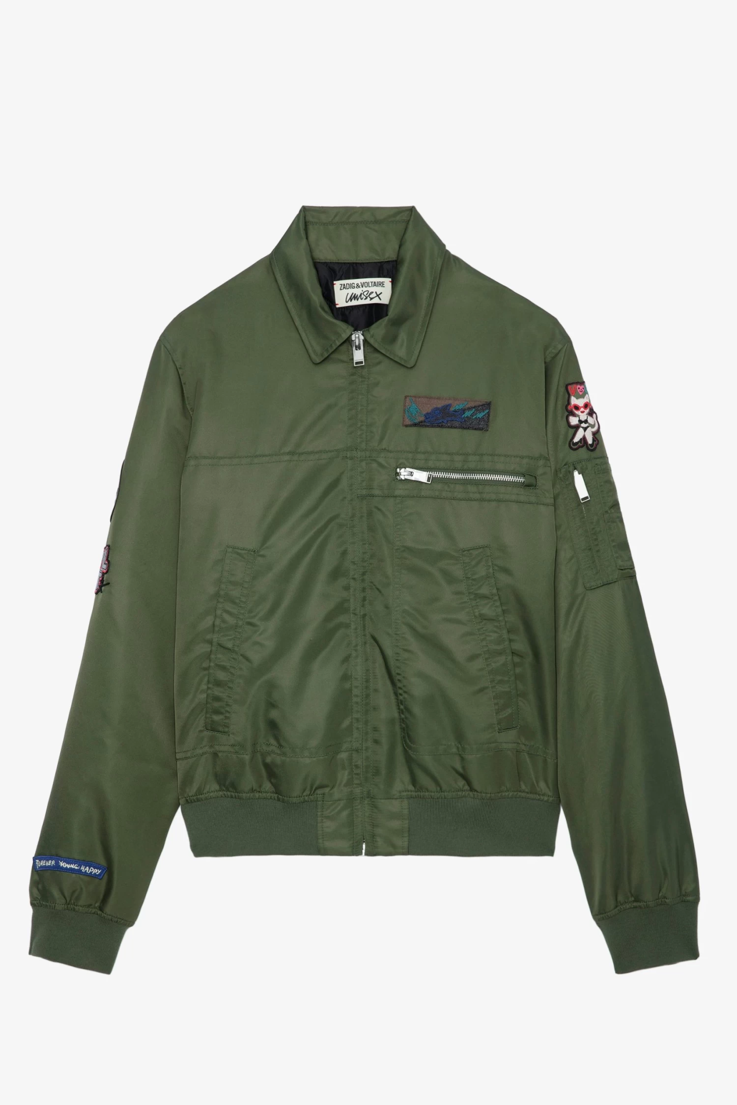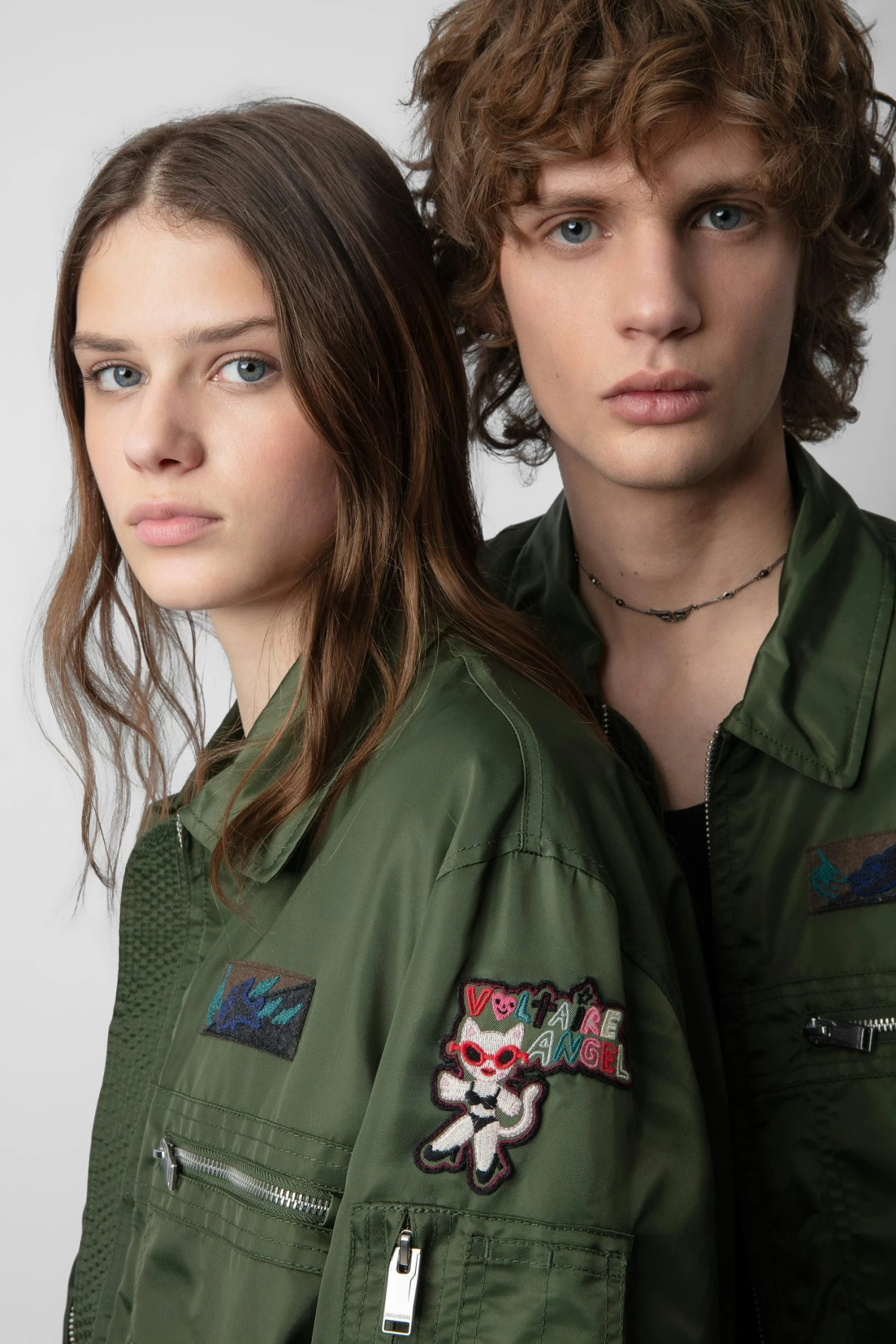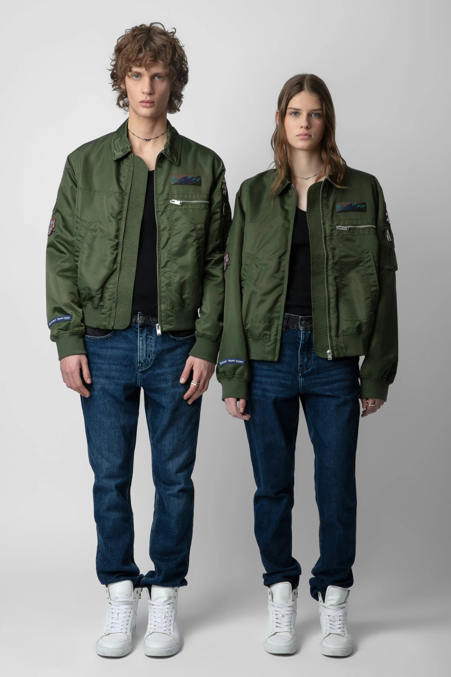 The Bolid jacket is part of the UNISEX collection. A free-spirited wardrobe by Zadig&Voltaire, the UNISEX collection represents the fusion of feminine and masculine features. Customized details designed by Humberto Cruz, an artist and illustrator from San Diego. Influenced by pop culture, fashion and colors, he describes his work as spontaneous and quirky. – Unisex Used khaki oversized jacket – Shirt collar and zip fastening – 2 side pockets and 2 zip pockets on the chest and left sleeve – Long sleeves, ribbed trim and tighter hem and cuffs – Contrasting patches on the front and back *Contains 100% of recycled polyamidGRS certification guarantees the presence and quantity of recycled material in the product. It ensures a social, environmental and chemical responsible management, as well as an end-to-end traceability of the recycled material through the supply chain.