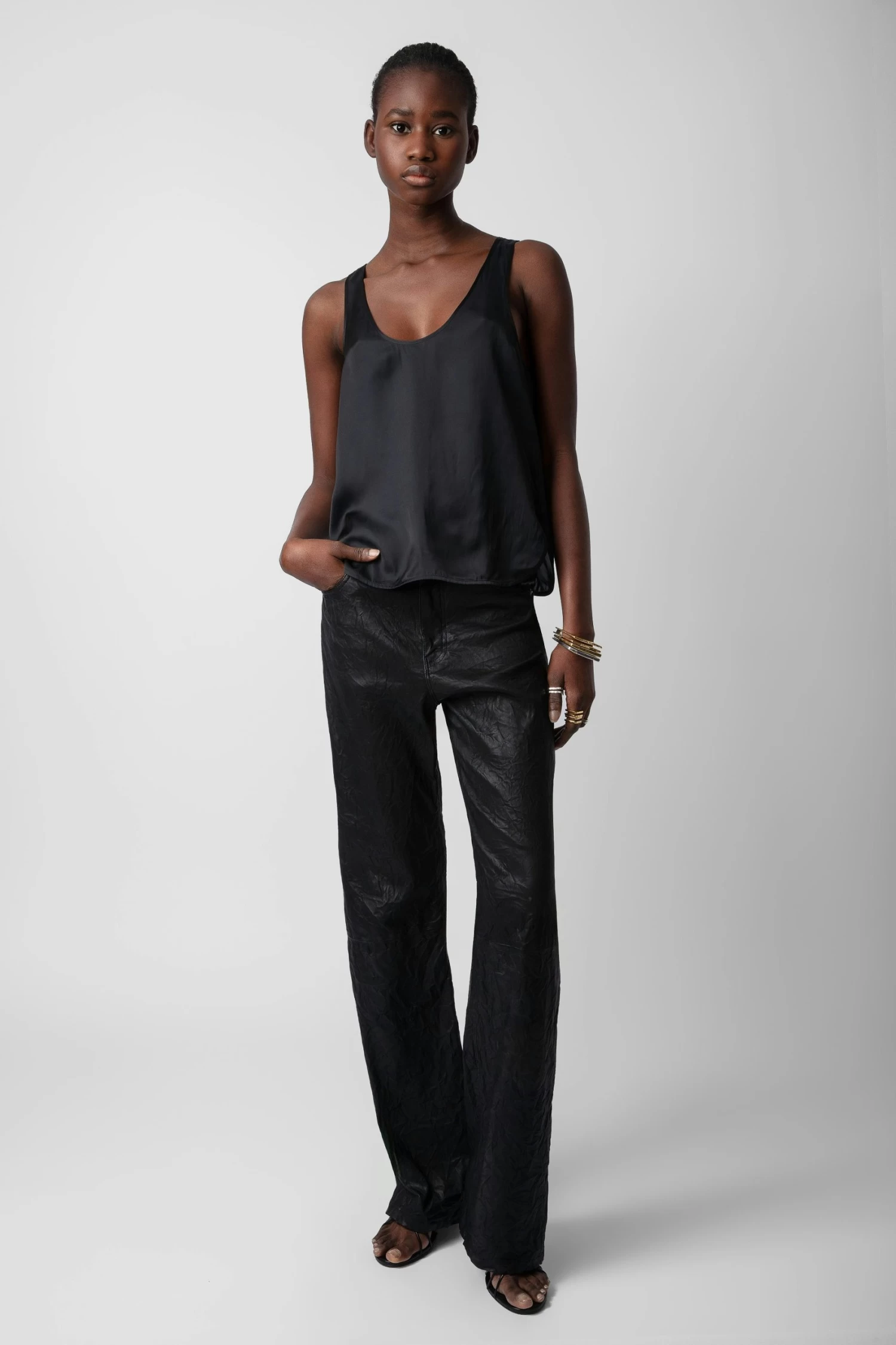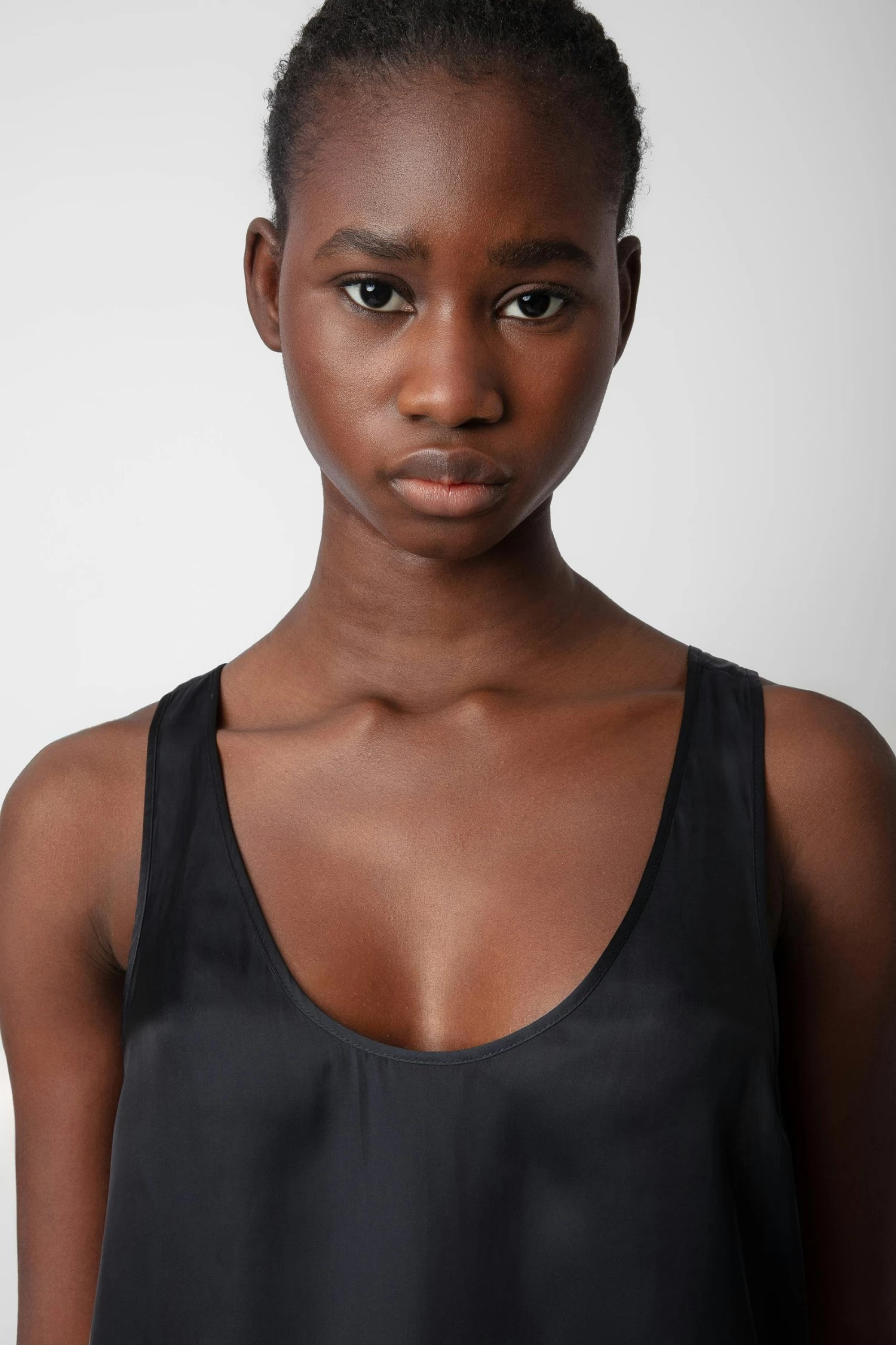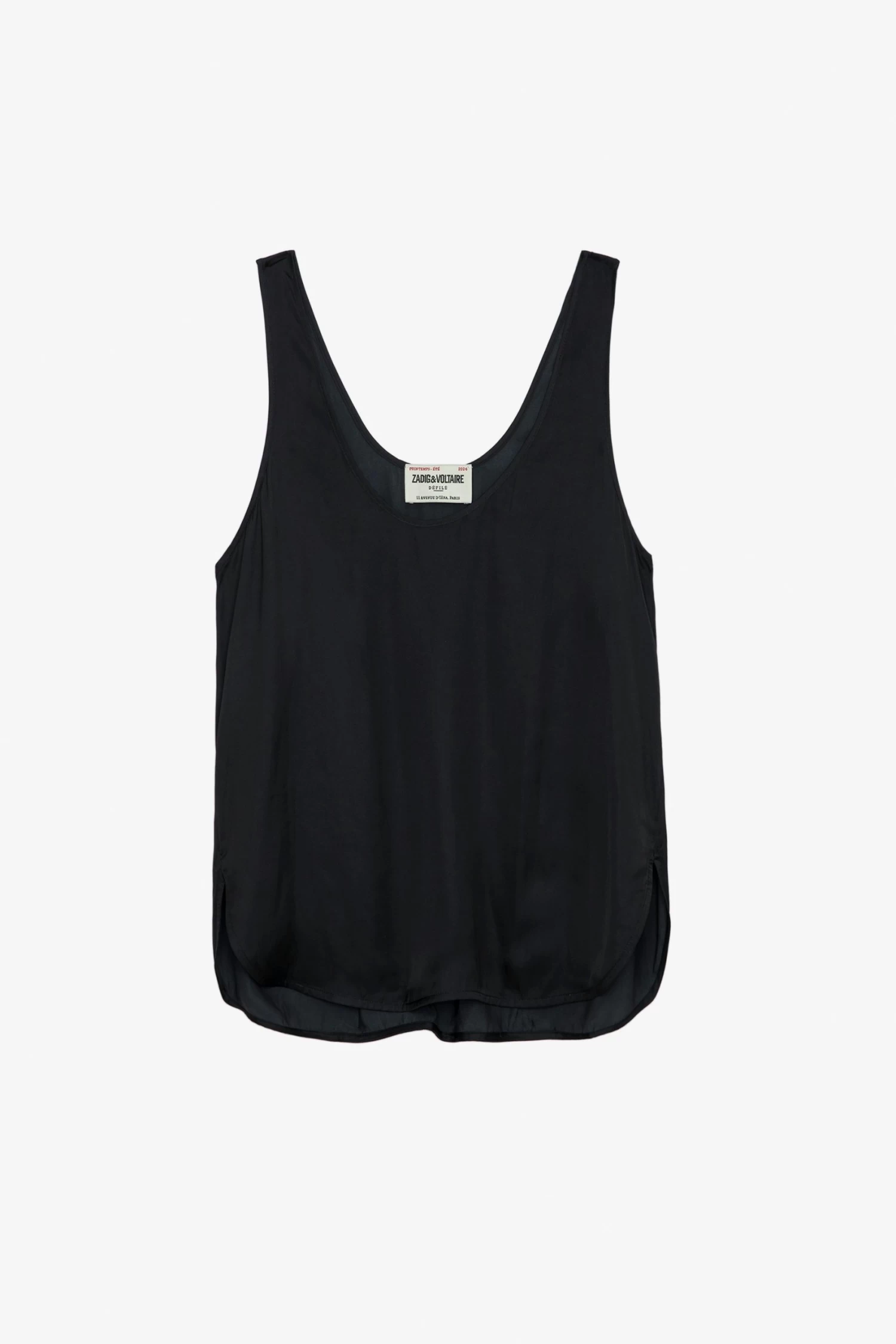 – Women’s black satin flowing top – Round neckline – Cutaway armholes **recycled fibers