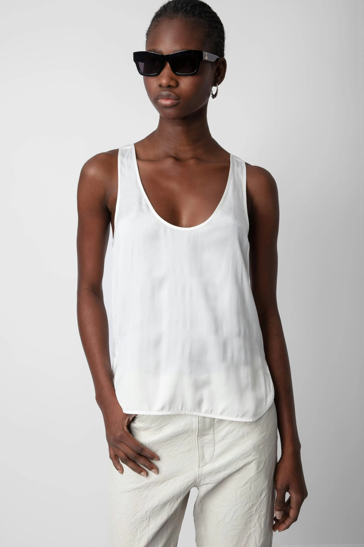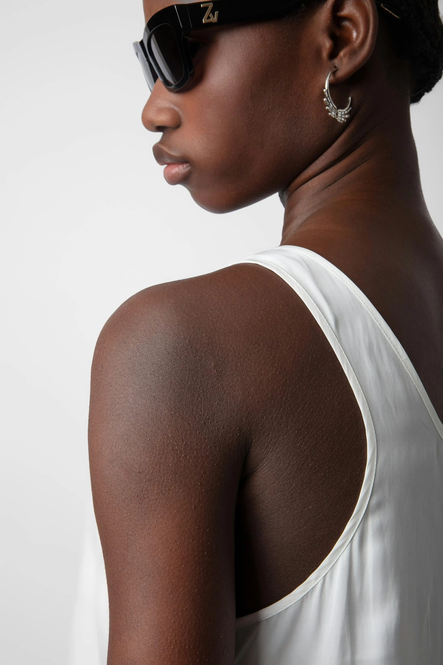 – Women’s Judo white flowing satin top – Round neckline – Cutaway shoulders Model is 177 cm / 5′ 9″ and is wearing a size S**recycled fibers