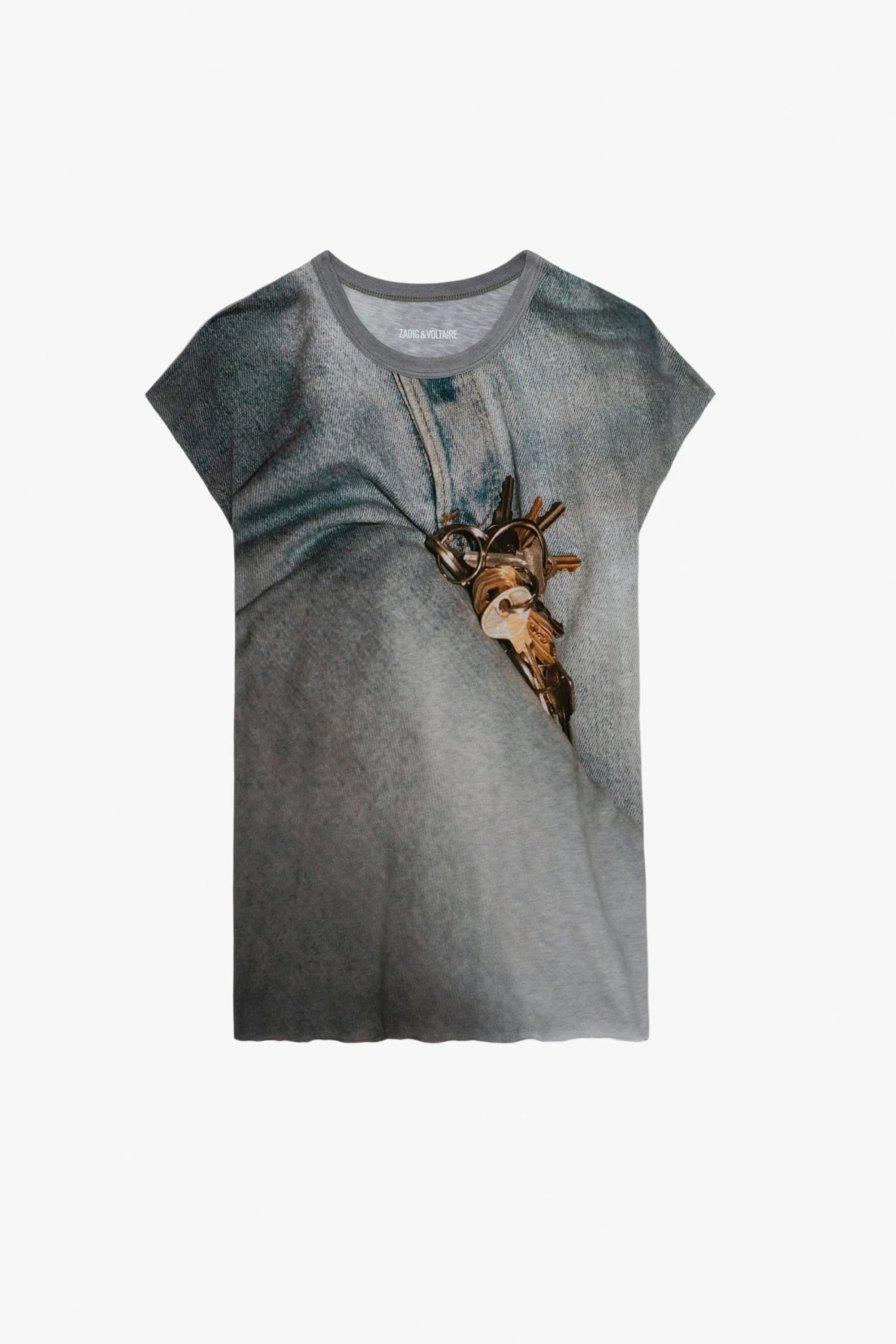 Carbon grey biker-style t-shirt with Key print and raw edges.
