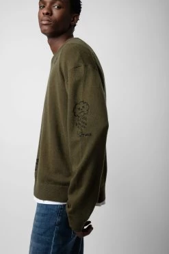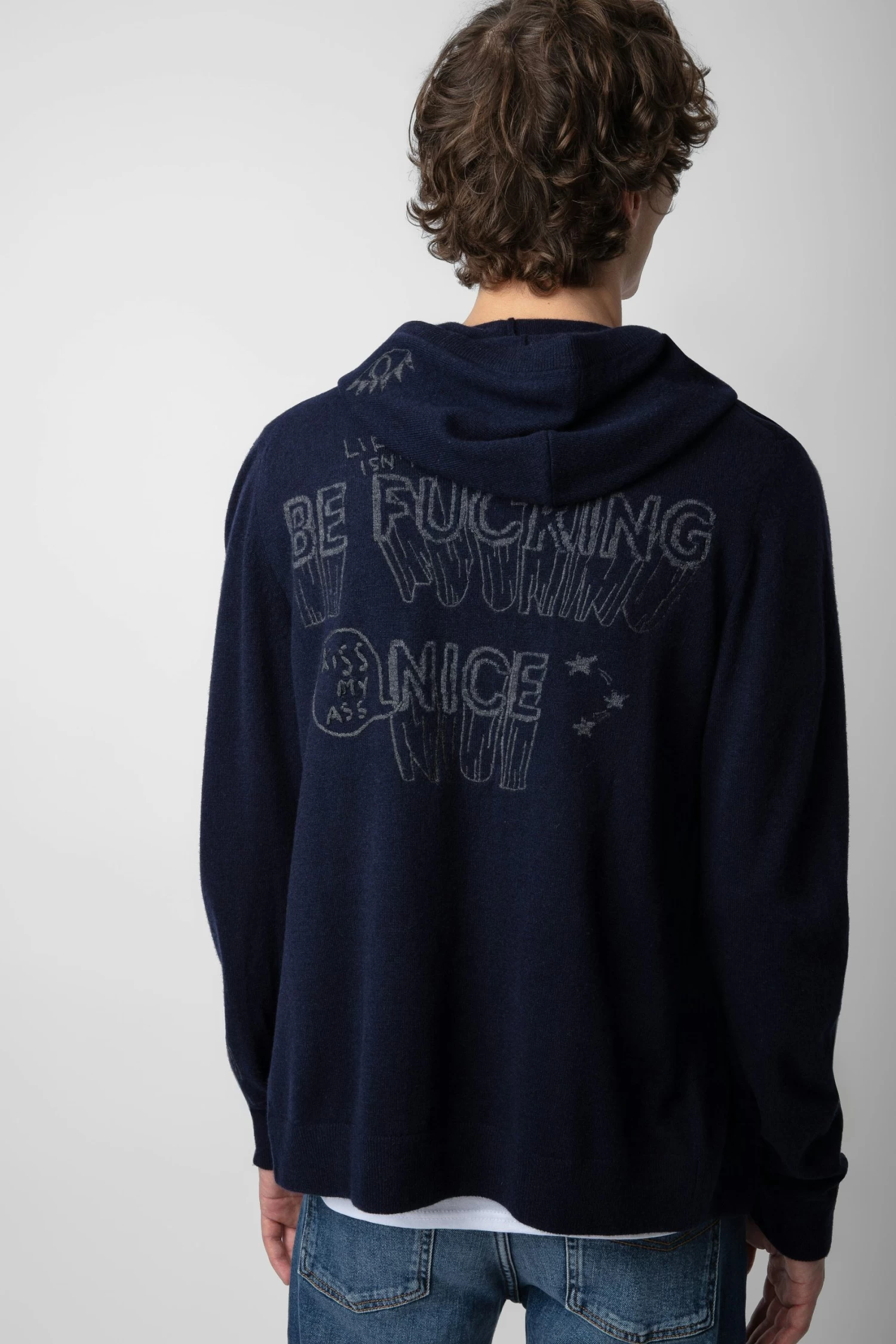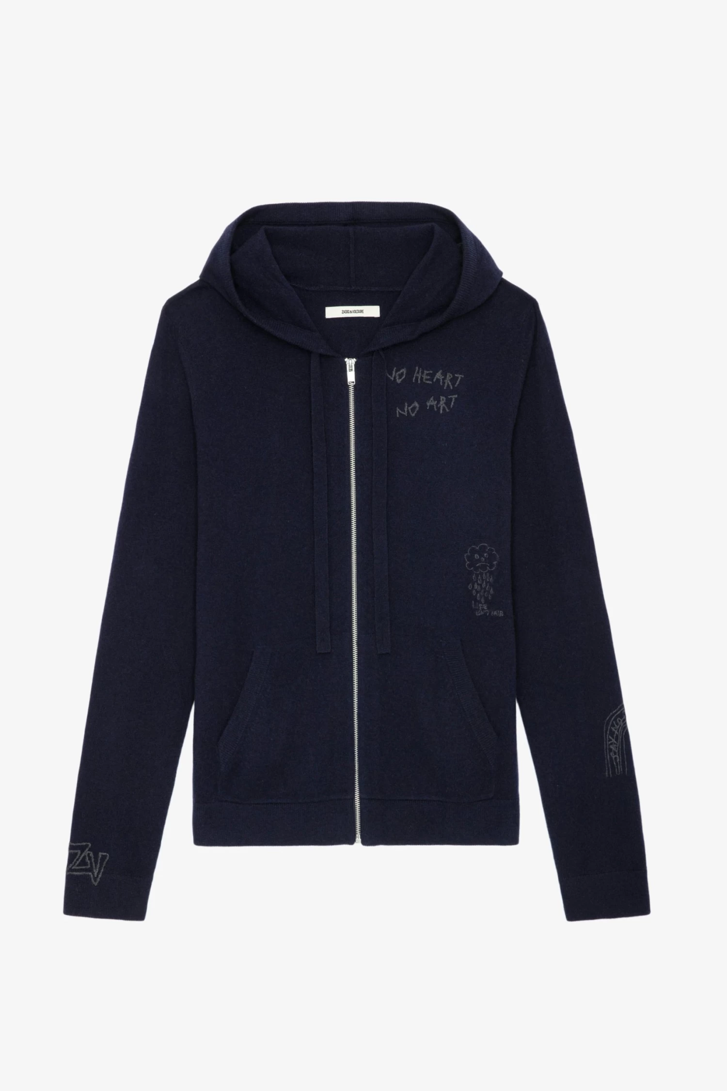 Customized details designed by Humberto Cruz, an artist and illustrator from San Diego. Influenced by pop culture, fashion and colors, he describes his work as spontaneous and quirky. – Men’s Encre navy blue wool and cashmere cardigan – Drawstring hood and zip fastening – Long sleeves and ribbed trim – Two front pockets – Graffiti motifs and “Be Fucking Nice” and “No Heart No Art” slogans Model is 187 cm / 6′ 1″ and is wearing a size M*Contains 70% RWS certified woolThe Responsible Wool Standard (RWS) guarantees animal welfare and respect for pastures. It also ensures end-to-end traceability of the wool through the supply chain