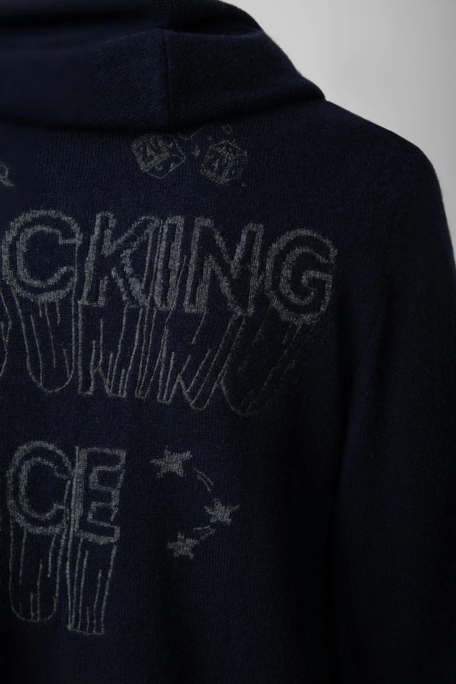 Navy blue wool and cashmere zip-up hooded cardigan with customized details designed by Humberto Cruz.