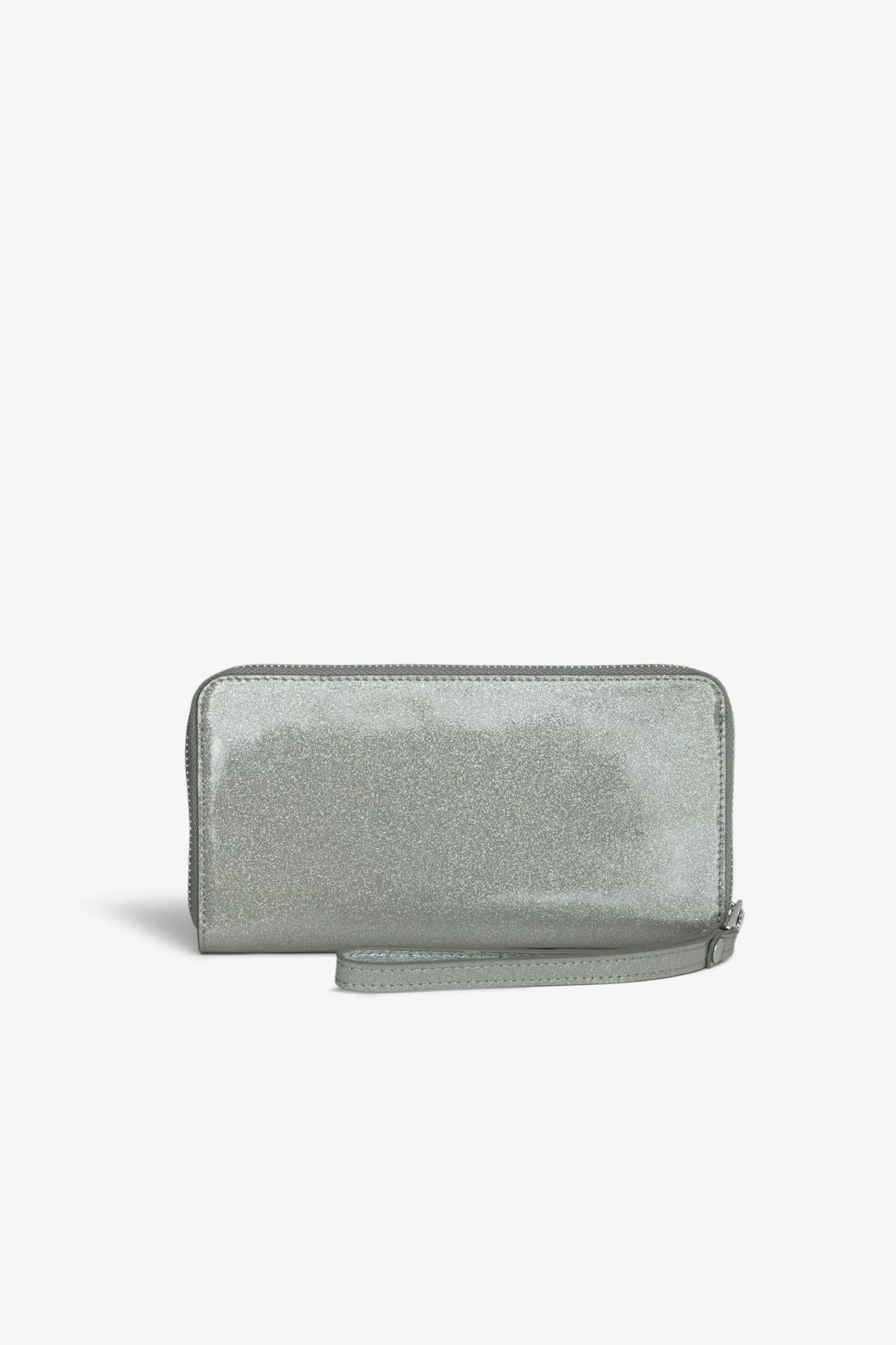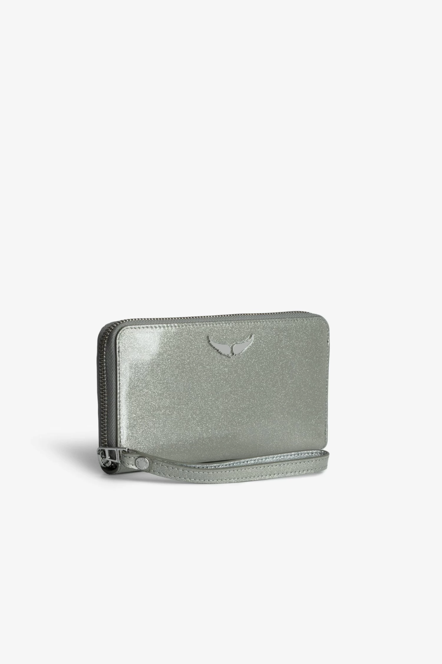 Women’s silver glitter patent leather wallet with wristlet and wings charm.