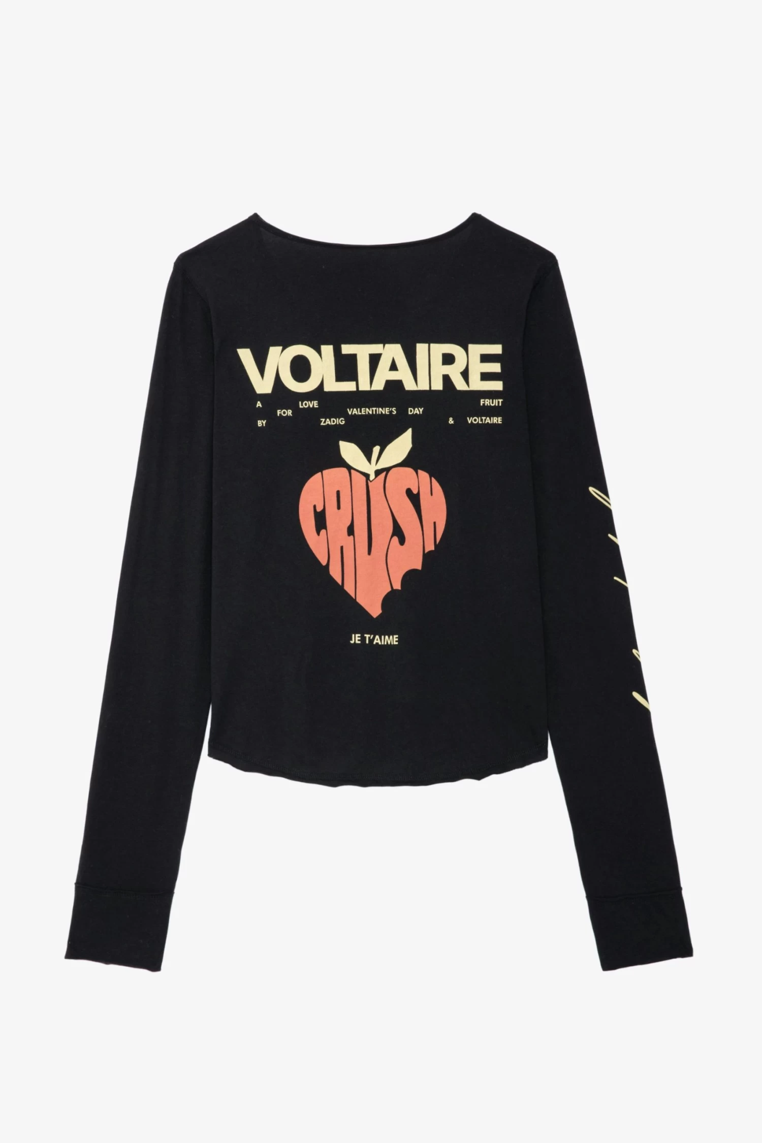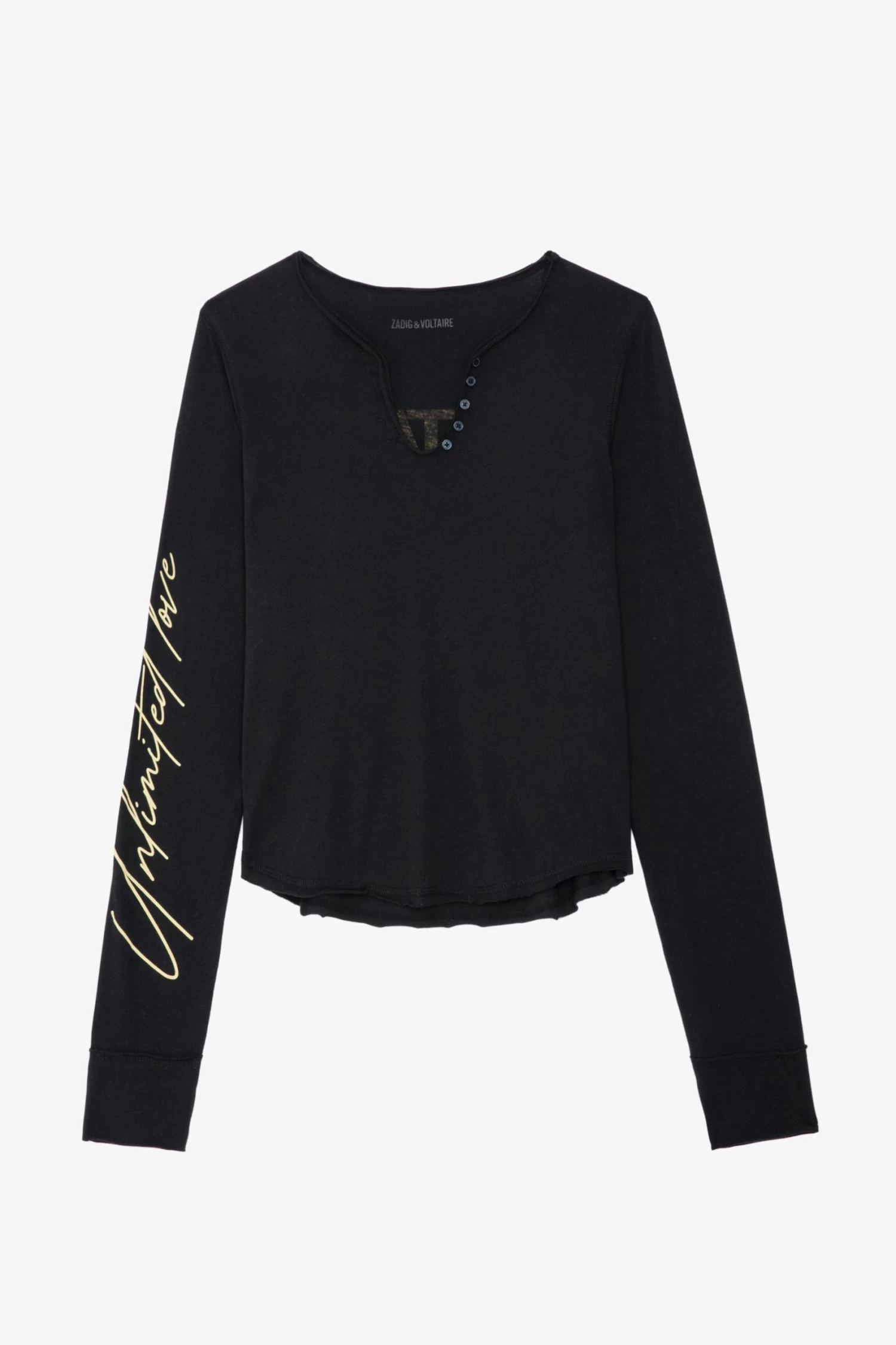 – Women’s black cotton cropped T-shirt – Henley neckline with 5 buttons – Concert and Crush prints on the front and “Unlimited Love” slogan on the right sleeve – Long sleeves Model is 180 cm / 5′ 10″ and is wearing a size S*100% of fibers comes from organic agricultureThe GOTS certification guarantees that this product does not contain GMOs. It also ensures the absence of harmful substances in the product, a social and environmental responsible management and the end-to-end traceability of the supply chain. The dyes are made with GOTS approved inks and colorants, which do not contain toxic heavy metals and do not require aromatic solvents nor harmful substances.