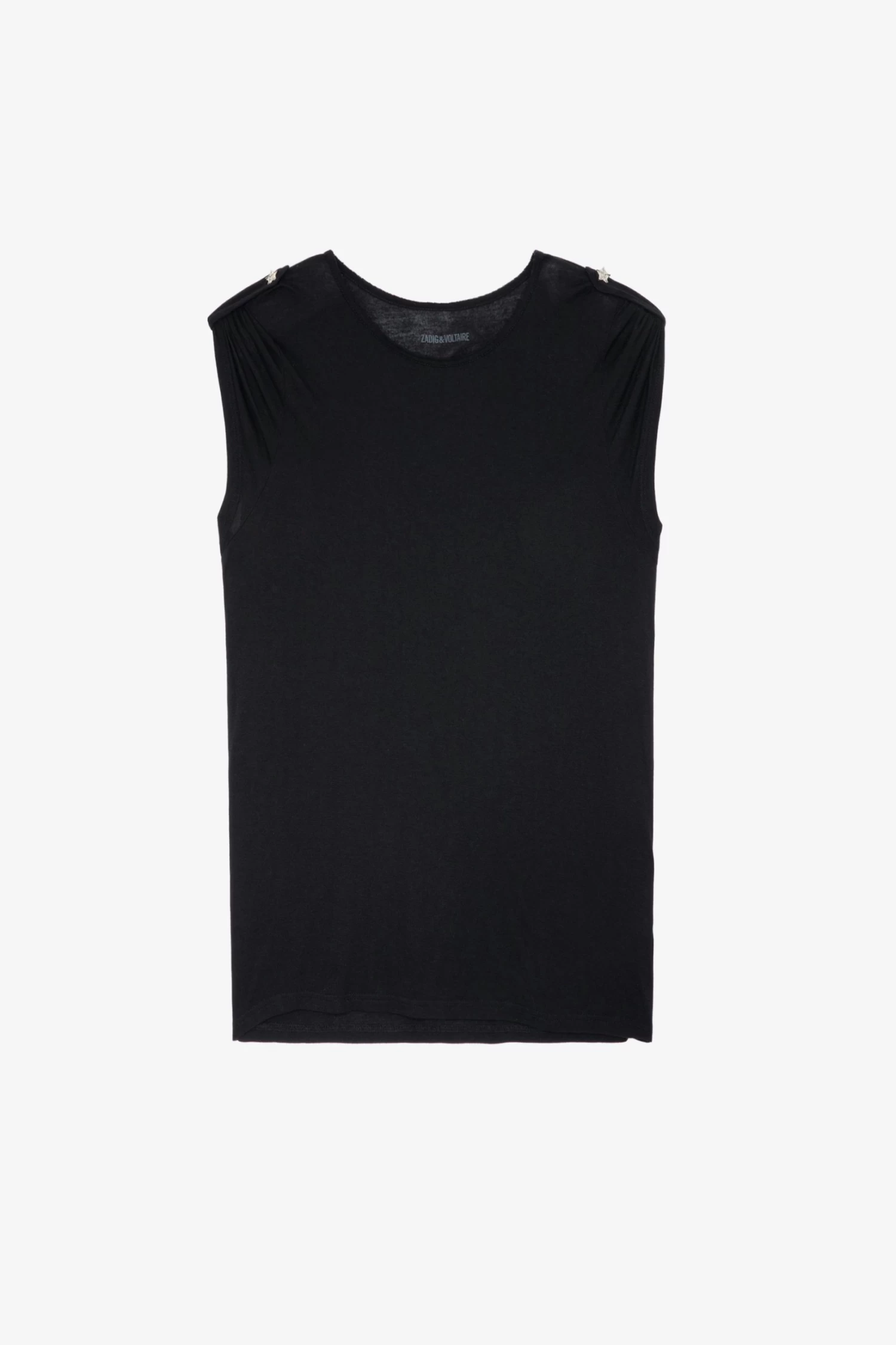 – Women’s black T-shirt – Short sleeves and shoulder plackets with star buttons – Round neck – Made in Portugal Model is 179 cm / 5′ 10″ and is wearing a size S