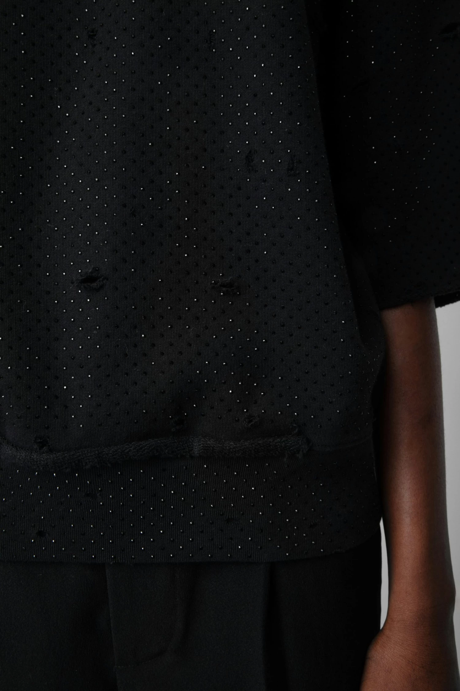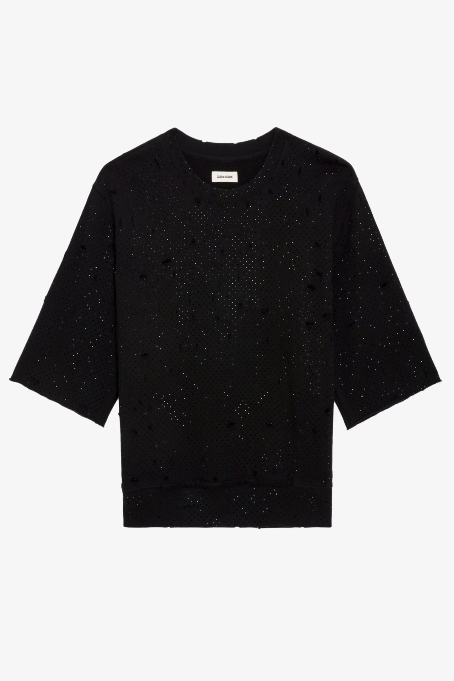 – Women’s black sweatshirt – Short sleeves – All over diamanté – Slight distressing on hemsModel is 174 cm / 5′ 8″ and is wearing a size S*100% of fibers comes from organic agricultureThe GOTS certification guarantees that this product does not contain GMOs. It also ensures the absence of harmful substances in the product, a social and environmental responsible management and the end-to-end traceability of the supply chain. The dyes are made with GOTS approved inks and colorants, which do not contain toxic heavy metals and do not require aromatic solvents nor harmful substances.