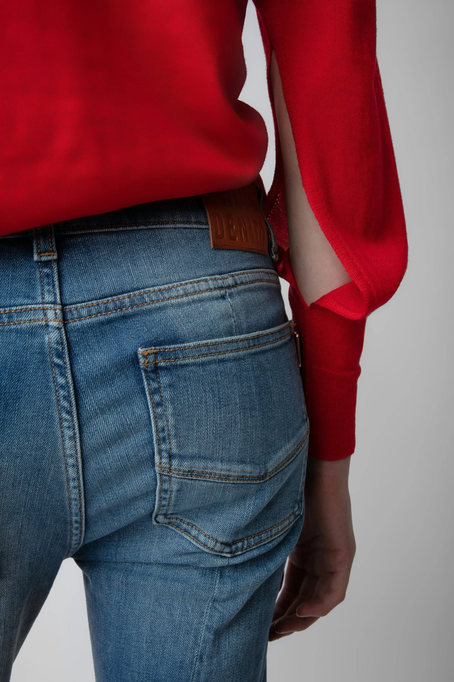 Red merino wool round-neck jumper with long sleeves featuring a cut-out.