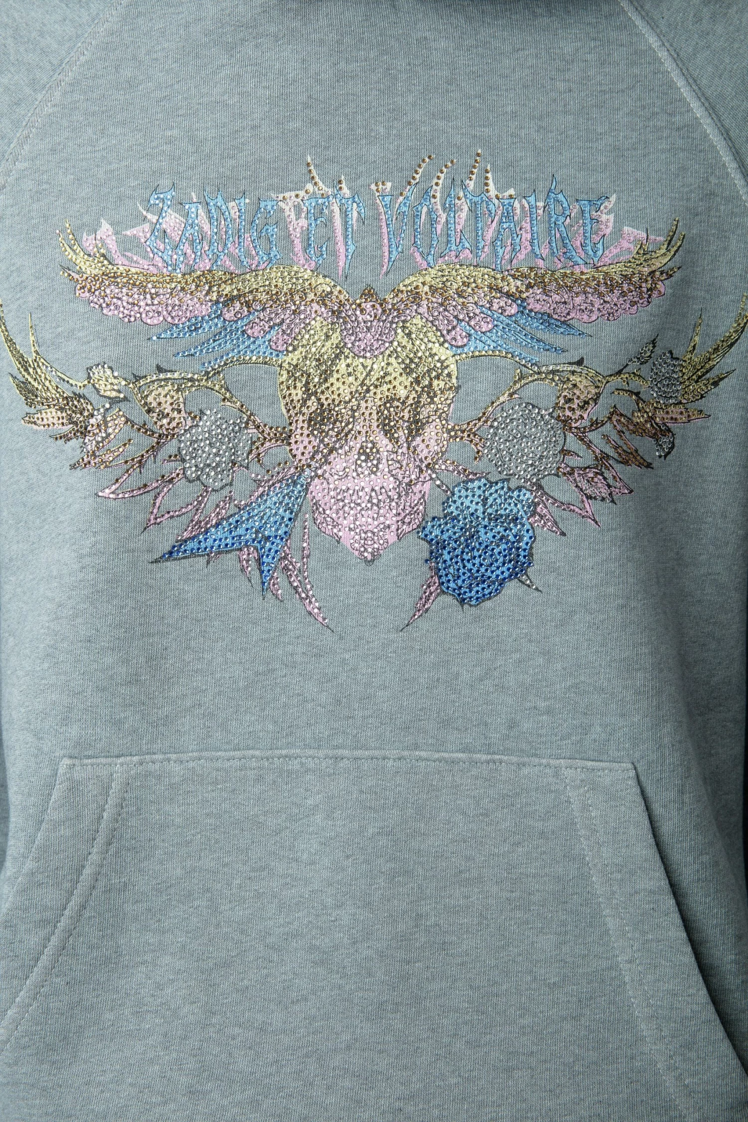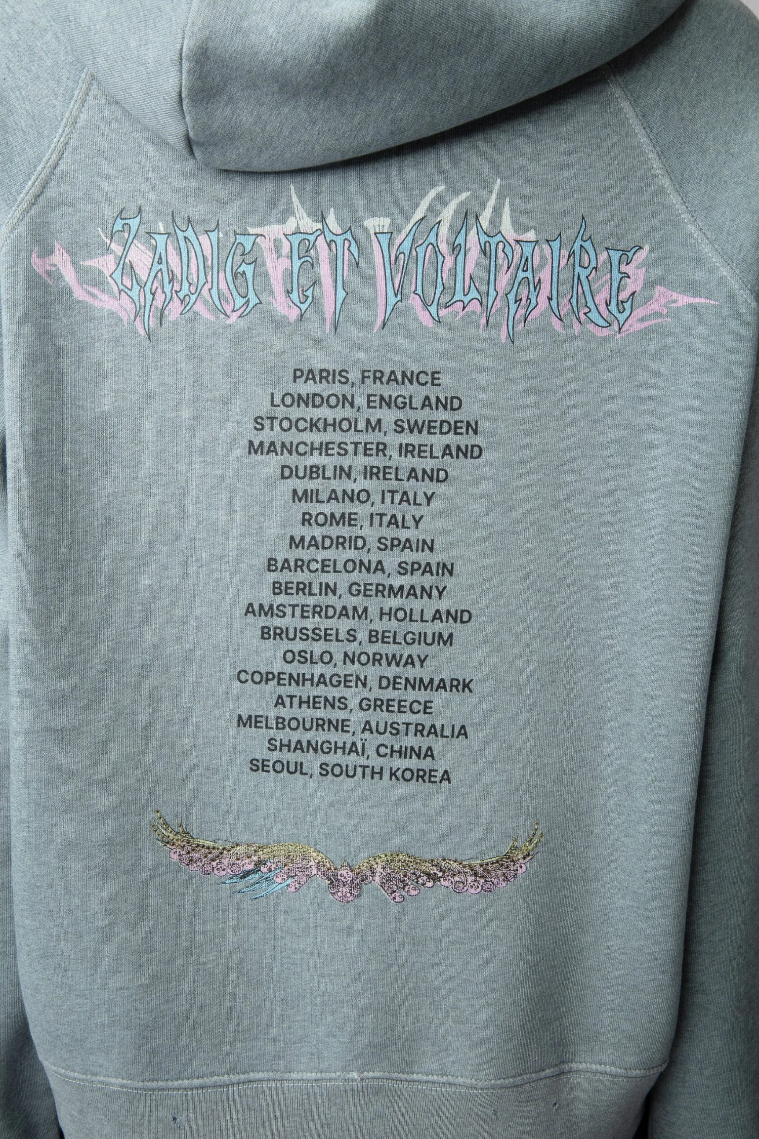 Grey organic cotton hoodie with Concert motifs and diamanté skull and wings.