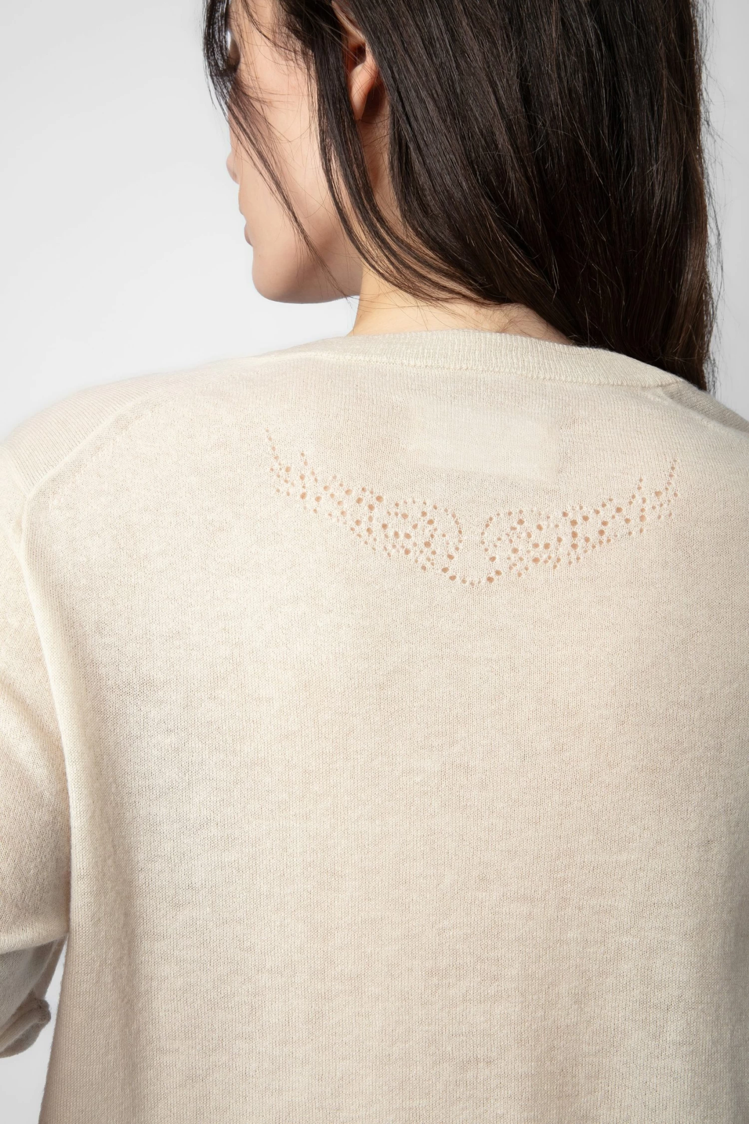 Beige feather cashmere short-sleeved sweater with openwork wings on the back.
