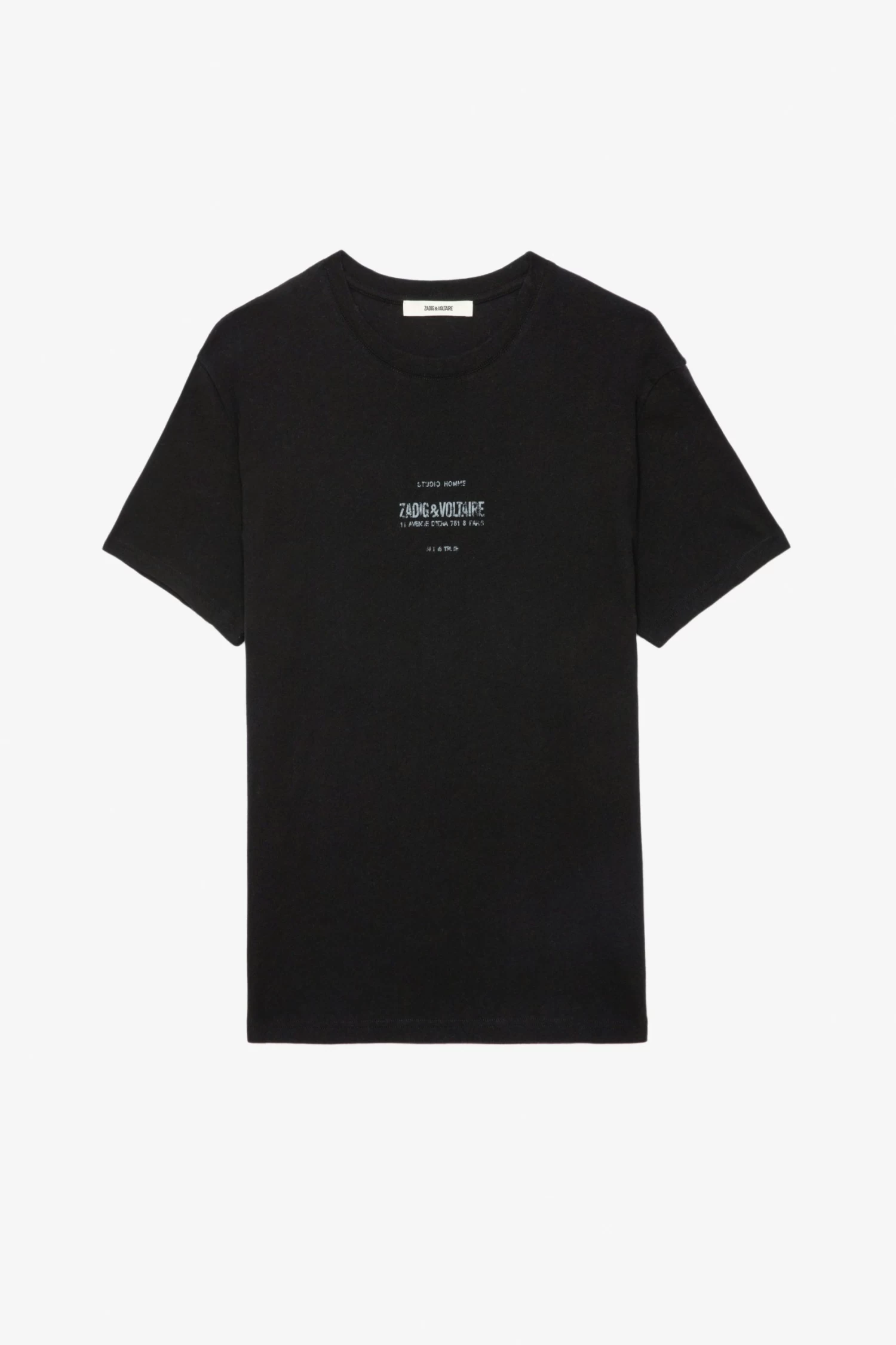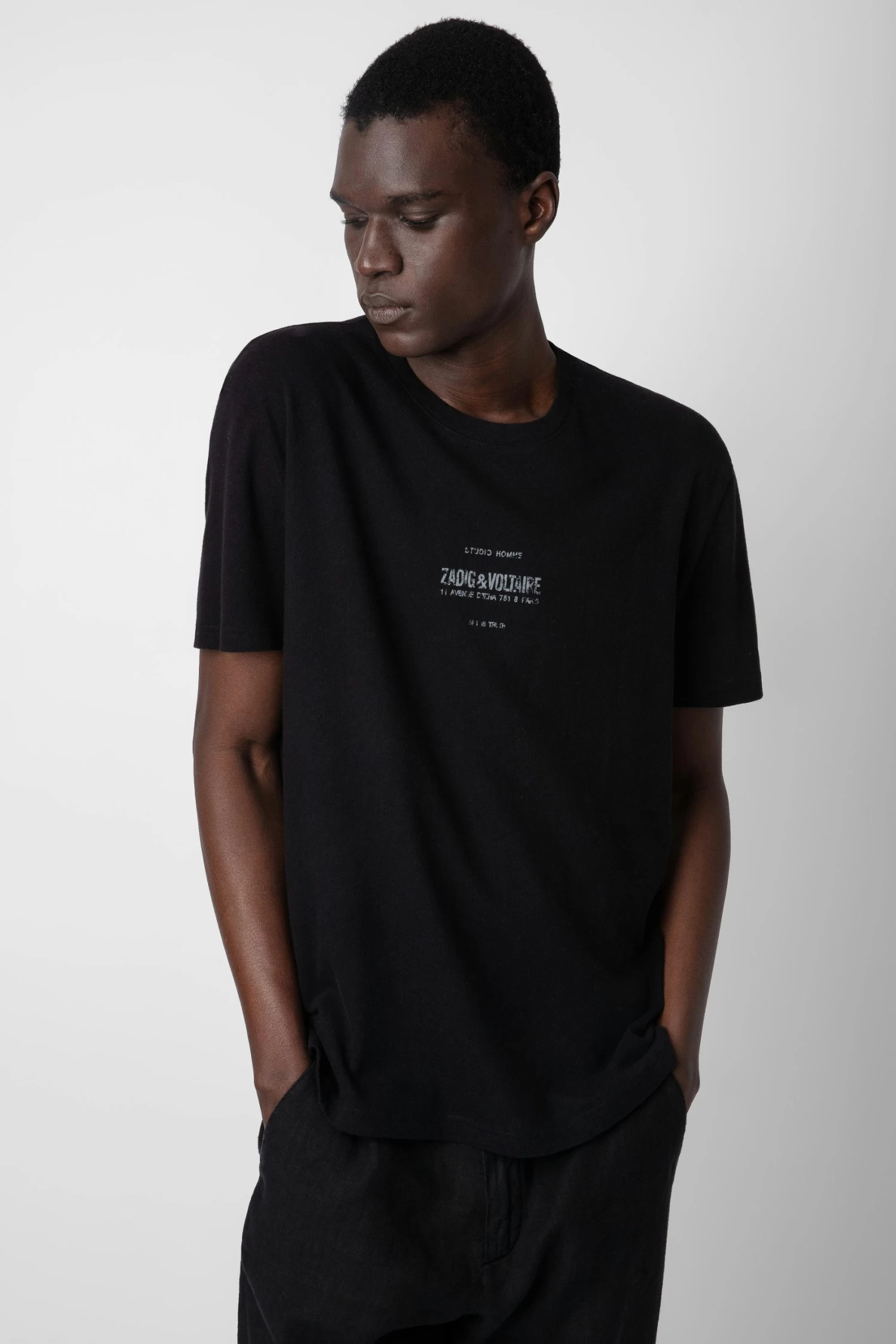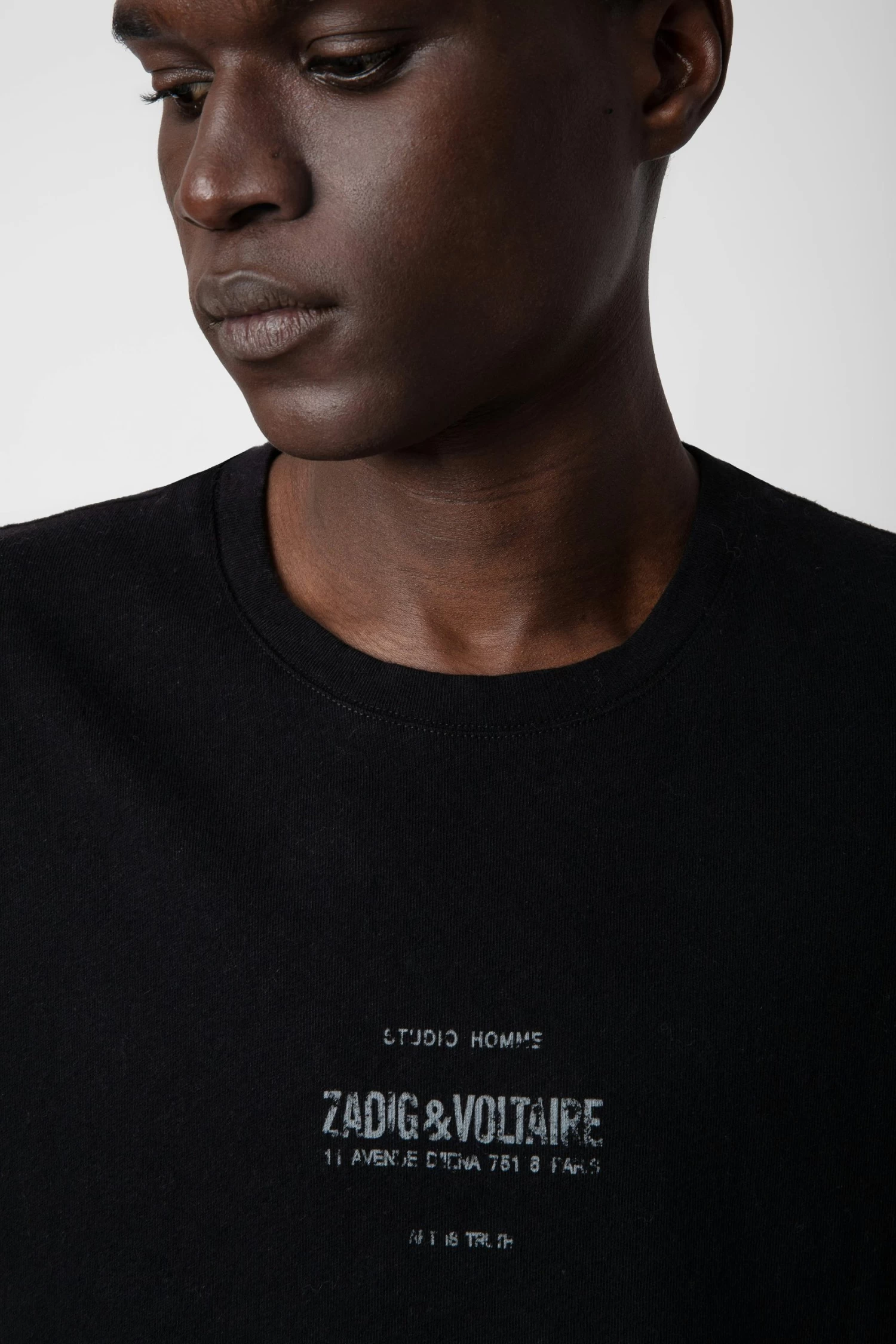 Black washed linen short-sleeved T-shirt with printed Studio Homme insignia.