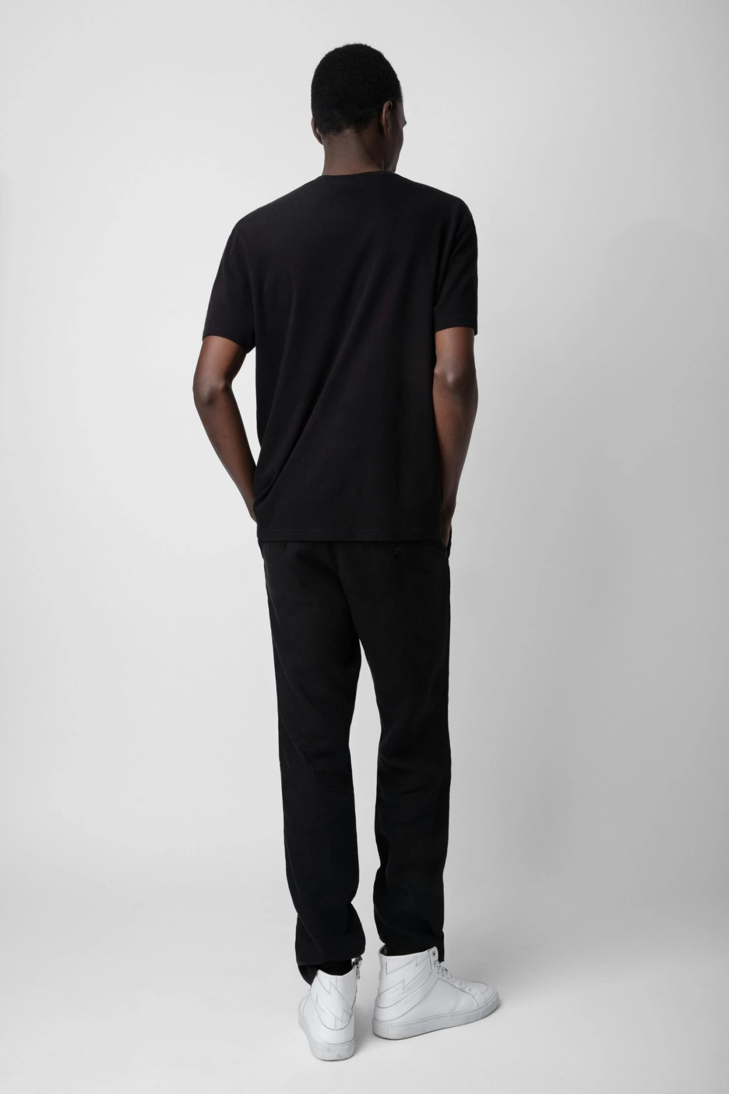 – Men’s black washed linen T-shirt – Distressed-effect printed Studio Homme insignia on the front – Round neckline and short sleeves – Made in Portugal Model is 186 cm / 6′ 1″ and is wearing a size M*70% of fibers comes from organic agricultureThe GOTS certification guarantees that this product does not contain GMOs. It also ensures the absence of harmful substances in the product, a social and environmental responsible management and the end-to-end traceability of the supply chain. The dyes are made with GOTS approved inks and colorants, which do not contain toxic heavy metals and do not require aromatic solvents nor harmful substances.