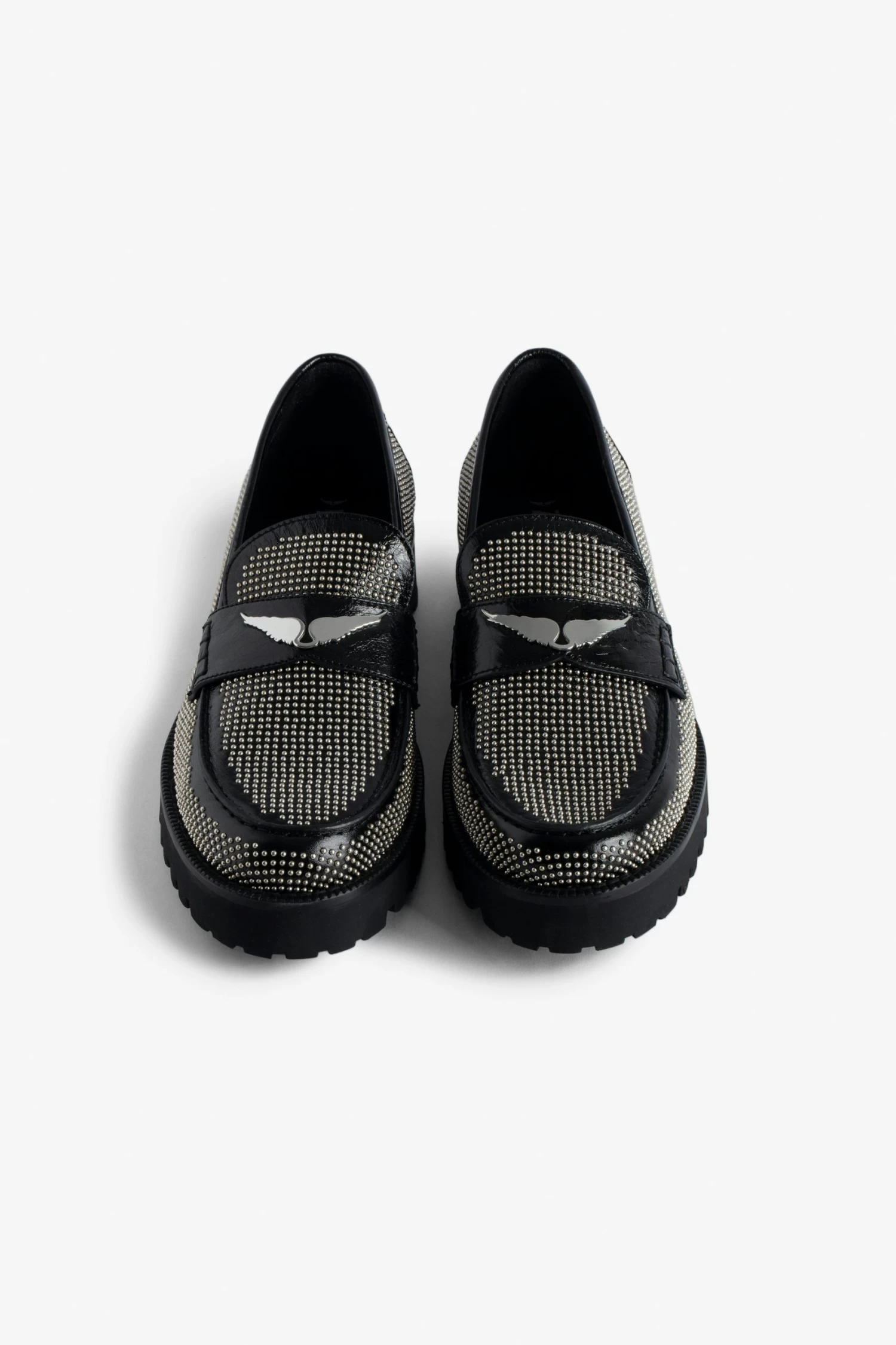 – Women’s black vintage-effect leather loafers – Studs and metal mirror wings charm on tongue – Cleated sole – Heel height: 3.5 cm – Made in Spain The Leather Working Group/LWG is a membership organization comprised of brands, suppliers, leather manufacturers and other stakeholders within the leather manufacturing industry. The group has developed an auditing program which certifies leather manufacturing facilities based on their environmental compliance and performance capabilities