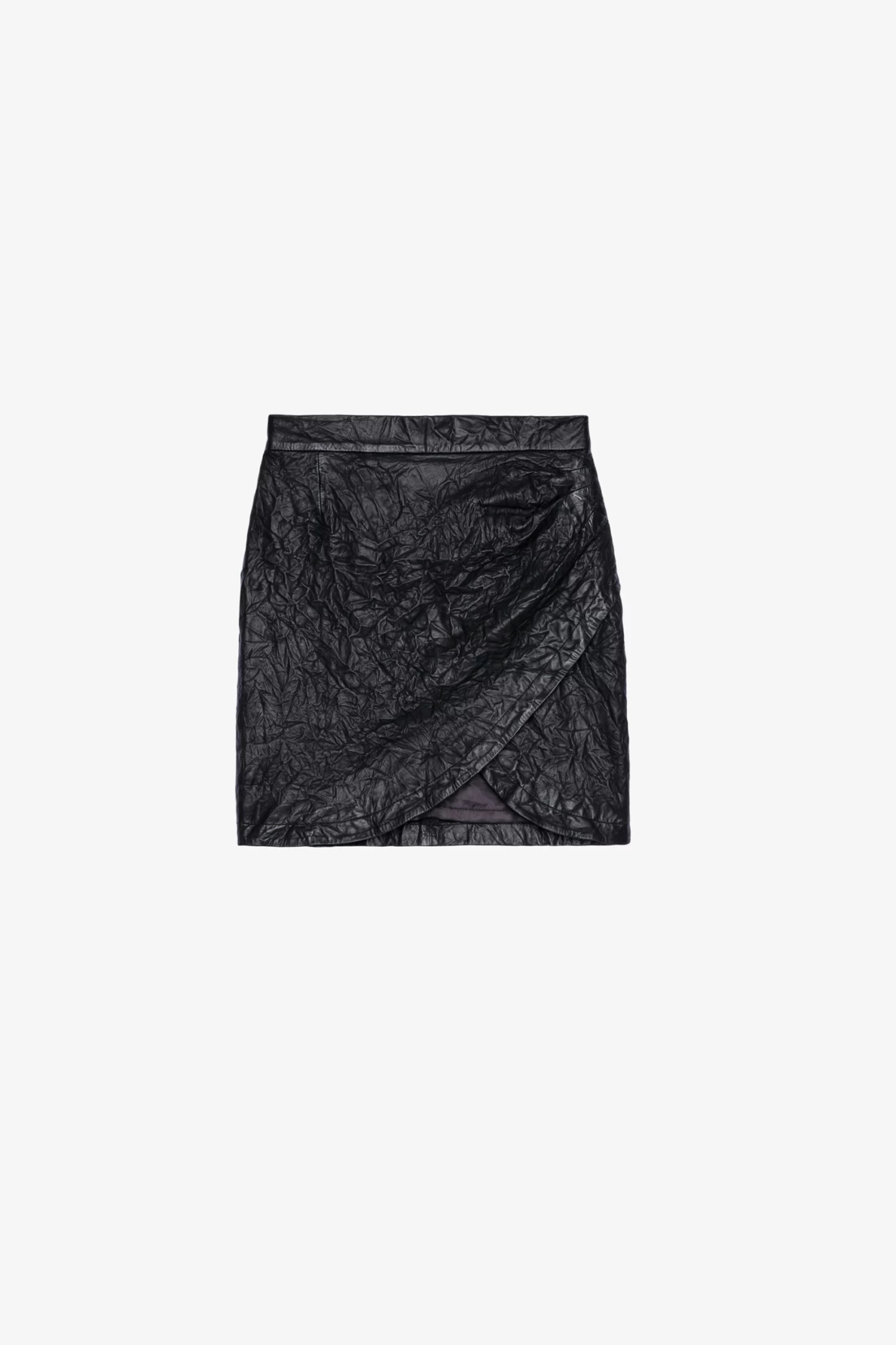 – Women’s short black crinkled leather skirt – Wrap style – Zipped back closure Model is 177 cm / 5′ 9″ and is wearing a size SThe Leather Working Group/LWG is a membership organization comprised of brands, suppliers, leather manufacturers and other stakeholders within the leather manufacturing industry. The group has developed an auditing program which certifies leather manufacturing facilities based on their environmental compliance and performance capabilities