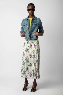 Pale pink long skirt with Soft Bouquet print and button closure.