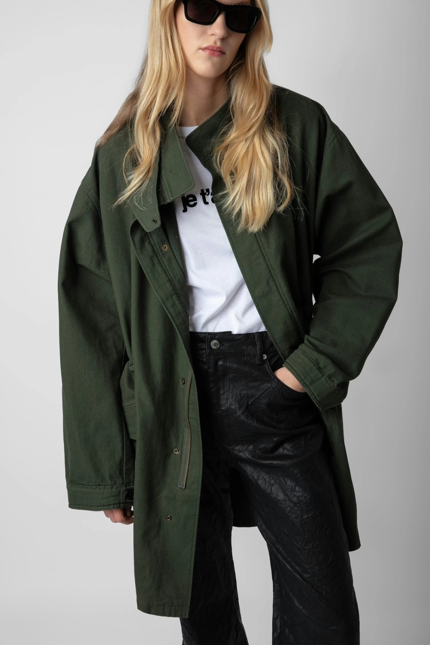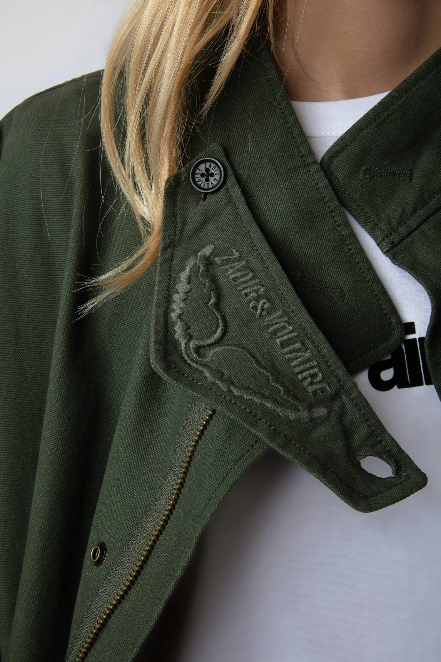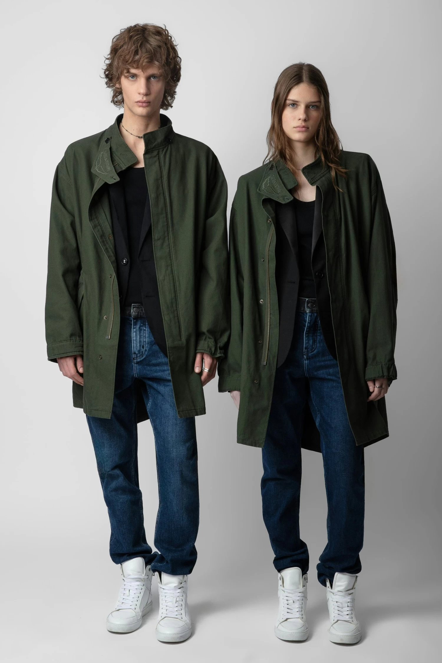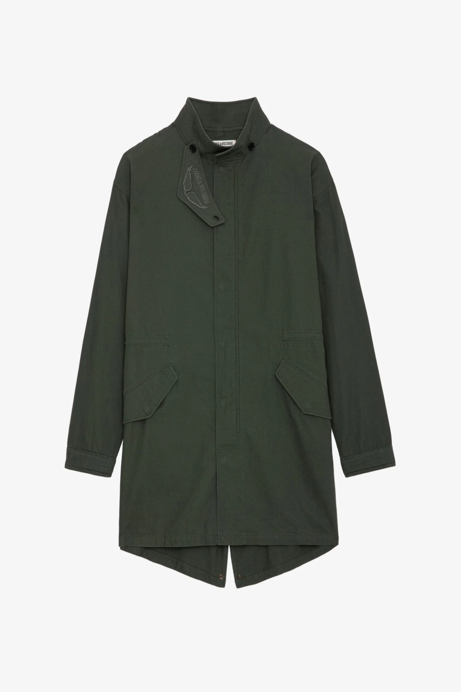 The Bolid jacket is part of the UNISEX collection. A free-spirited wardrobe by Zadig&Voltaire, the UNISEX collection represents the fusion of feminine and masculine features. – Unisex khaki cotton oversized midi parka – Mock neck with removable protection decorated with logo embroidery and wings – Vent at the back and zip and snap button fastening – 2 flap pockets – Long sleeves and buttoned cuffs Model is 180 cm / 5′ 10″ and is wearing a size S**Fibers from organic farming