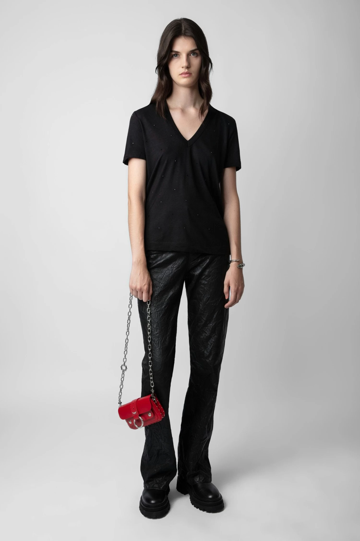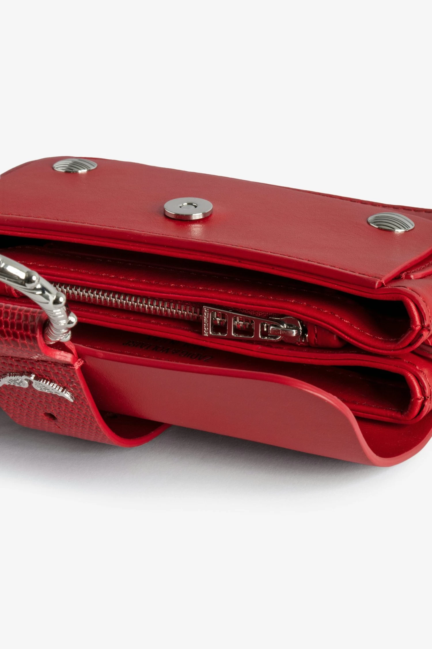 – Women’s Kate Wallet bag in Power red smooth leather – Black cotton lining – Metal ring with “Kate Loves Zadig&Voltaire” engraving and studded trim – Removable metal chain – Flap with magnetic closure – Two compartments separated by a zipped pocket – Carry by hand, over the shoulder or across the body using the iguana-embossed leather loop – Made in Italy The Leather Working Group/LWG is a membership organization comprised of brands, suppliers, leather manufacturers and other stakeholders within the leather manufacturing industry. The group has developed an auditing program which certifies leather manufacturing facilities based on their environmental compliance and performance capabilities