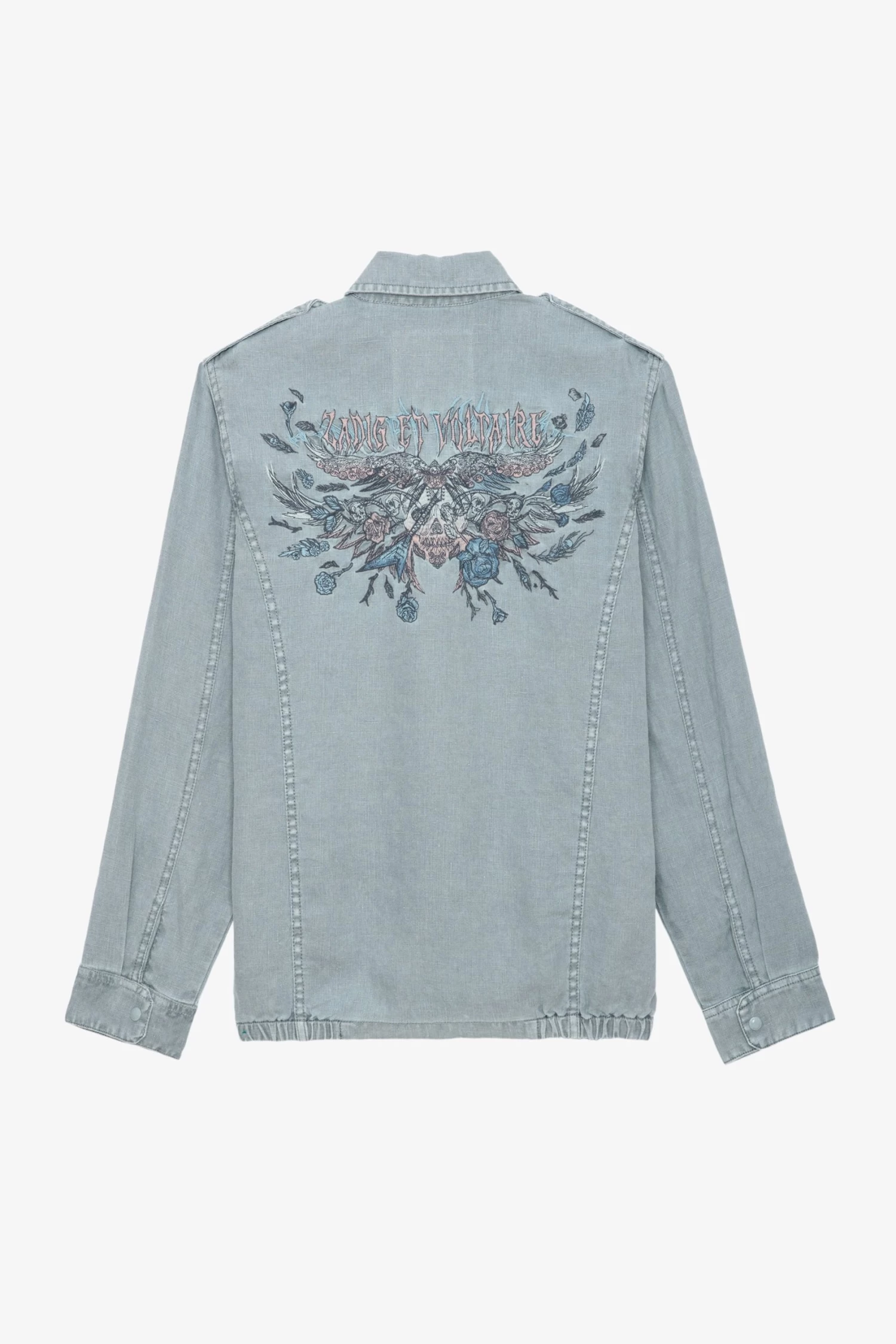 Light blue linen military jacket with pockets and wings and skull motif on the back.
