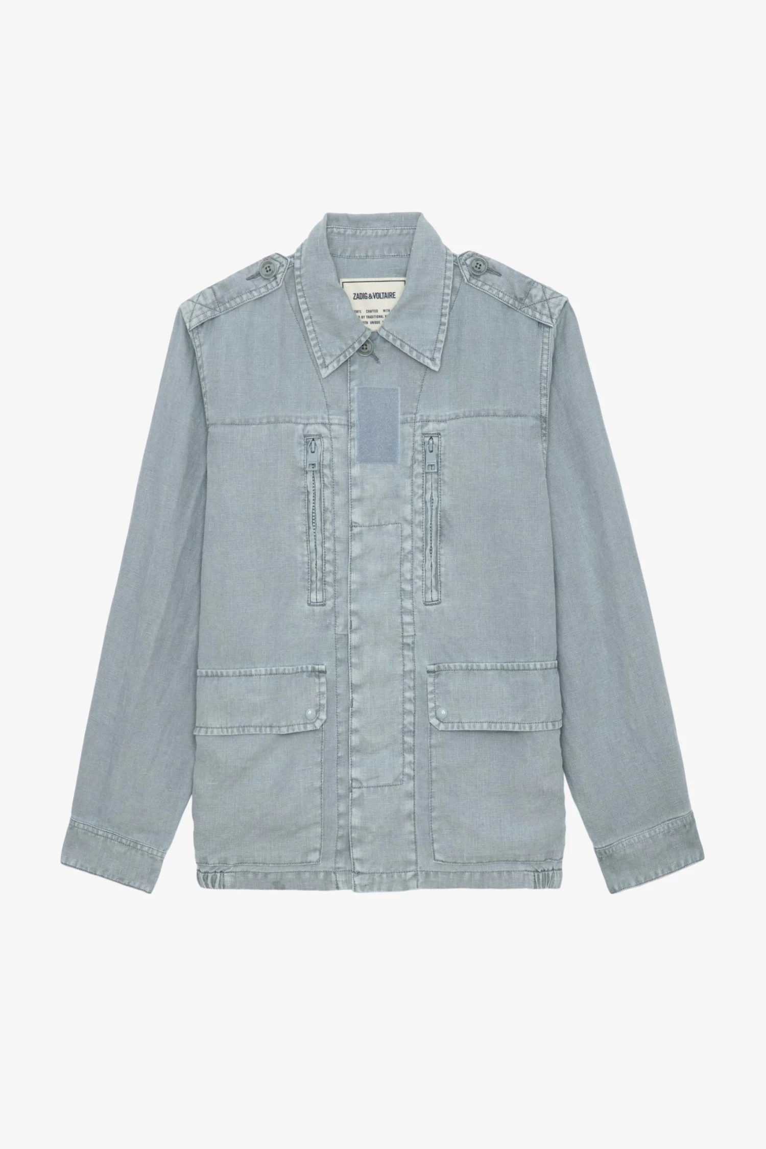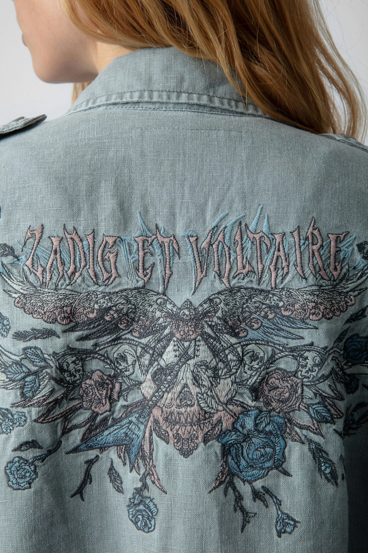 – Women’s Glacier sky blue linen military jacket – Contrasting panel and wings and skull motif on the back – Shirt collar, button closure and buttoned shoulder tabs – 2 zip pockets and 2 flap pockets with press studs – Long sleeves and press stud cuffs Model is 178 cm / 5′ 10″ and is wearing a size S