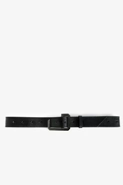 Adjustable black vegetable-tanned leather belt with C buckle.