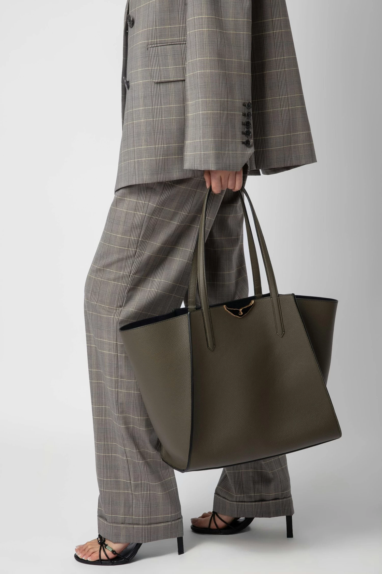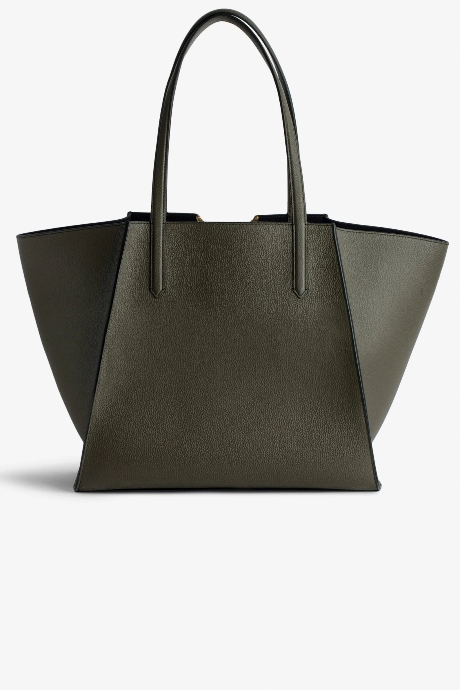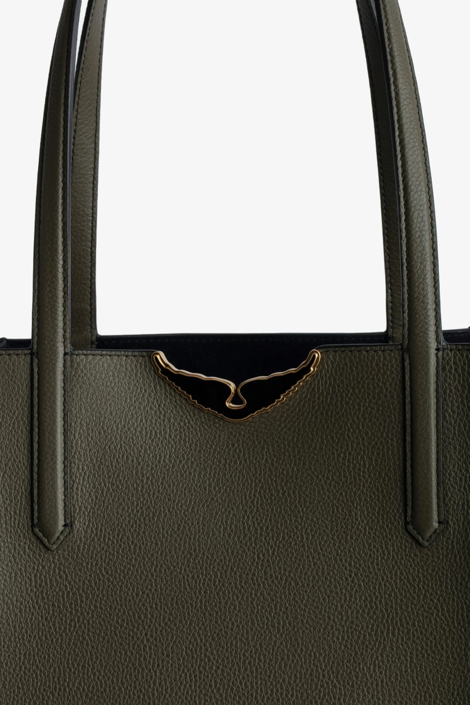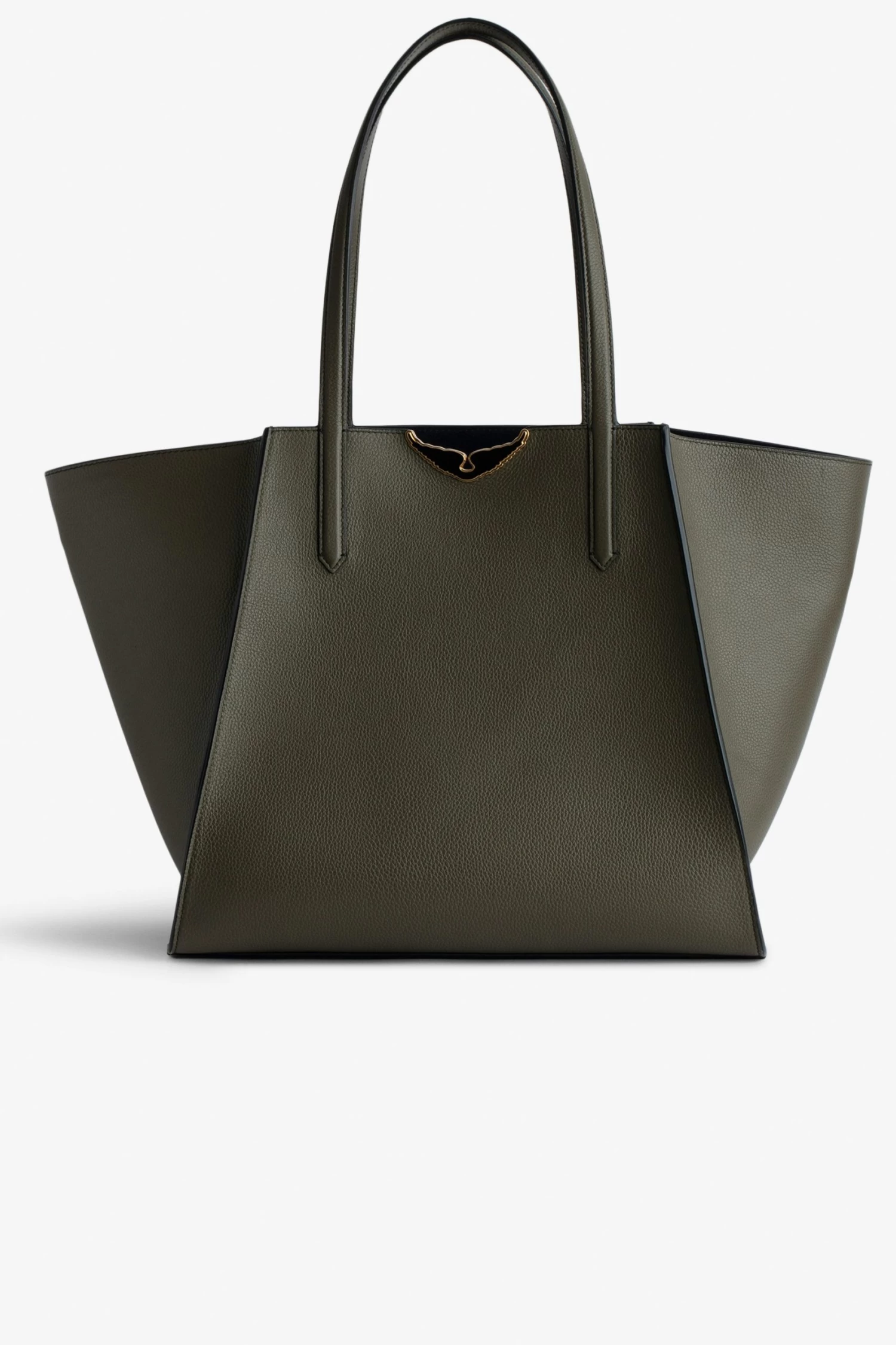 – Le Borderline khaki grained Italian cowhide from an LWG-certified tannery, with navy blue suede lining.r – Black lacquered gold-tone metal wingsr – Leather handlesr – Inside zip pocketr – This reversible style can be used inside out occasionally. We recommend waterproofing the suede before using it for the first timeThe Leather Working Group/LWG is a membership organization comprised of brands, suppliers, leather manufacturers and other stakeholders within the leather manufacturing industry. The group has developed an auditing program which certifies leather manufacturing facilities based on their environmental compliance and performance capabilities