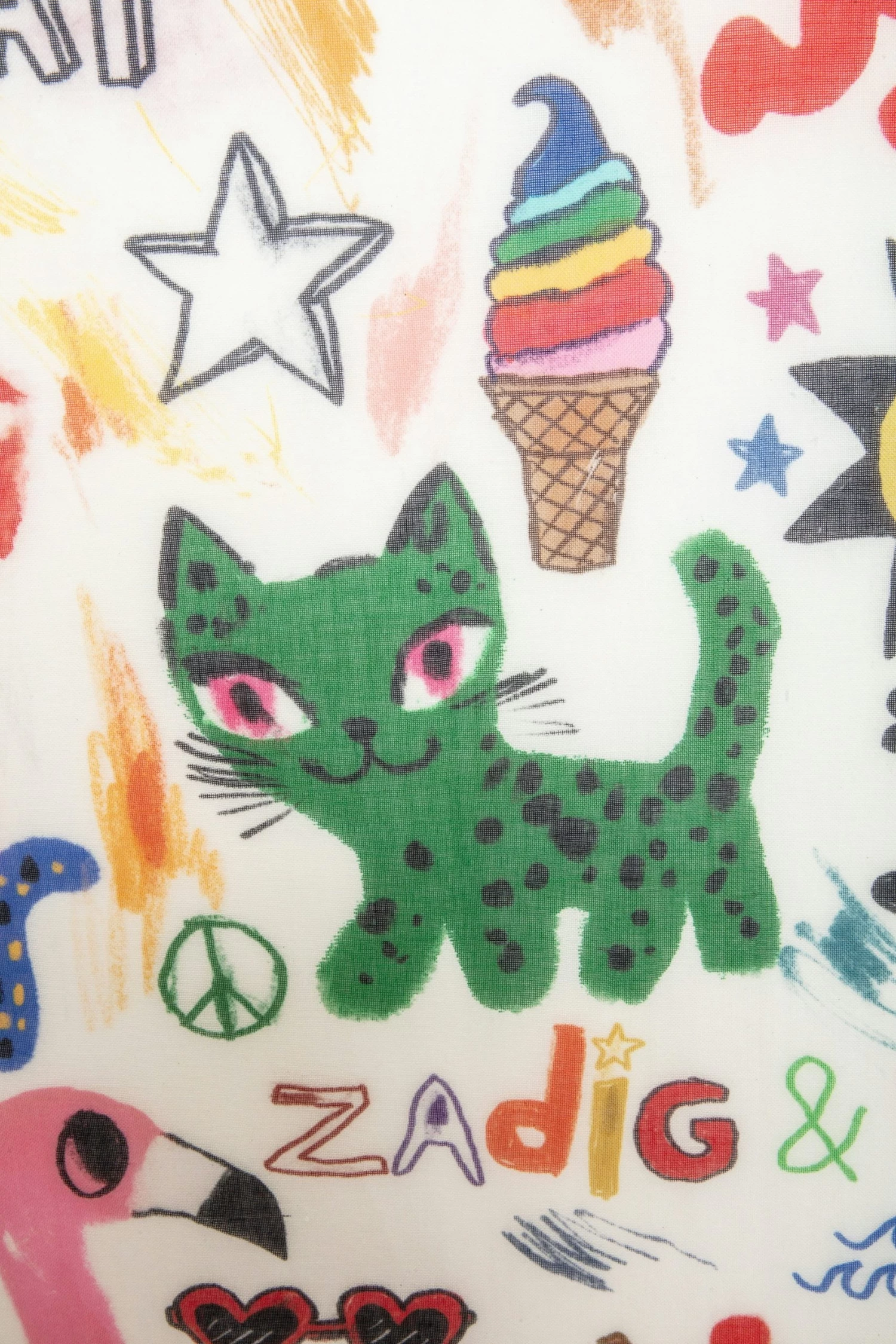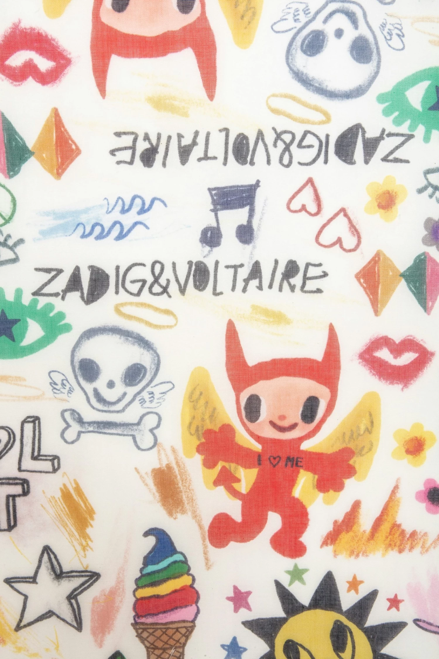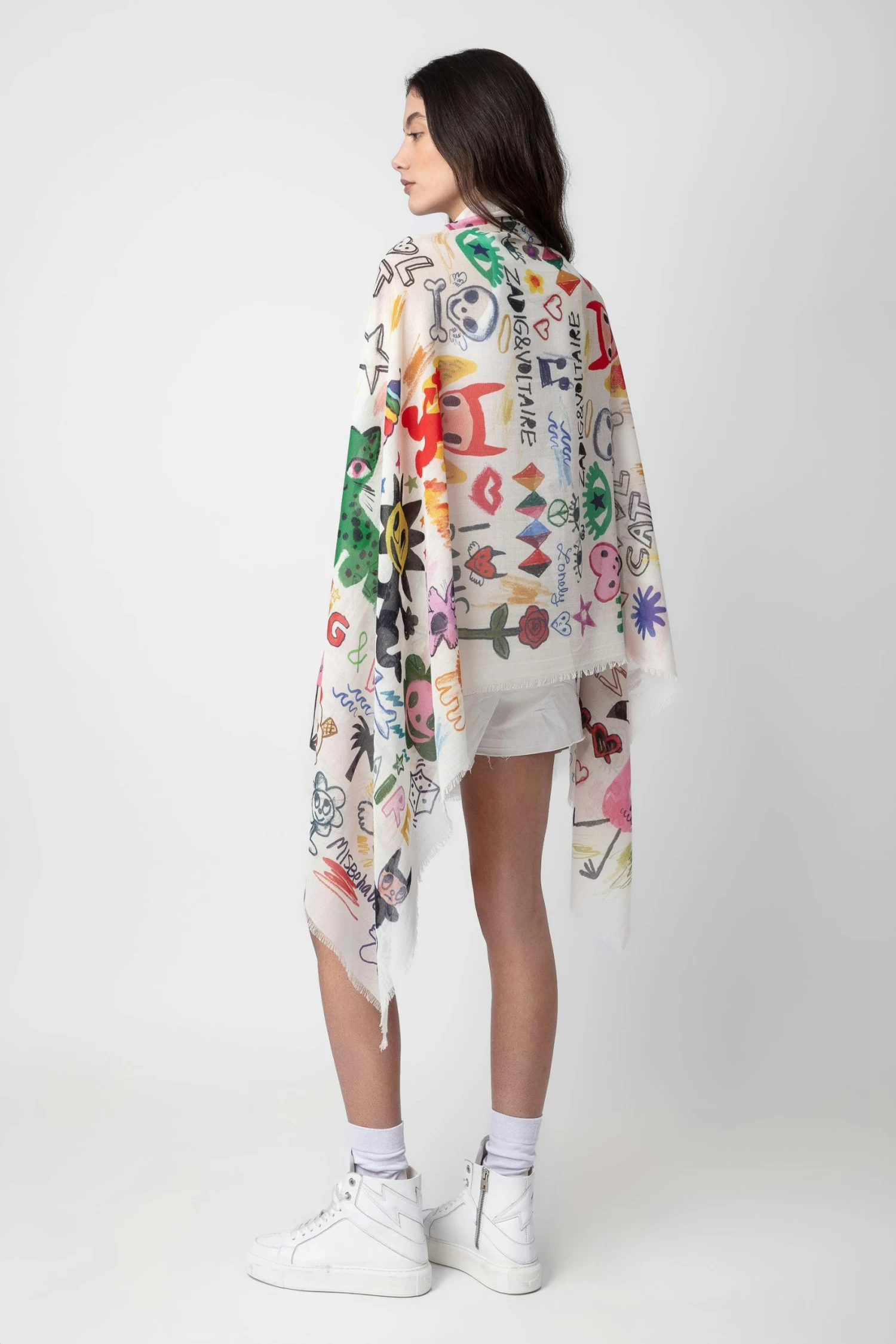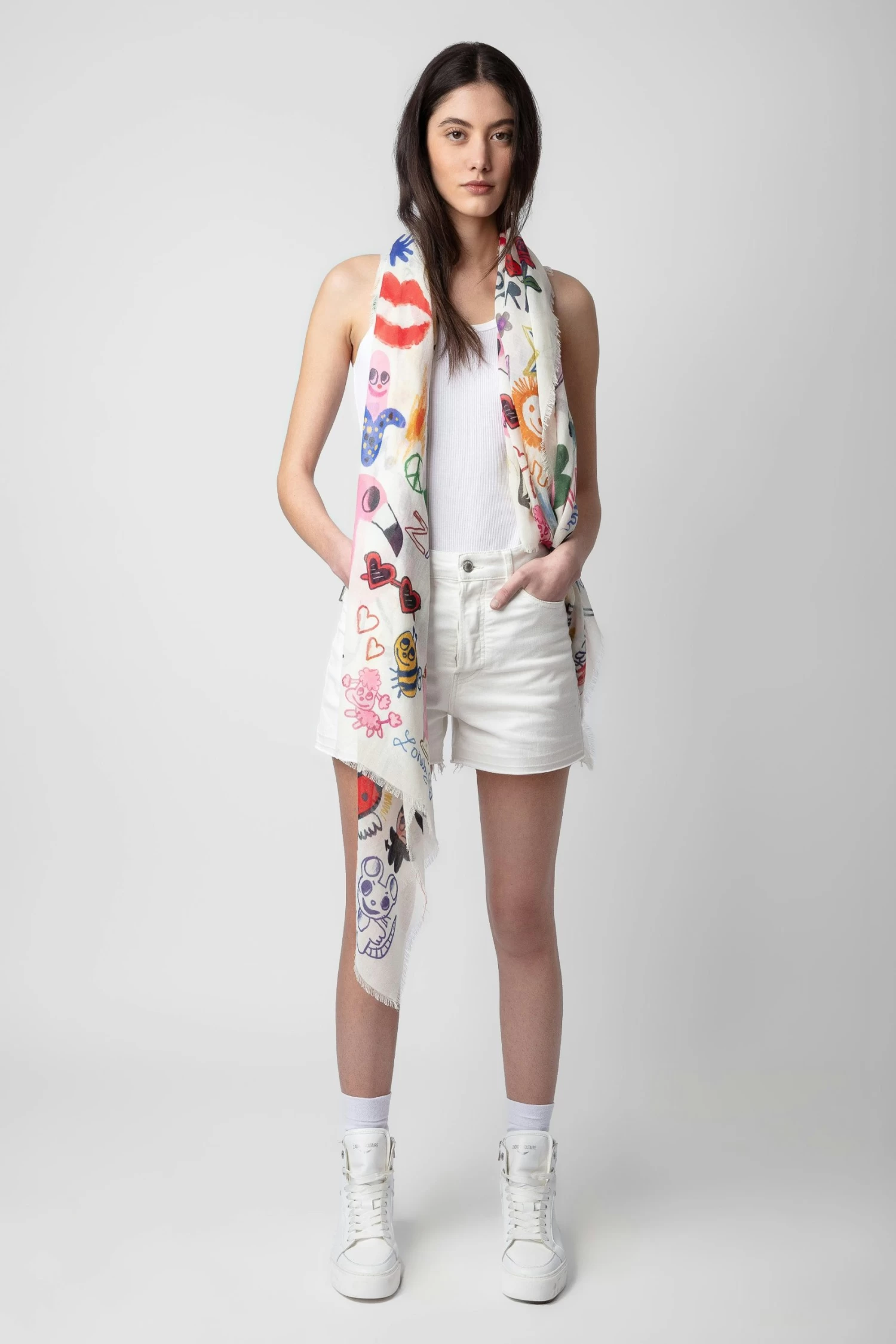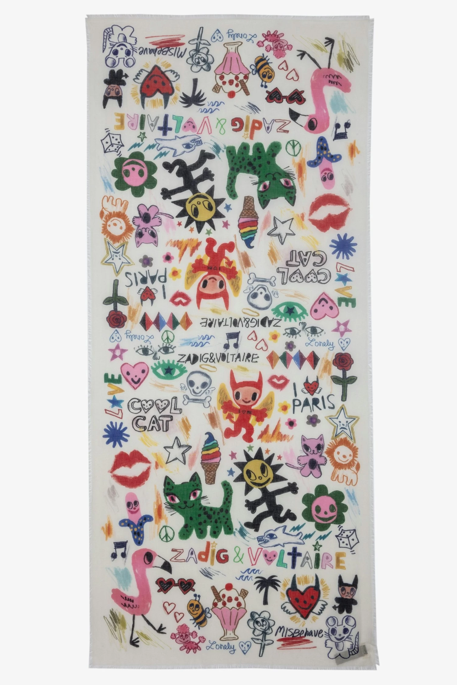 Customized details designed by Humberto Cruz, an artist and illustrator from San Diego. Influenced by pop culture, fashion and colors, he describes his work as spontaneous and quirky. – Women’s Flash ecru cotton long scarf – Fringed trim