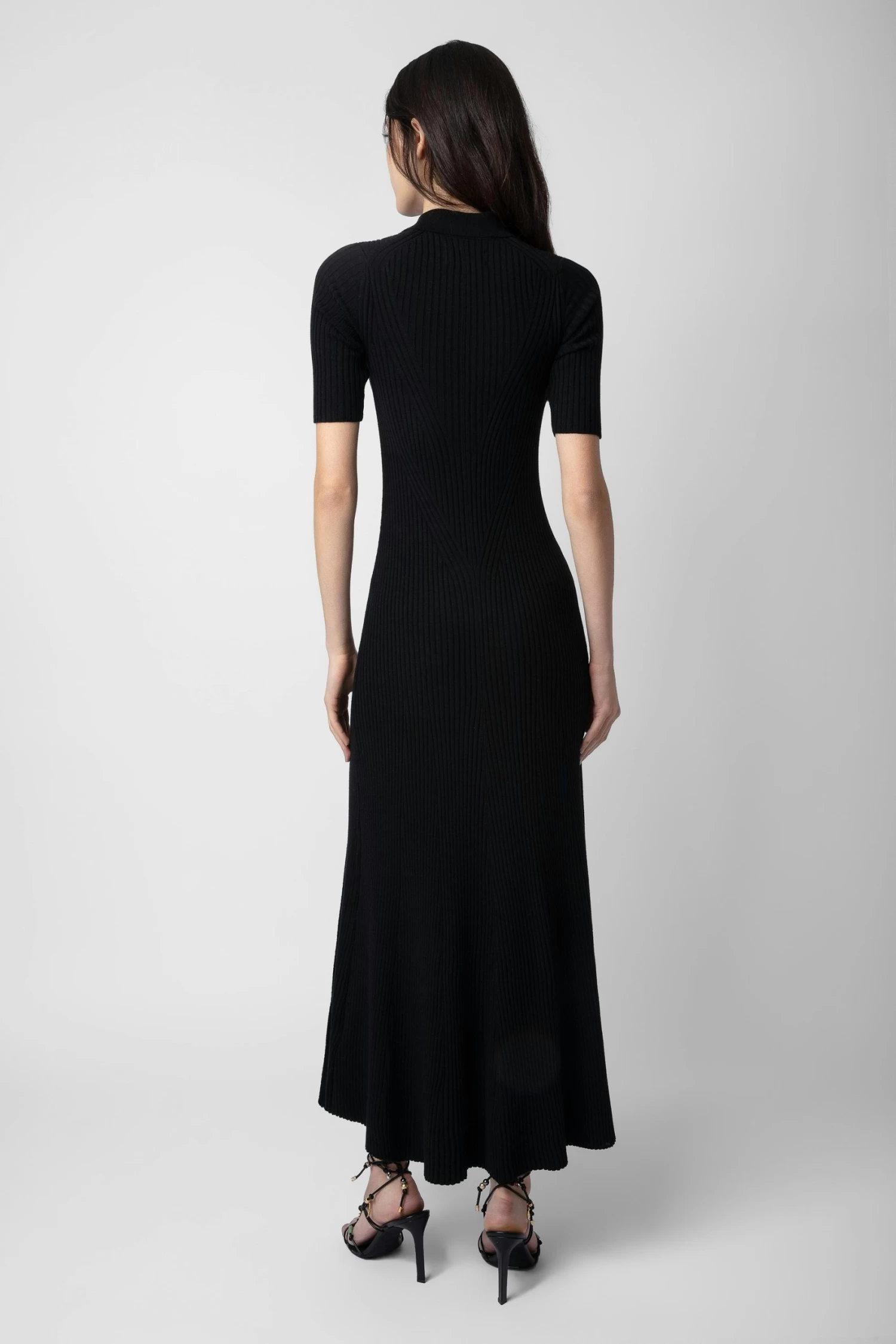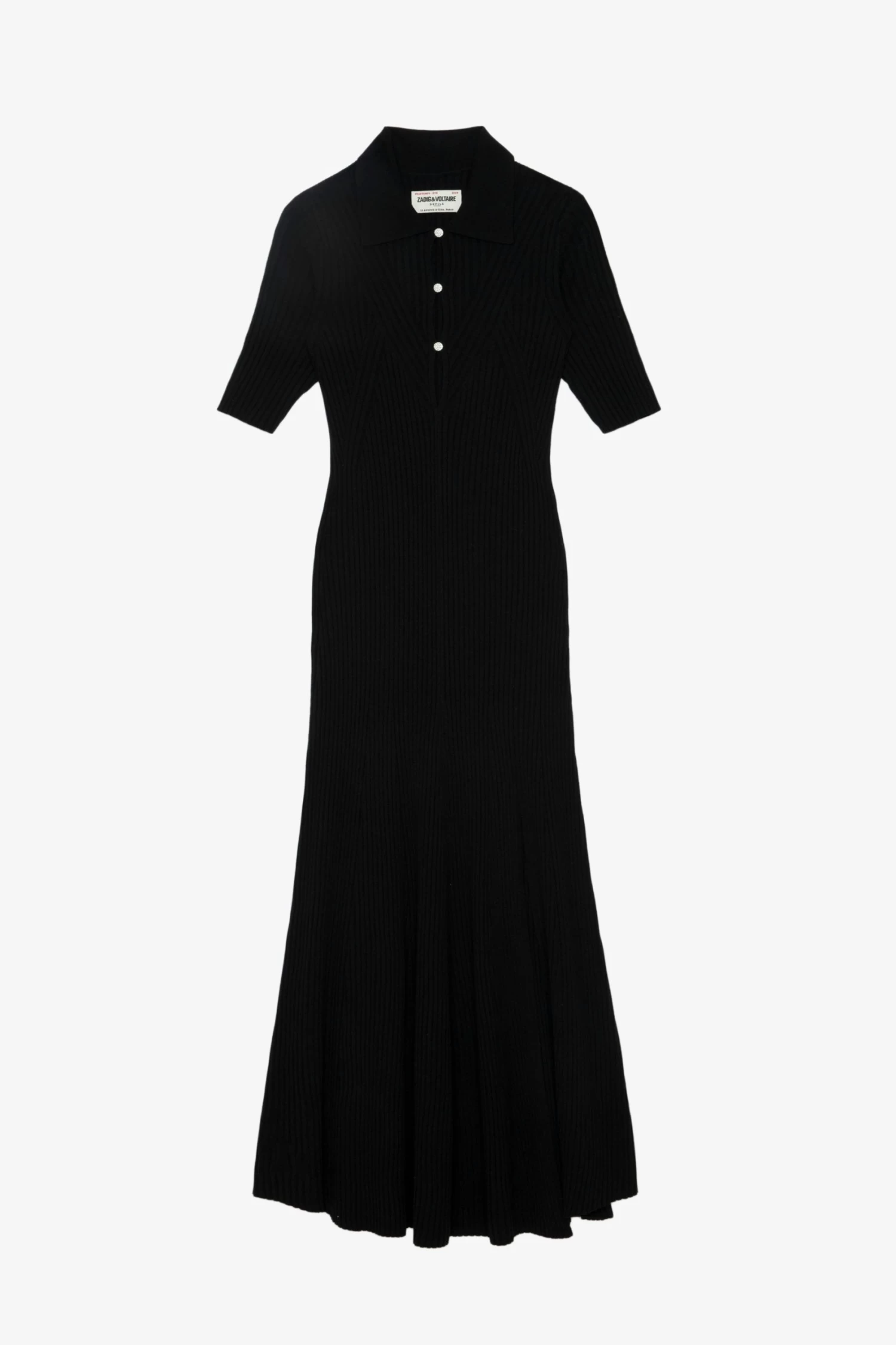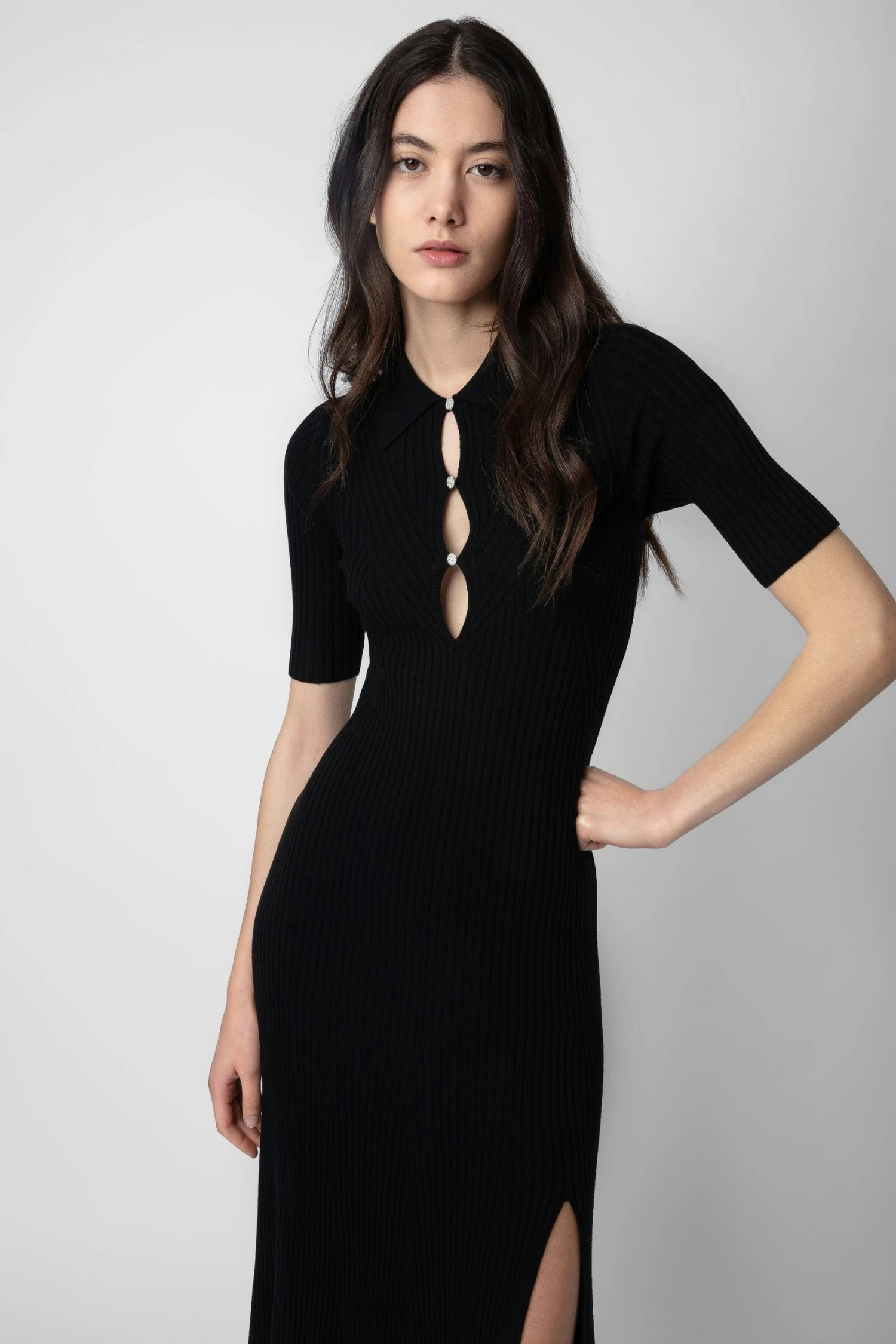 – Women’s black long fitted dress in ribbed merino wool – Cut-outs, silver diamanté jewel buttons and – Shirt collar – Short sleeves, pointelle ZV signature and ribbed trim – Flared skirt with split Model is 177 cm / 5′ 9″ and is wearing a size S*Contains 90% RWS certified woolThe Responsible Wool Standard (RWS) guarantees animal welfare and respect for pastures. It also ensures end-to-end traceability of the wool through the supply chain