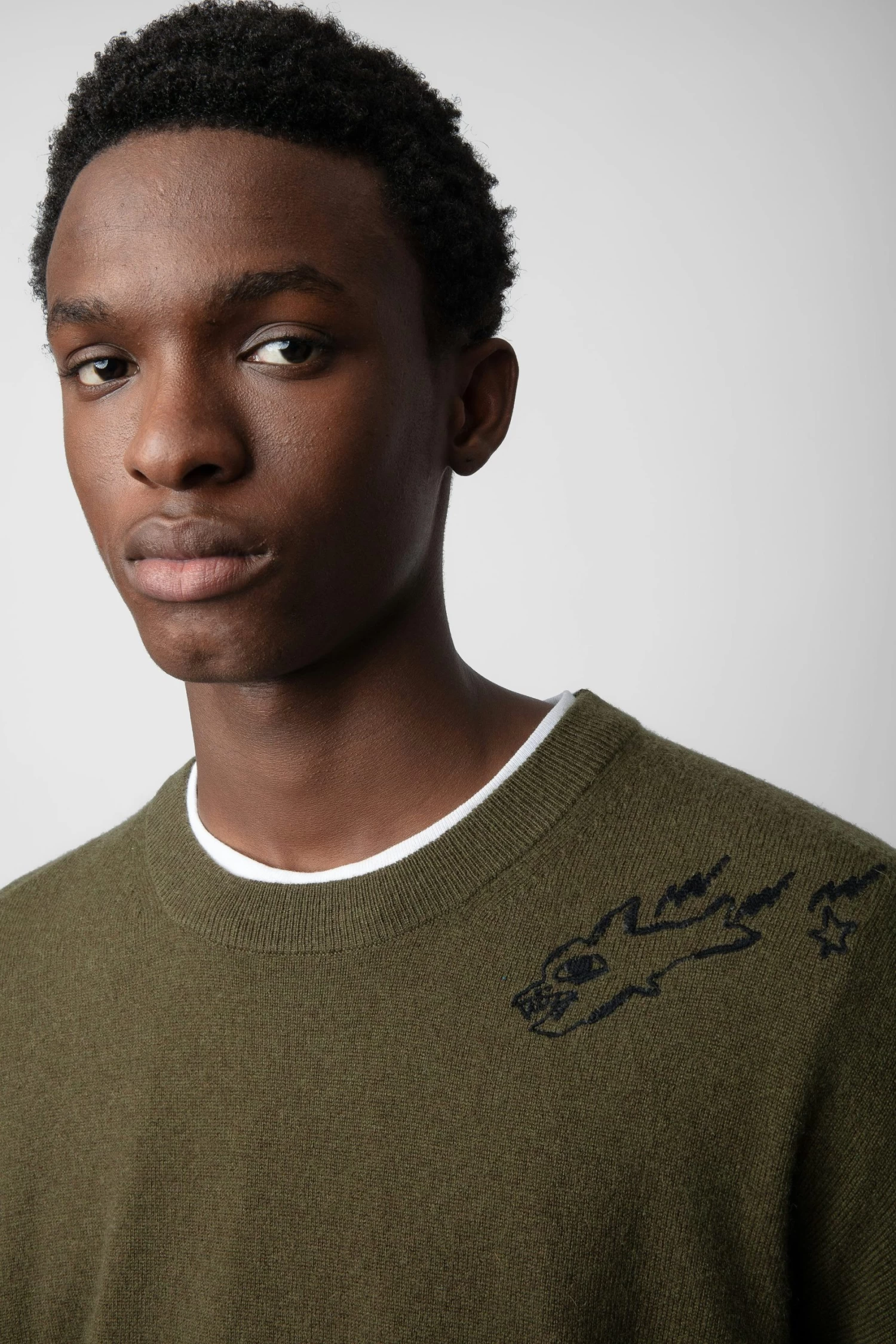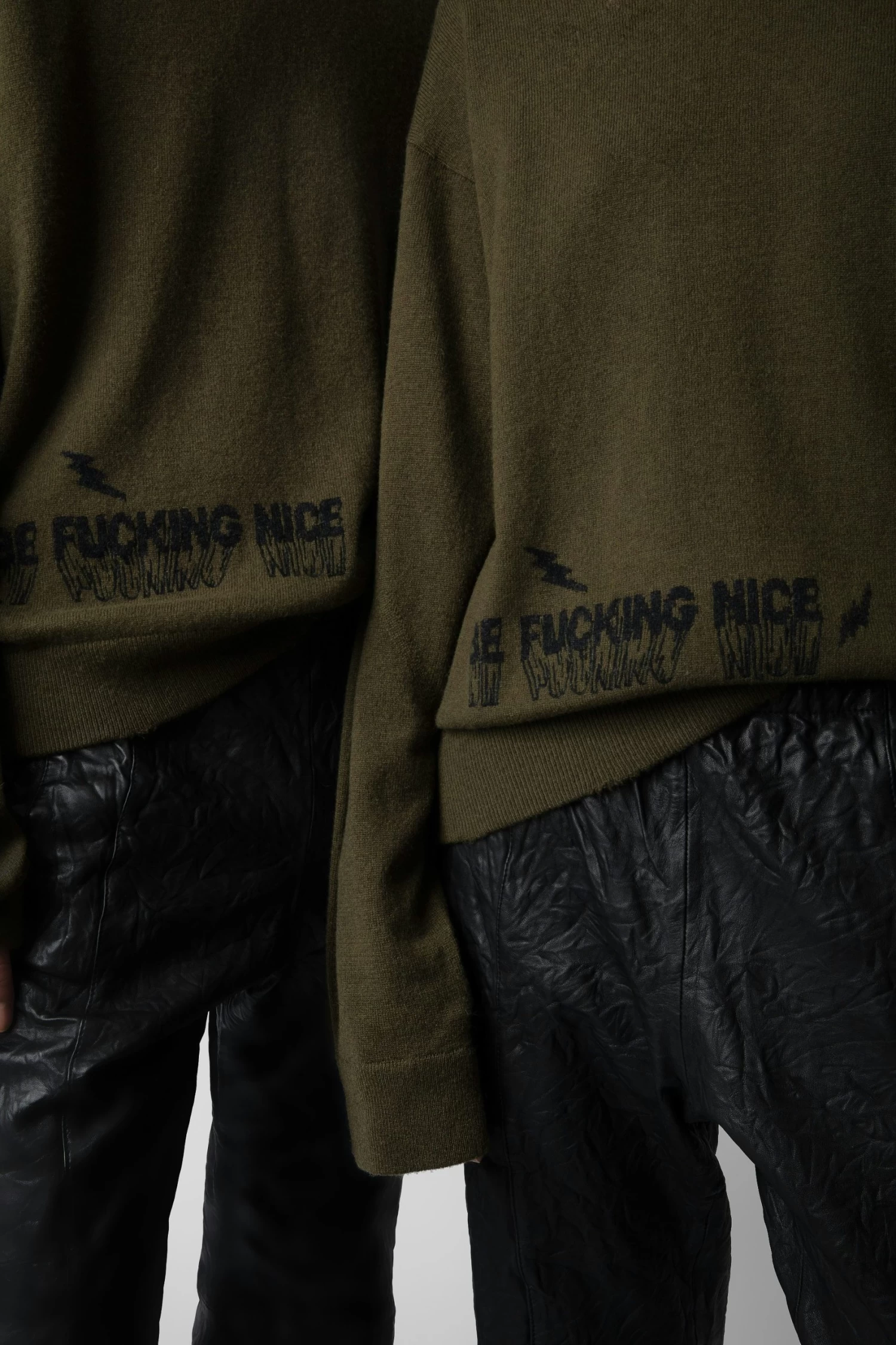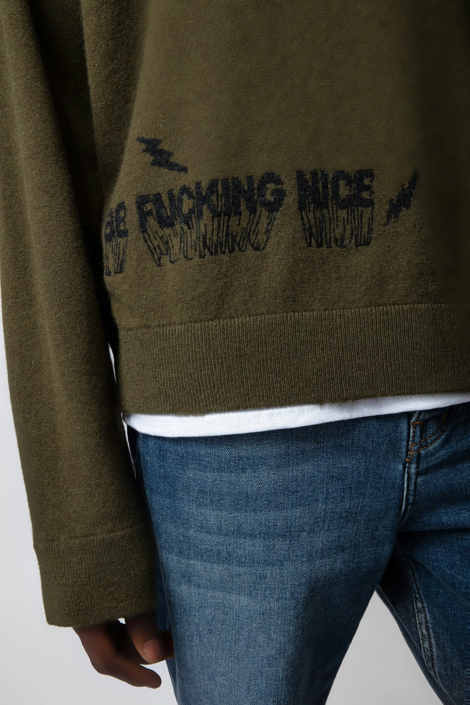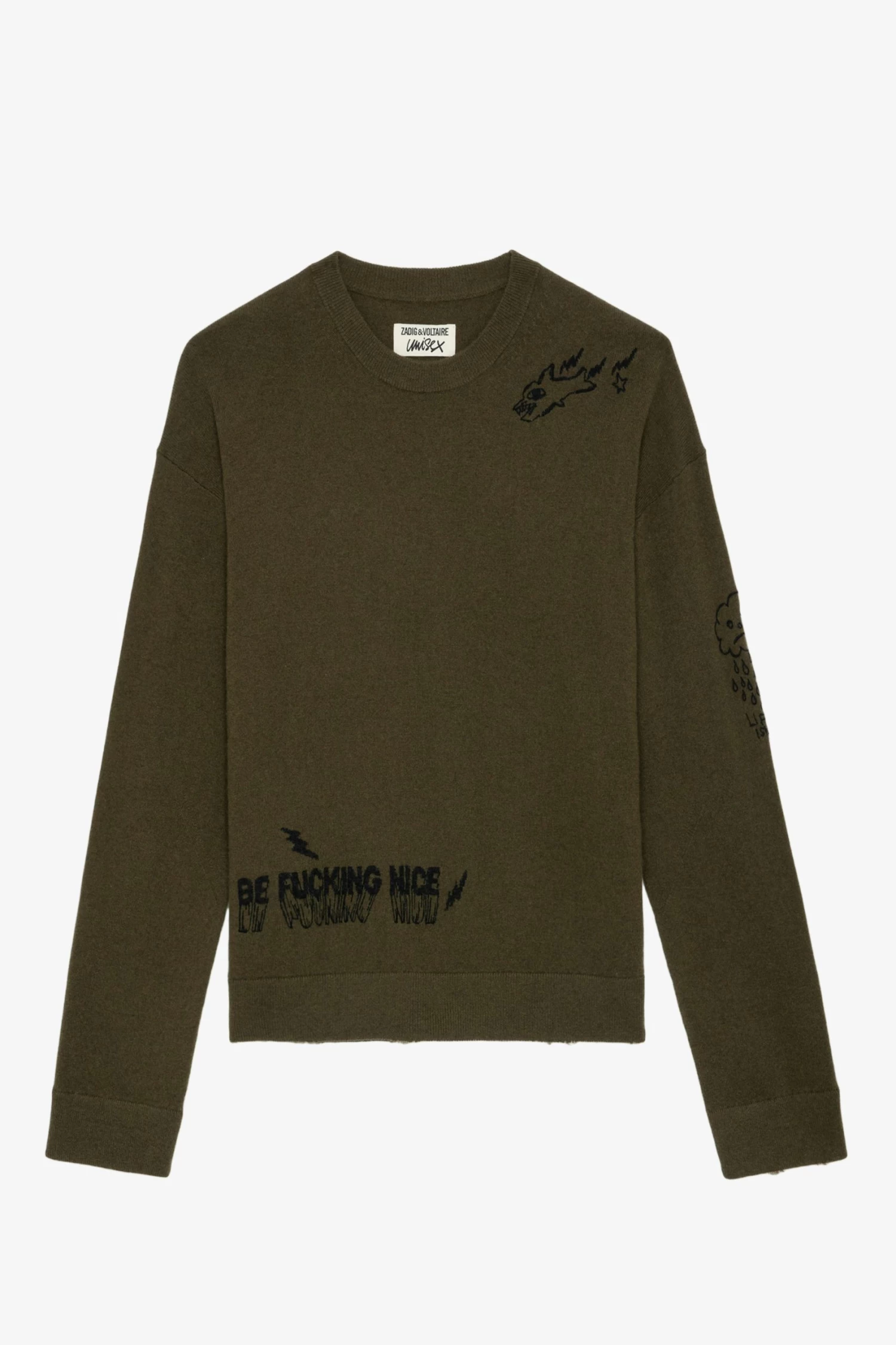 The Marko jumper is part of the UNISEX collection. A free-spirited wardrobe by Zadig&Voltaire, the UNISEX collection represents the fusion of feminine and masculine features. Customized details designed by Humberto Cruz, an artist and illustrator from San Diego. Influenced by pop culture, fashion and colors, he describes his work as spontaneous and quirky. – Unisex Used Khaki wool and cashmere jumper – Graffiti motifs and contrasting “Be Fucking Nice” and “Kiss My Ass” slogans – Round neckline – Long sleeves and ribbed trim *Contains 70% RWS certified woolThe Responsible Wool Standard (RWS) guarantees animal welfare and respect for pastures. It also ensures end-to-end traceability of the wool through the supply chain
