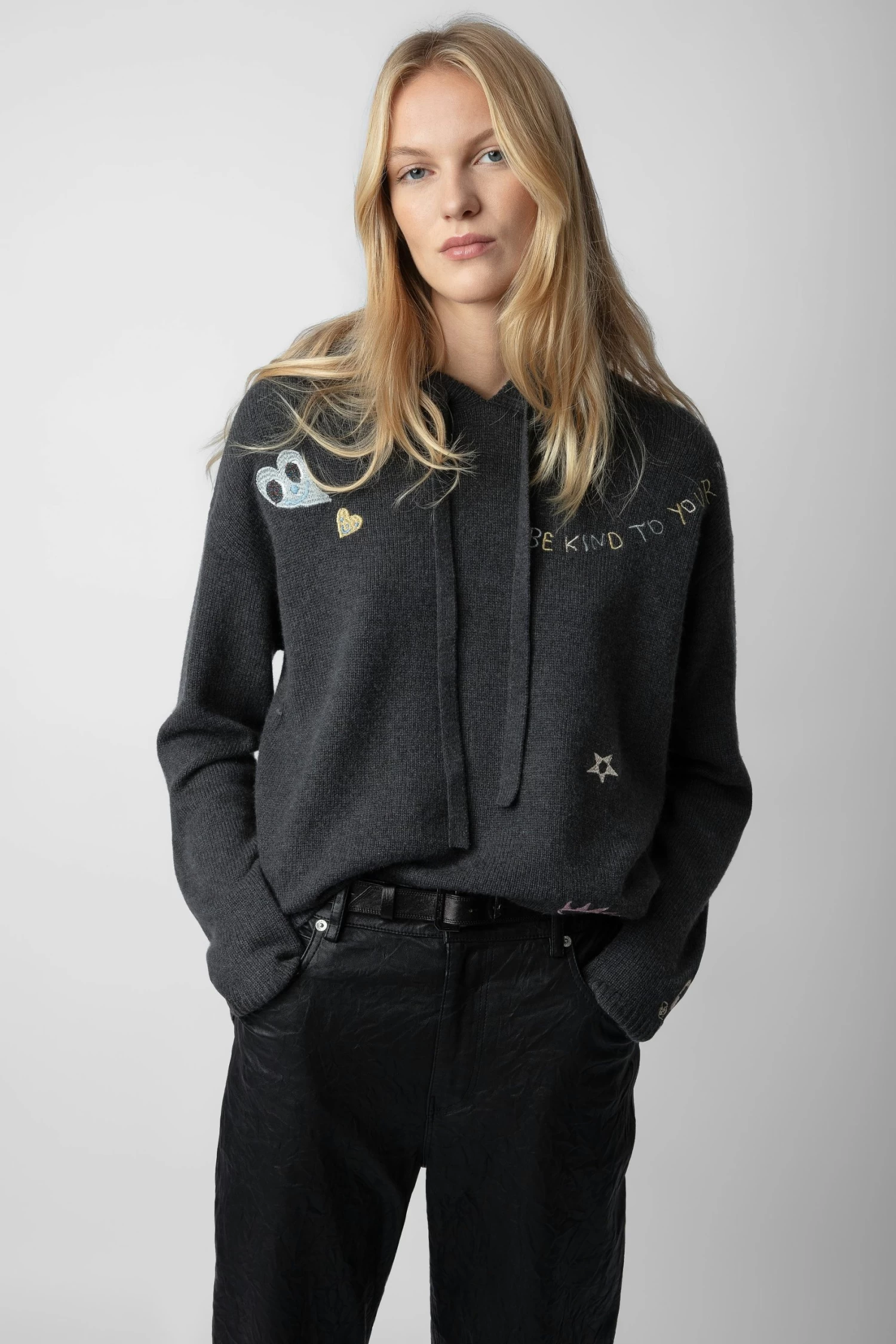 Khaki grey cashmere hooded jumper with long sleeves and customized details designed by Humberto Cruz.