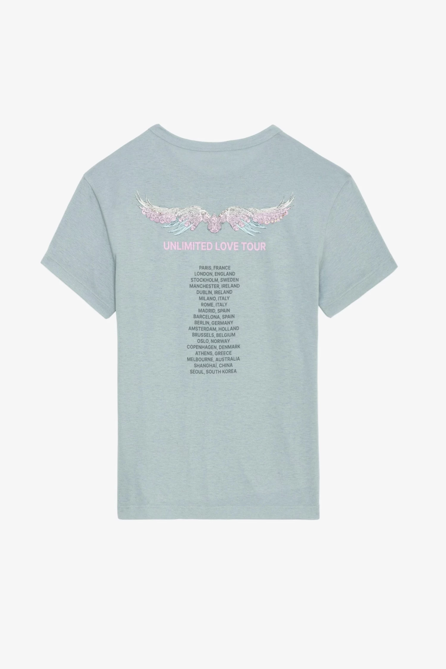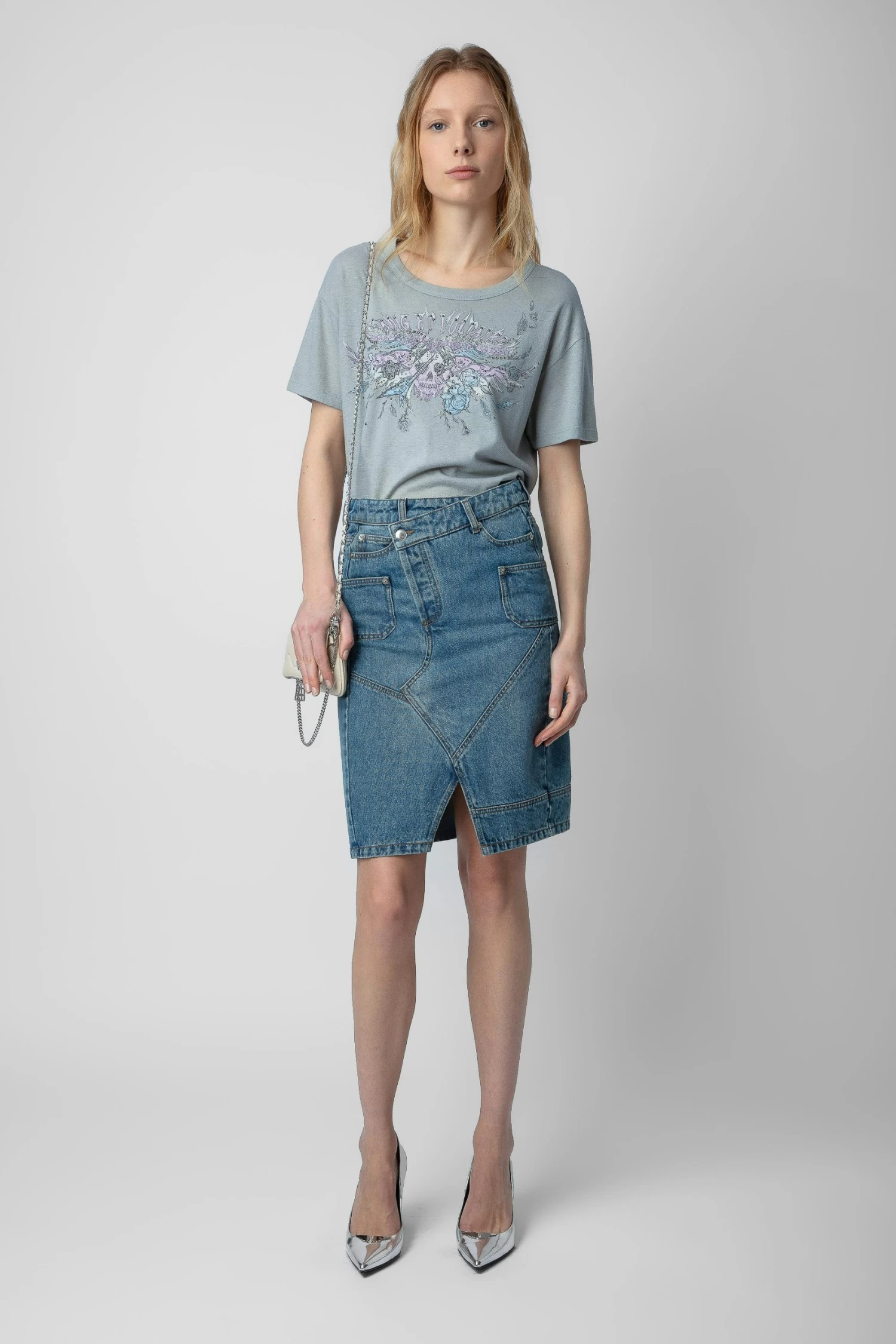 Grey short-sleeved T-shirt with Concert motifs and diamanté skull and wings.