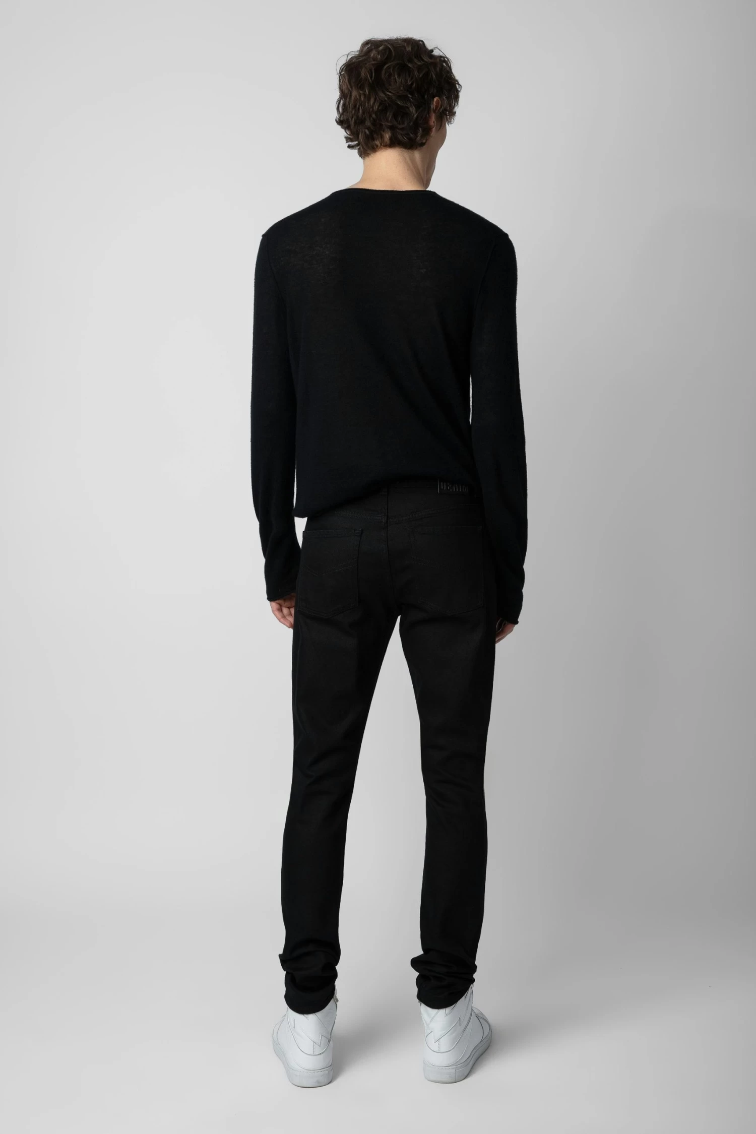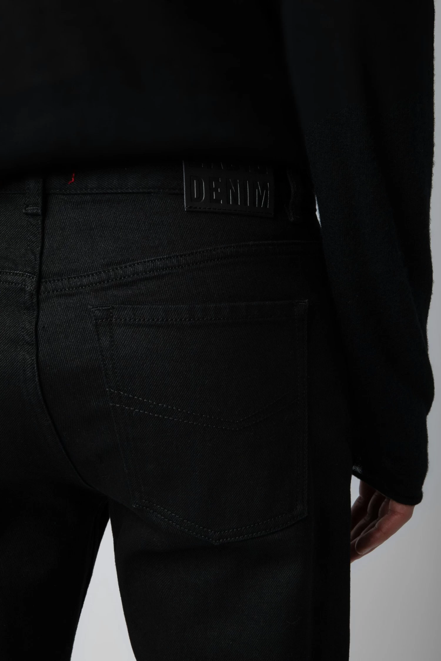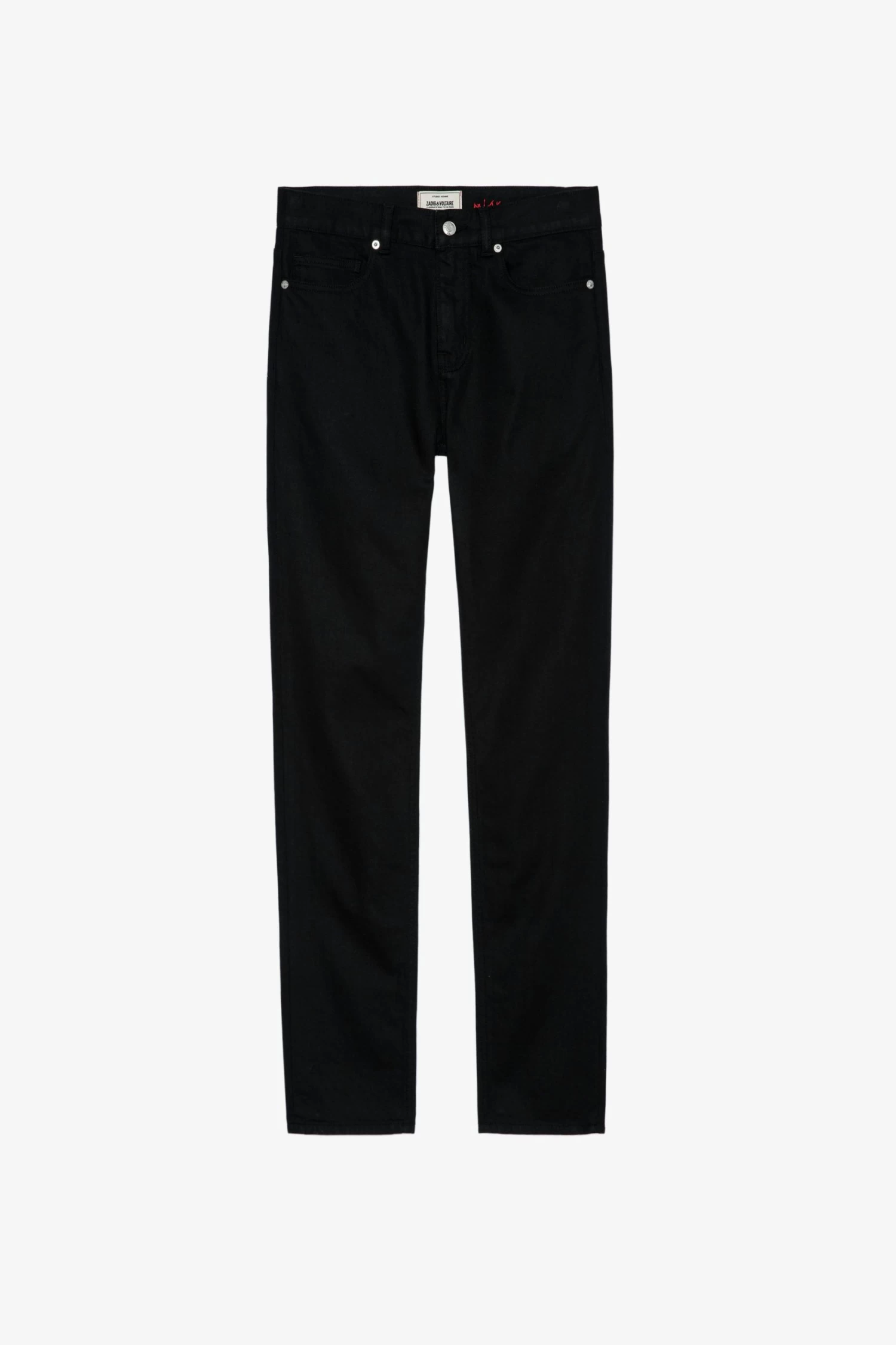 Fitted slim-leg jeans in black denim with 5 pockets. – Zadig&Voltaire Men’s fitted jeans – Black denim – Slim legs – 5 pockets – Button fly – Belt loops – Leather patch on the backModel is 188 cm / 6′ 2″ and is wearing a size 30**Fibers from organic farming