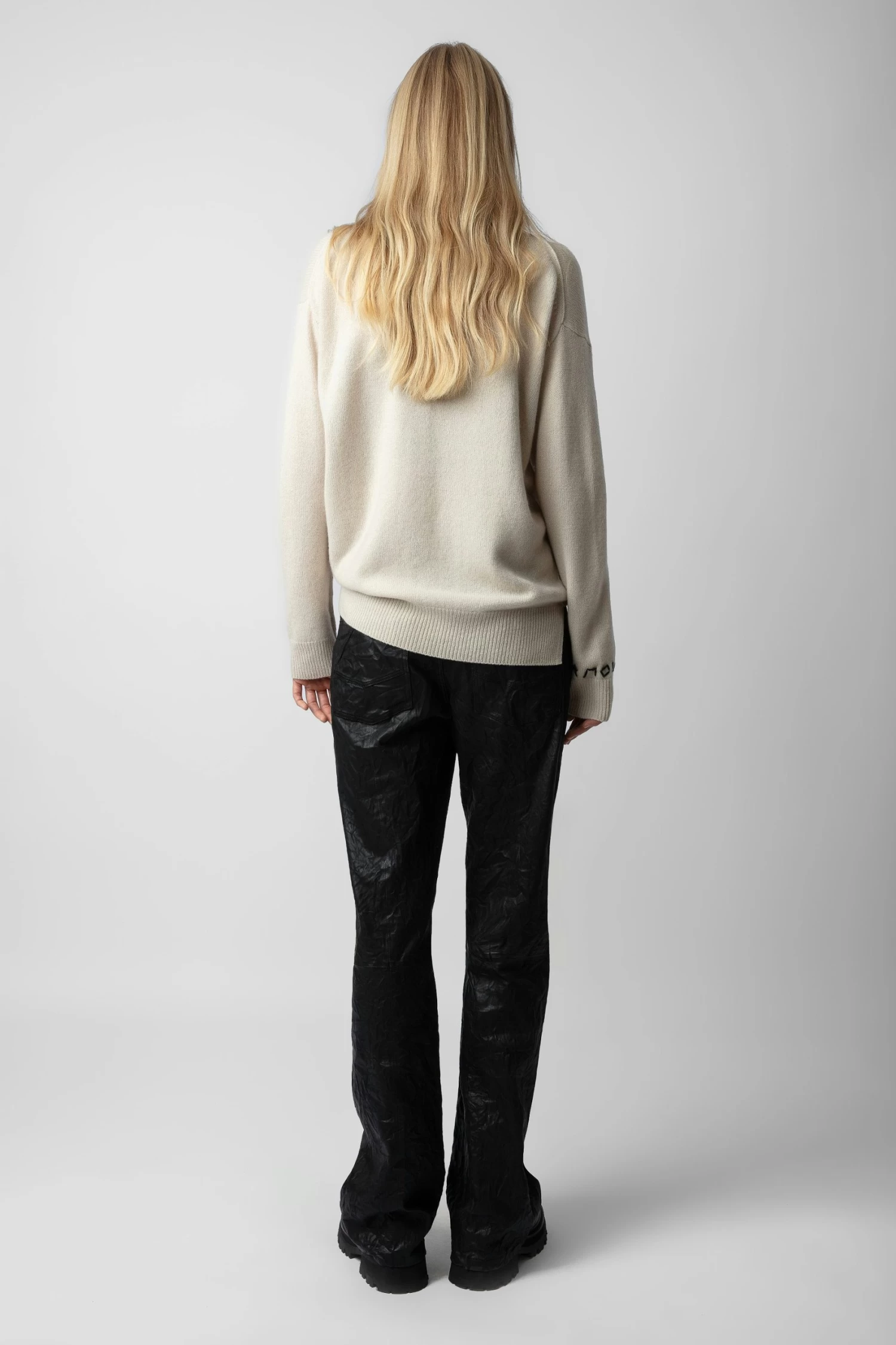 Ecru cashmere buttoned cardigan with long sleeves, motifs and slogans.