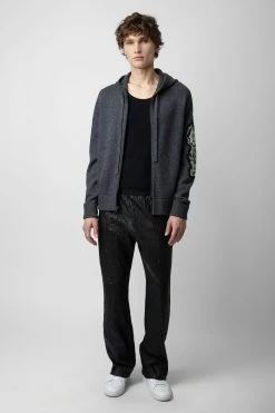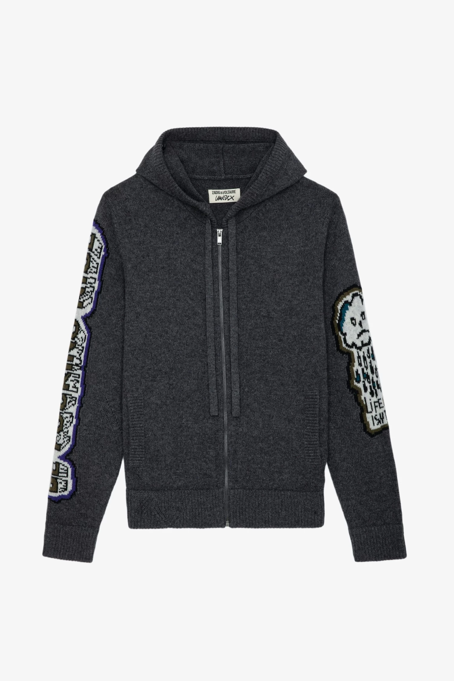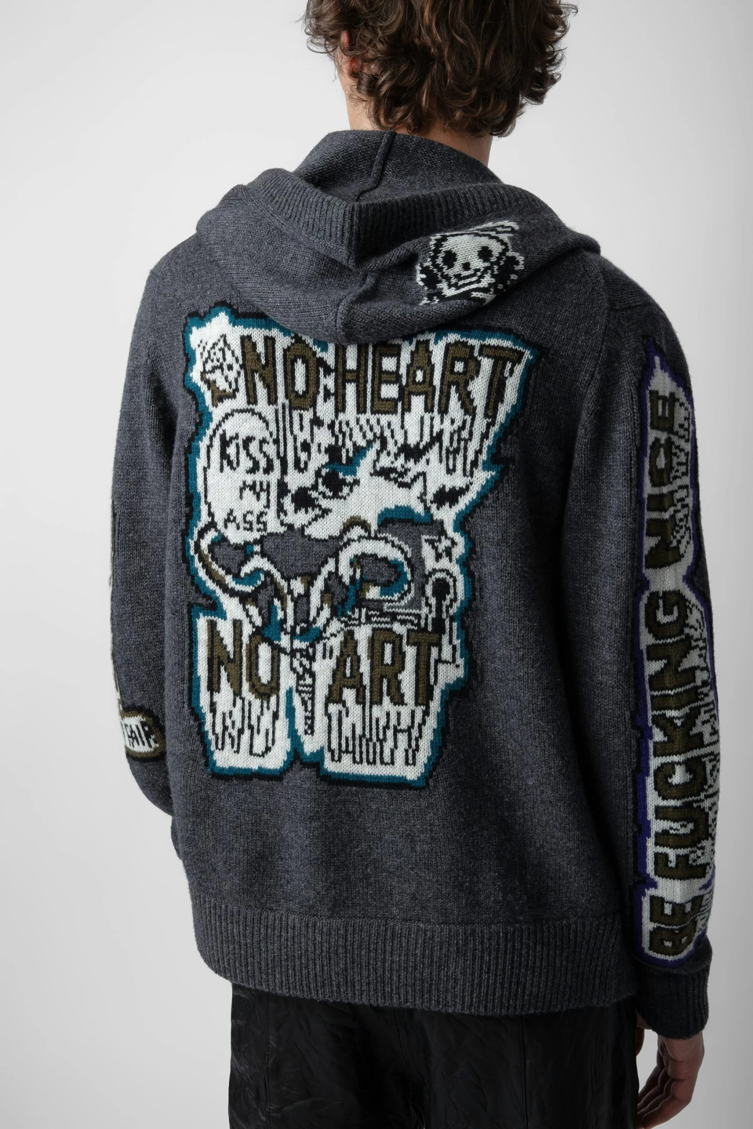 Customized details designed by Humberto Cruz, an artist and illustrator from San Diego. Influenced by pop culture, fashion and colors, he describes his work as spontaneous and quirky. – Men’s anthracite wool and cashmere cardigan – Drawstring hood – Long sleeves and ribbed trim – Zip fastening and 2 side pockets – Graffiti motifs and “Be Fucking Nice” and “No Heart No Art” slogans Model is 187 cm / 6′ 1″ and is wearing a size M/L*Contains 70% RWS certified woolThe Responsible Wool Standard (RWS) guarantees animal welfare and respect for pastures. It also ensures end-to-end traceability of the wool through the supply chain