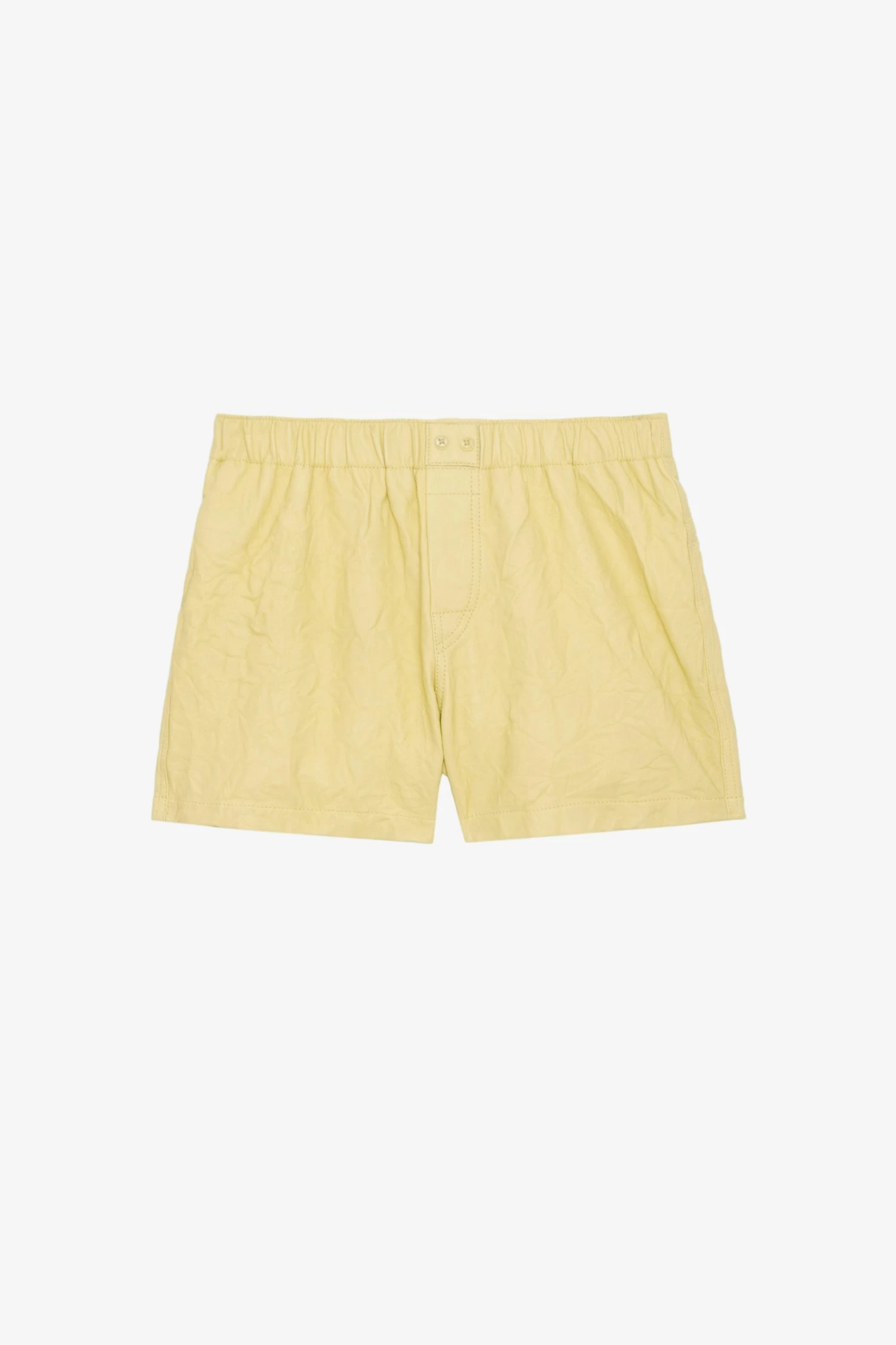 Women’s light yellow crinkled leather shorts.