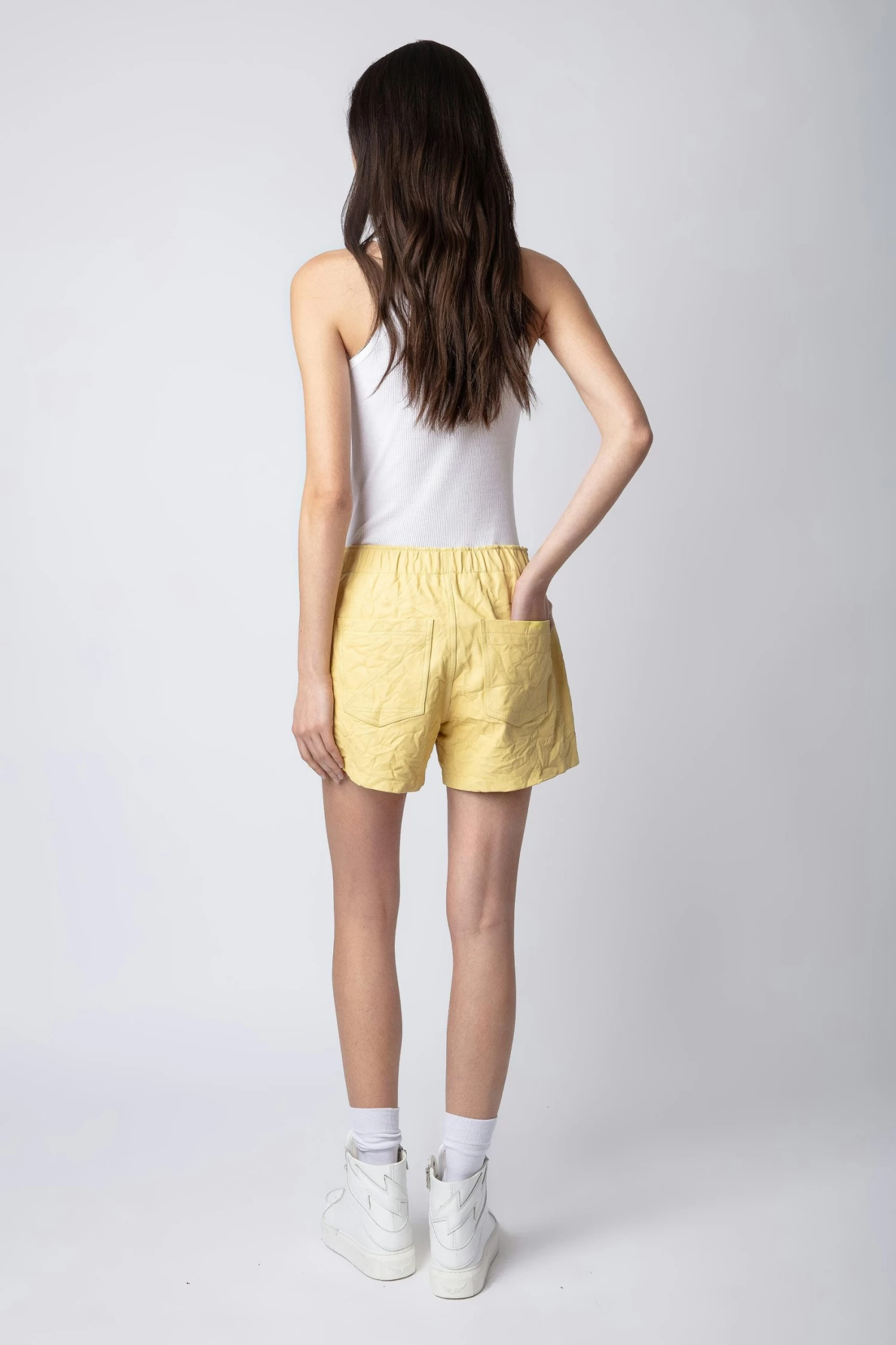 Zadig&Voltaire’s signature material, crinkled leather is obtained by means of a multi-step process developed by the brand, guaranteeing a unique product that showcases exceptional know-how. r – Women’s Shea light yellow crinkled leather shorts – Mid rise – Elasticated waist – 2 buttons – 2 back pocketsModel is 174 cm / 5′ 8″ and is wearing a size 36The Leather Working Group/LWG is a membership organization comprised of brands, suppliers, leather manufacturers and other stakeholders within the leather manufacturing industry. The group has developed an auditing program which certifies leather manufacturing facilities based on their environmental compliance and performance capabilities