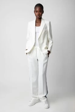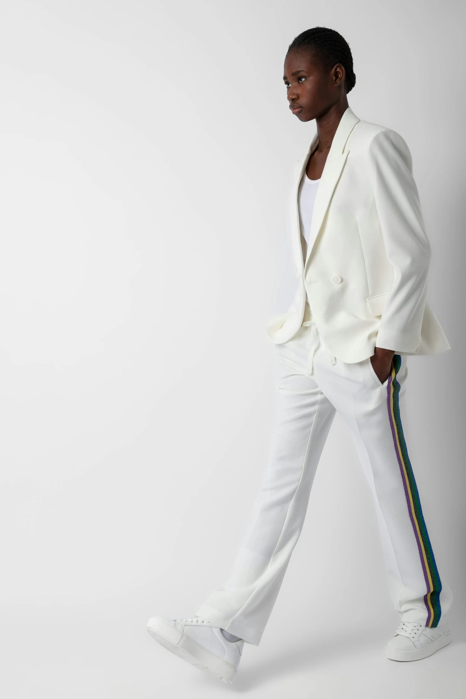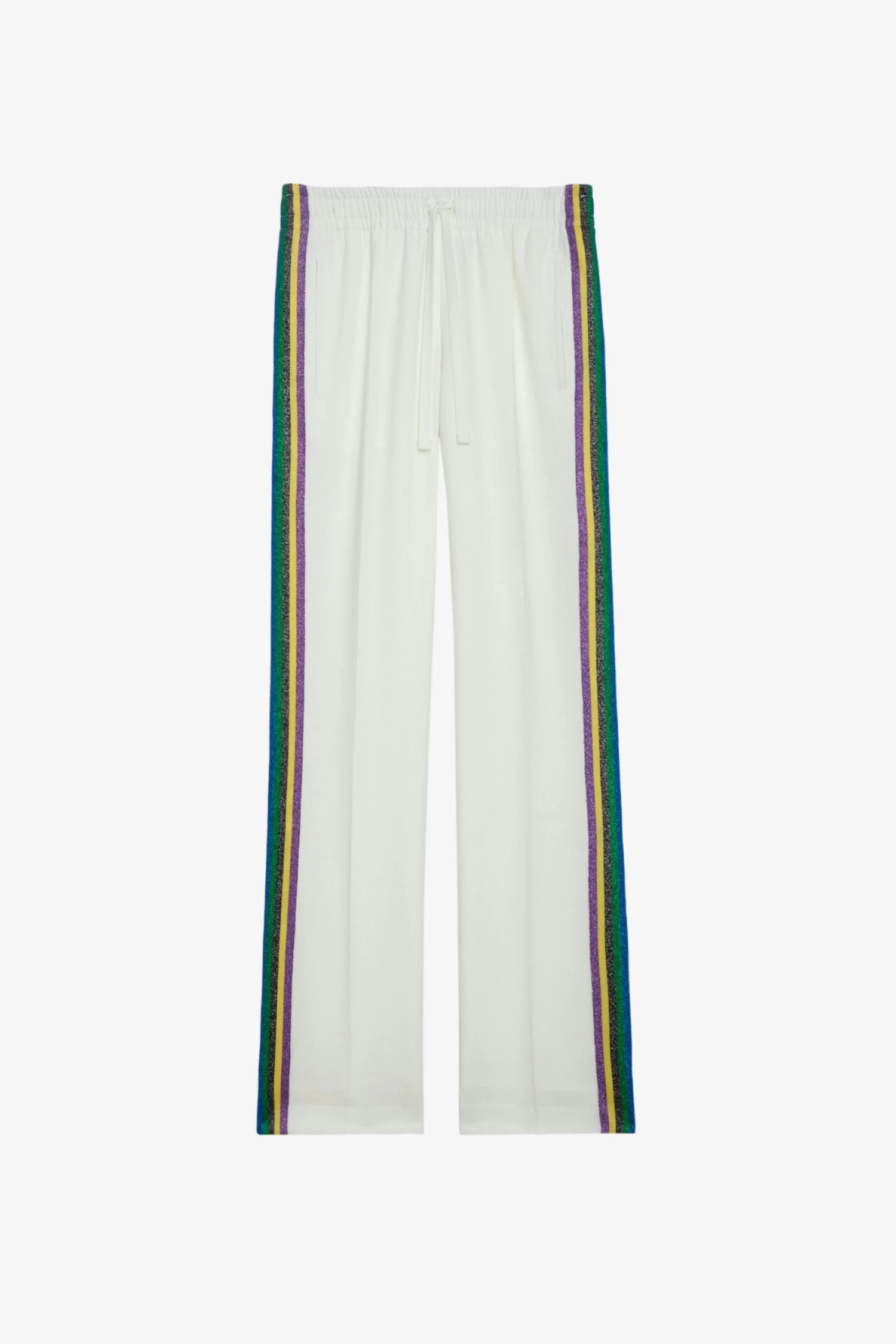 – Women’s Judo white flowing crêpe pants – Multicolored glittery side bands – Drawstring at the waist and 2 side pockets – Made in Portugal Model is 177 cm / 5′ 9″ and is wearing a size S**recycled fibers