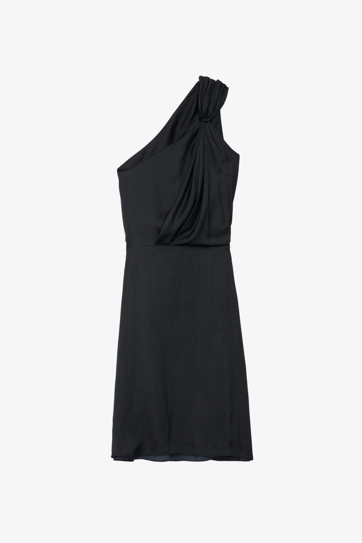 – Women’s black satin fitted midi dress – Draped asymmetric strap – Opening at the back – Gathered details and slightly flared skirt Model is 179 cm / 5′ 10″ and is wearing a size S**recycled fibers