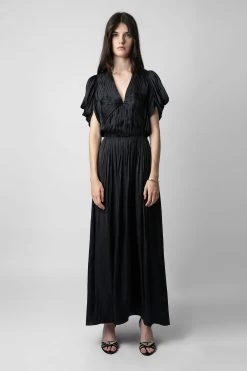 – Women’s long black satin flowing dress – V neckline and short asymmetrical balloon sleeves – Gathered and draped – Elasticated waist and skirt with split at the front Model is 179 cm / 5′ 10″ and is wearing a size S**recycled fibers