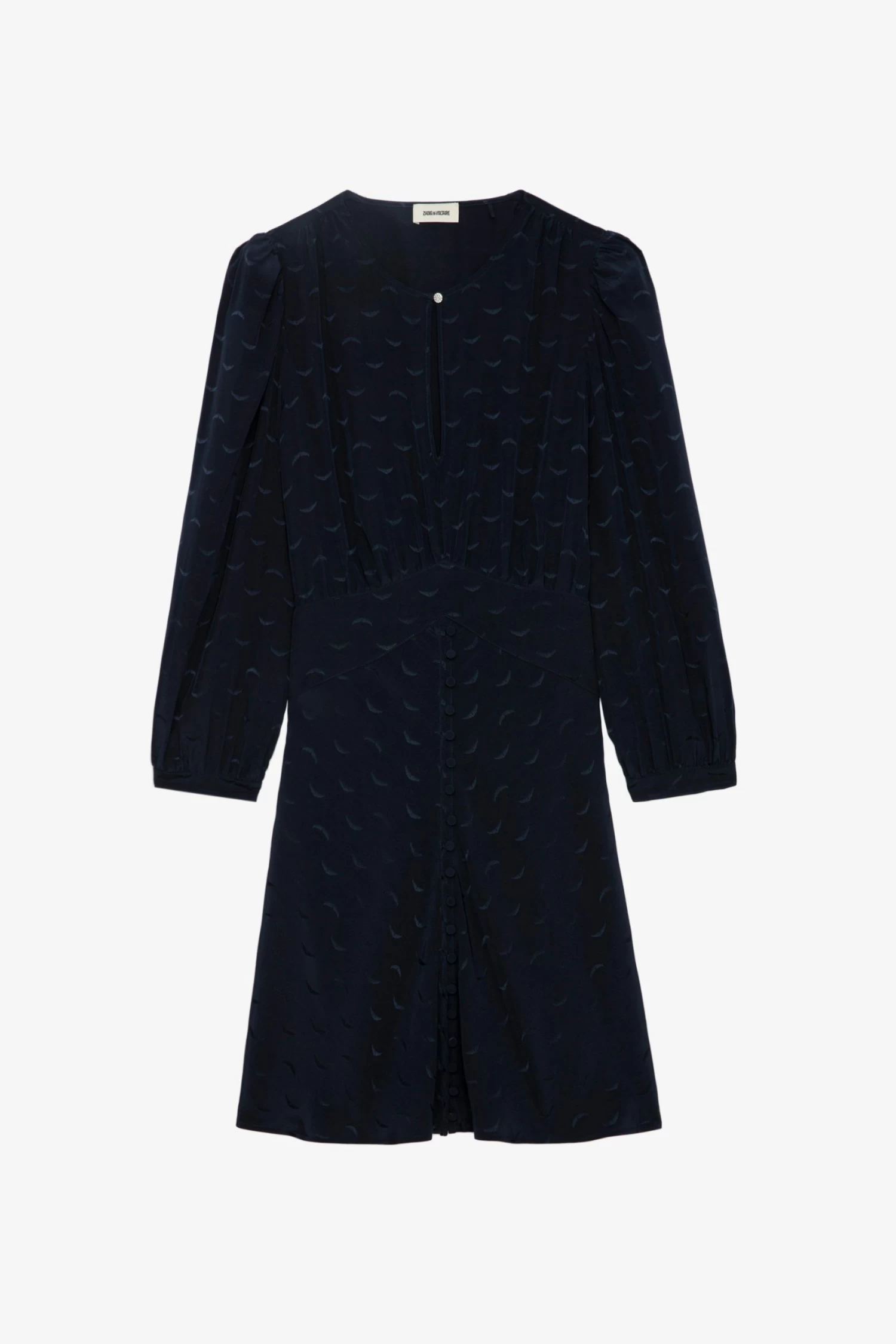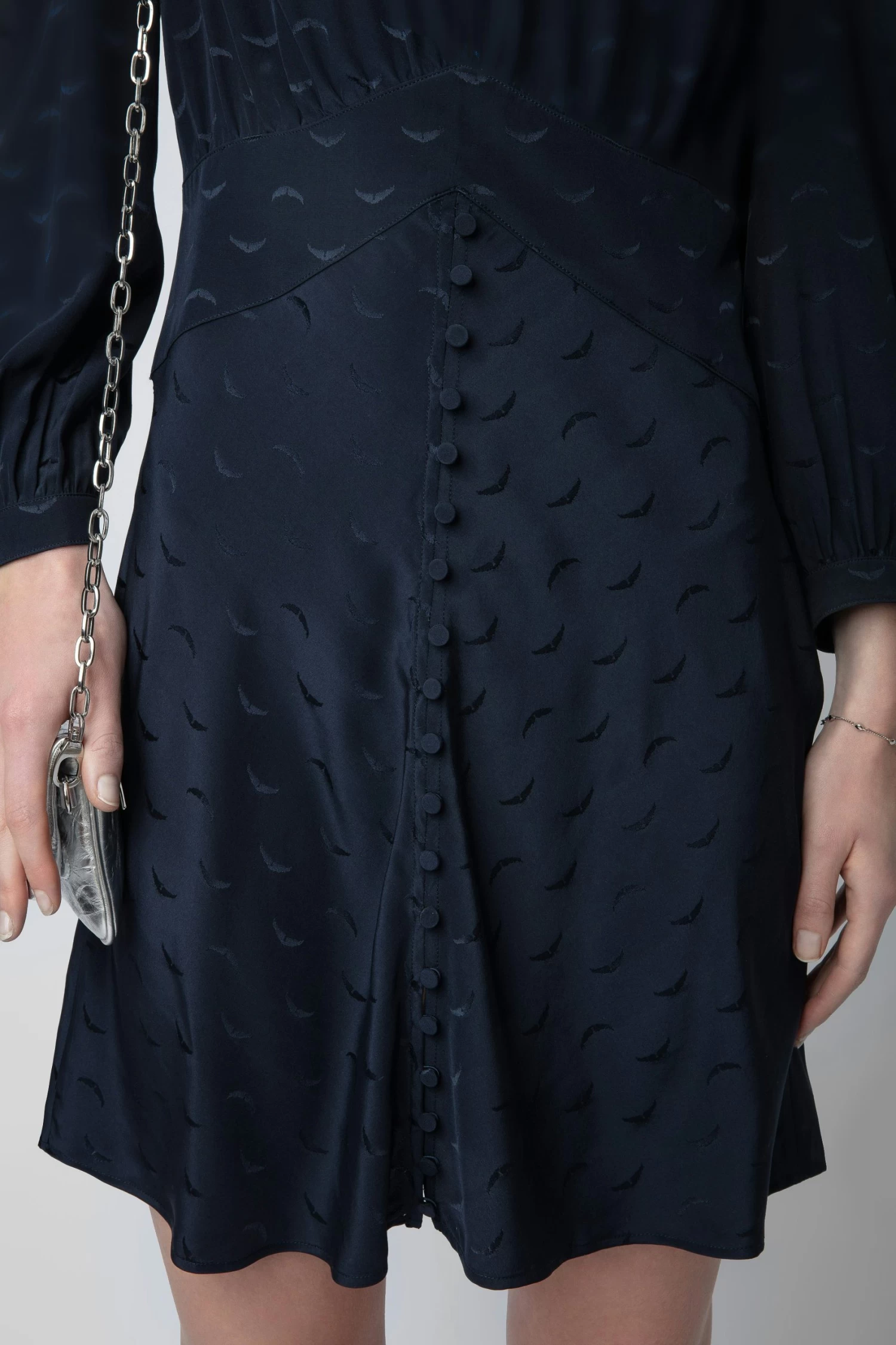 Short navy blue silk dress with jacquard wings, button closure and 3u002F4-length sleeves.