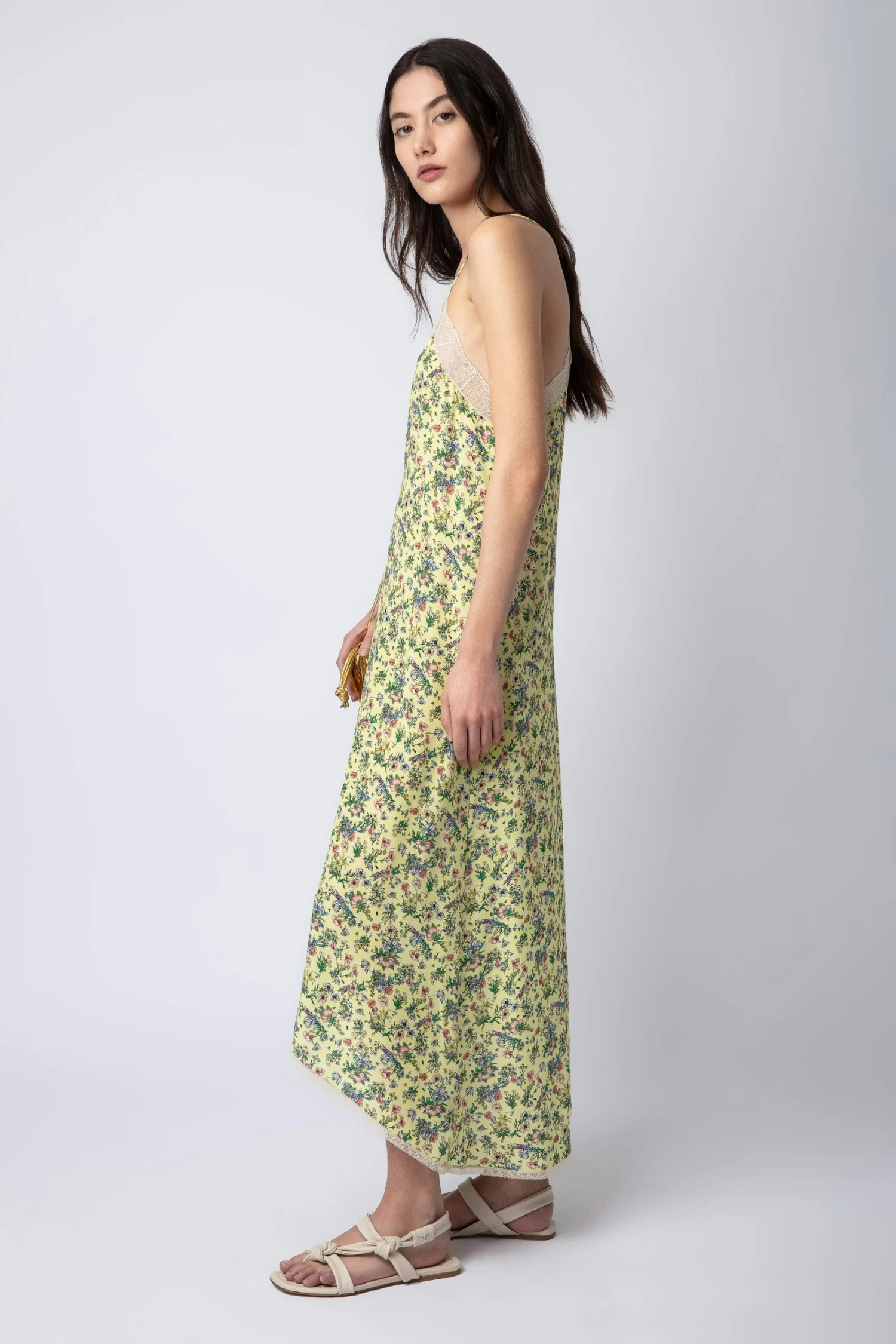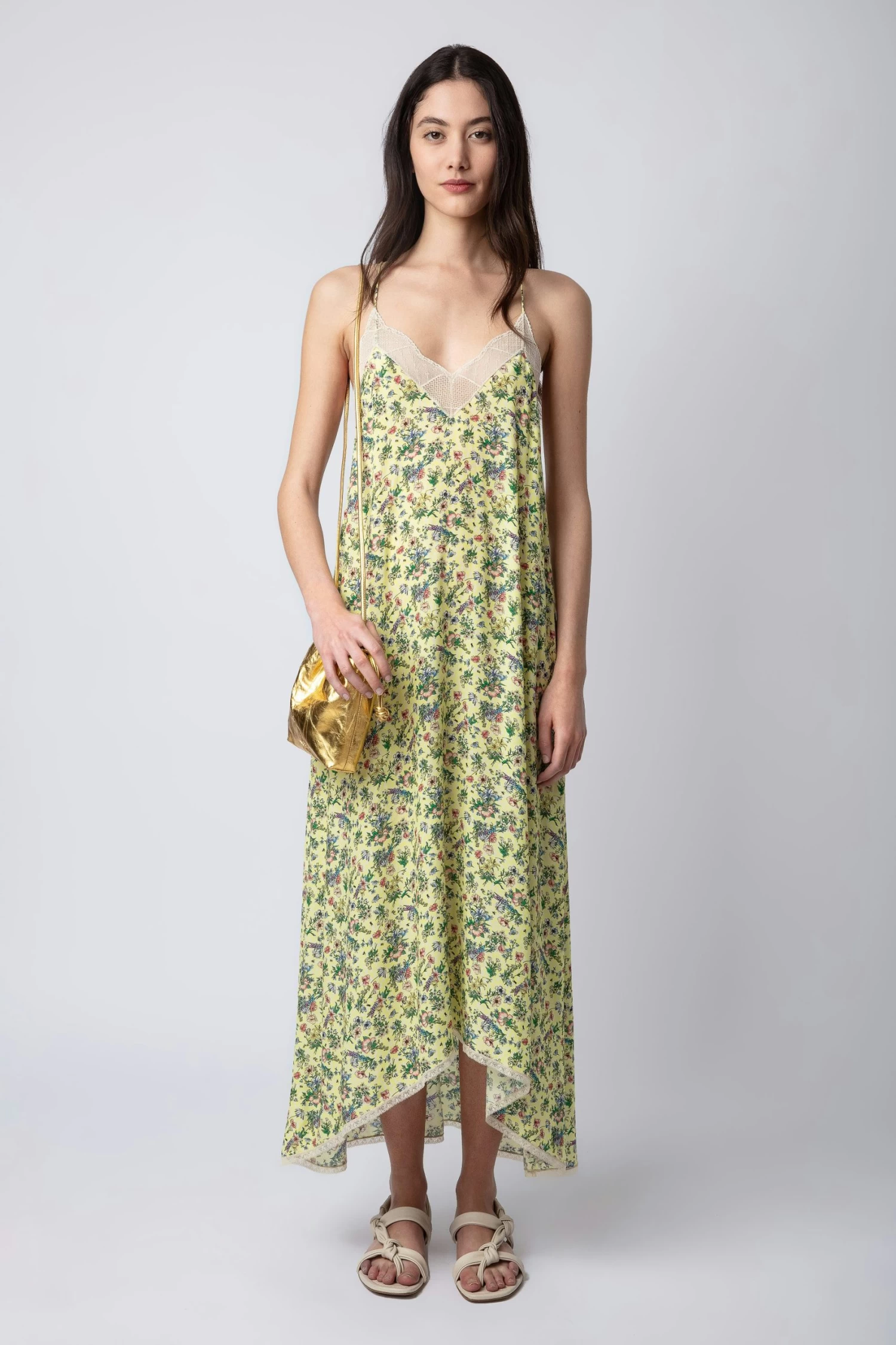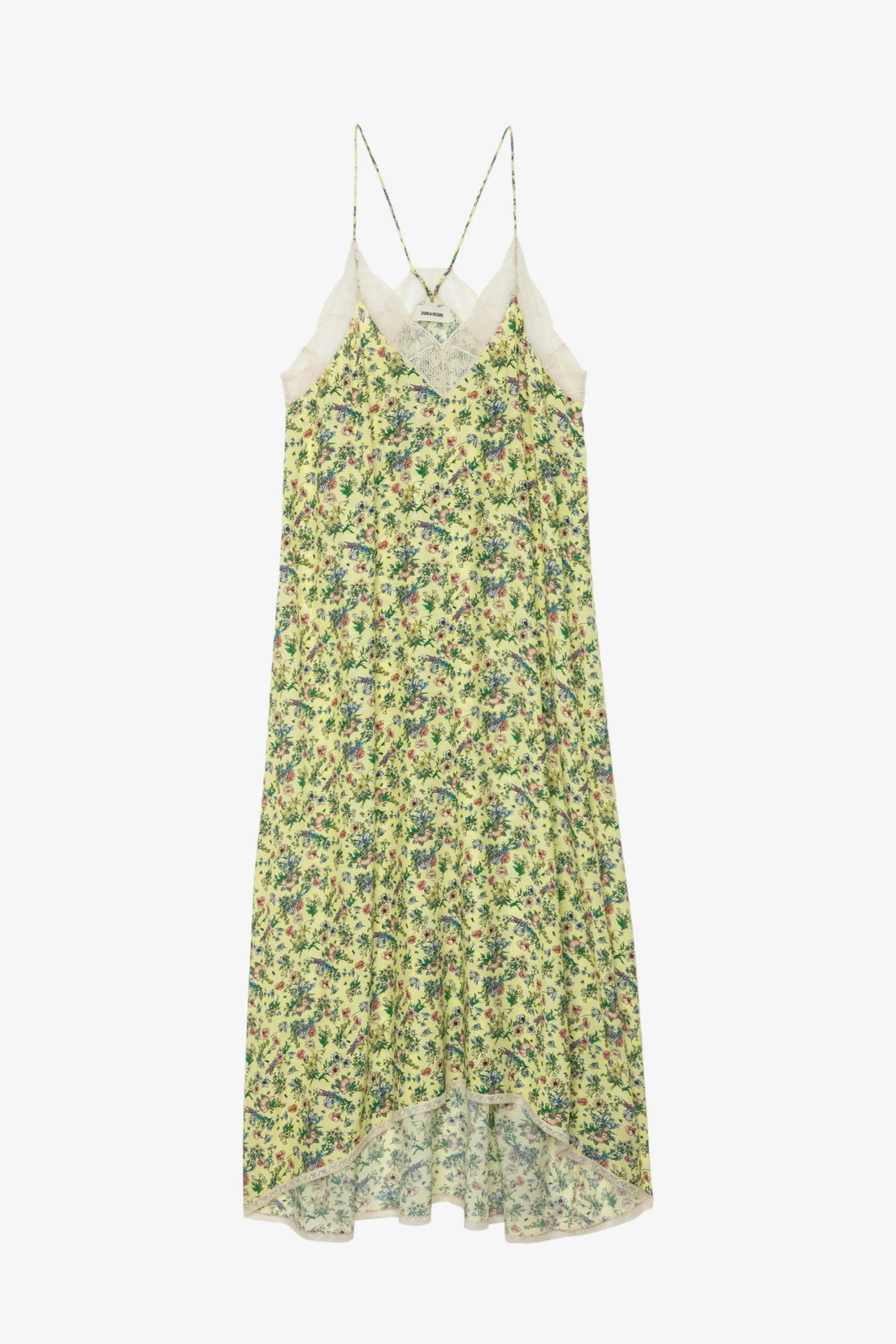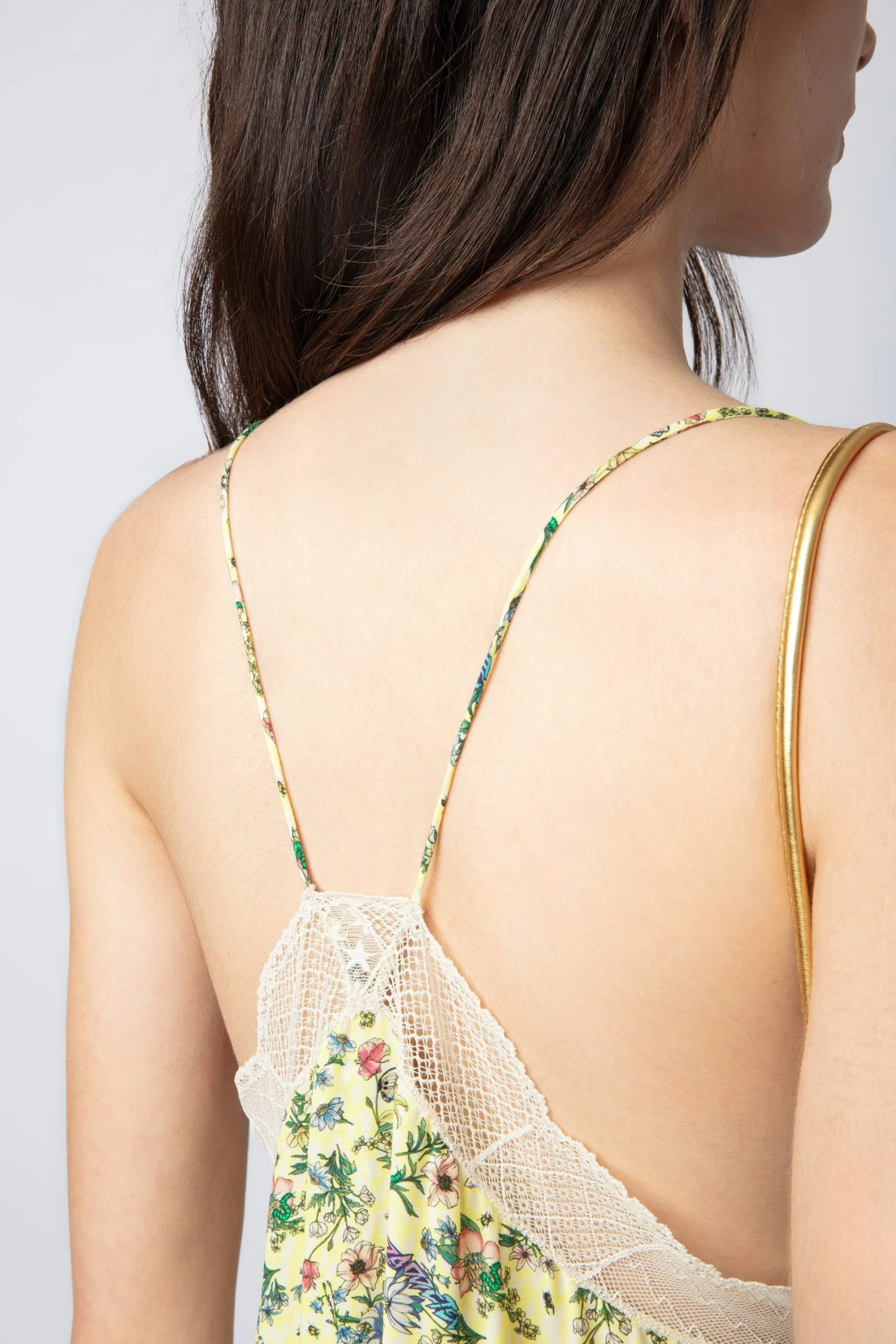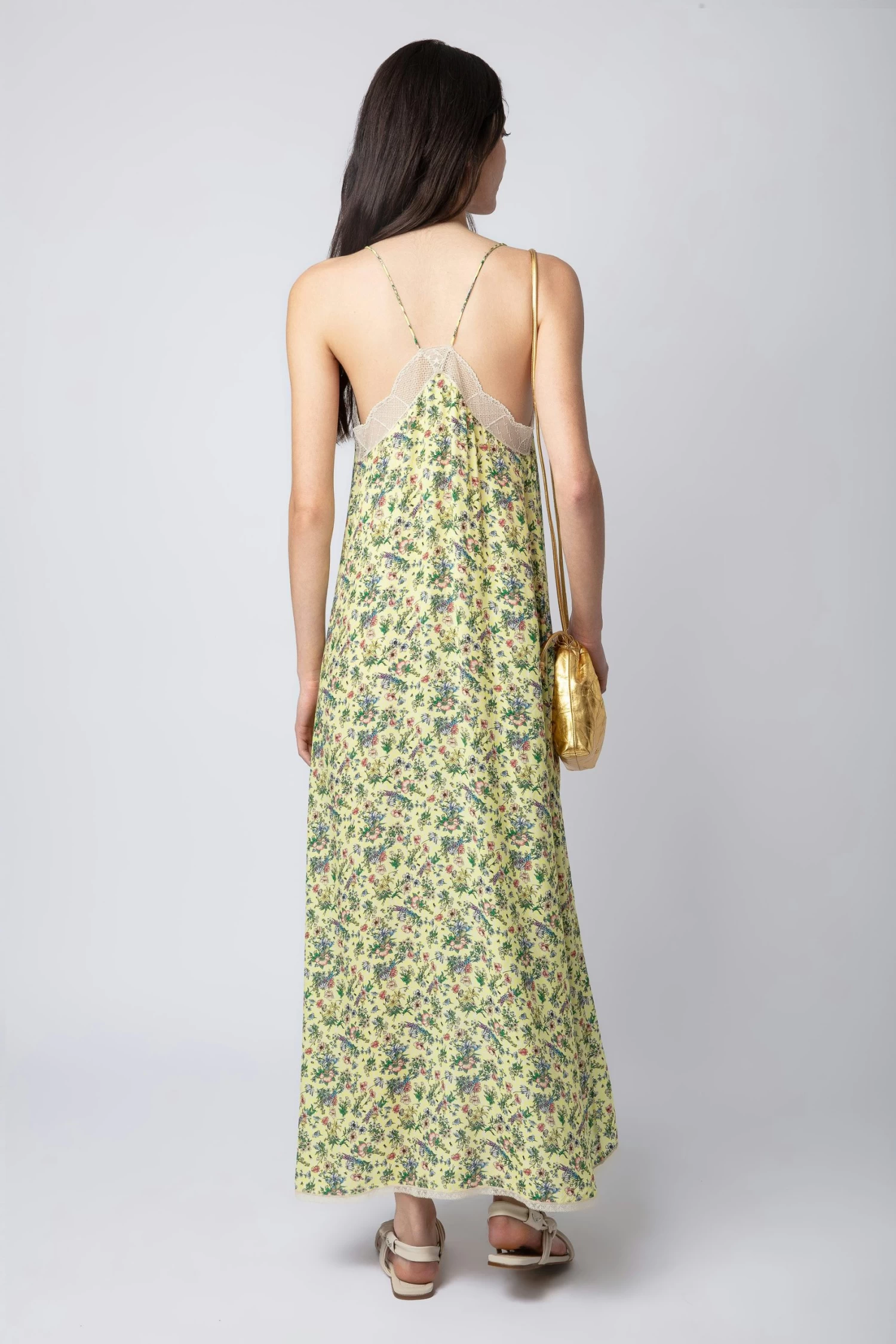 – Women’s long yellow flowing dress – Floral-print silk – V neckline – Thin non-adjustable straps and slits at the hem – Contrasting lace bandsModel is 174 cm / 5′ 8″ and is wearing a size S