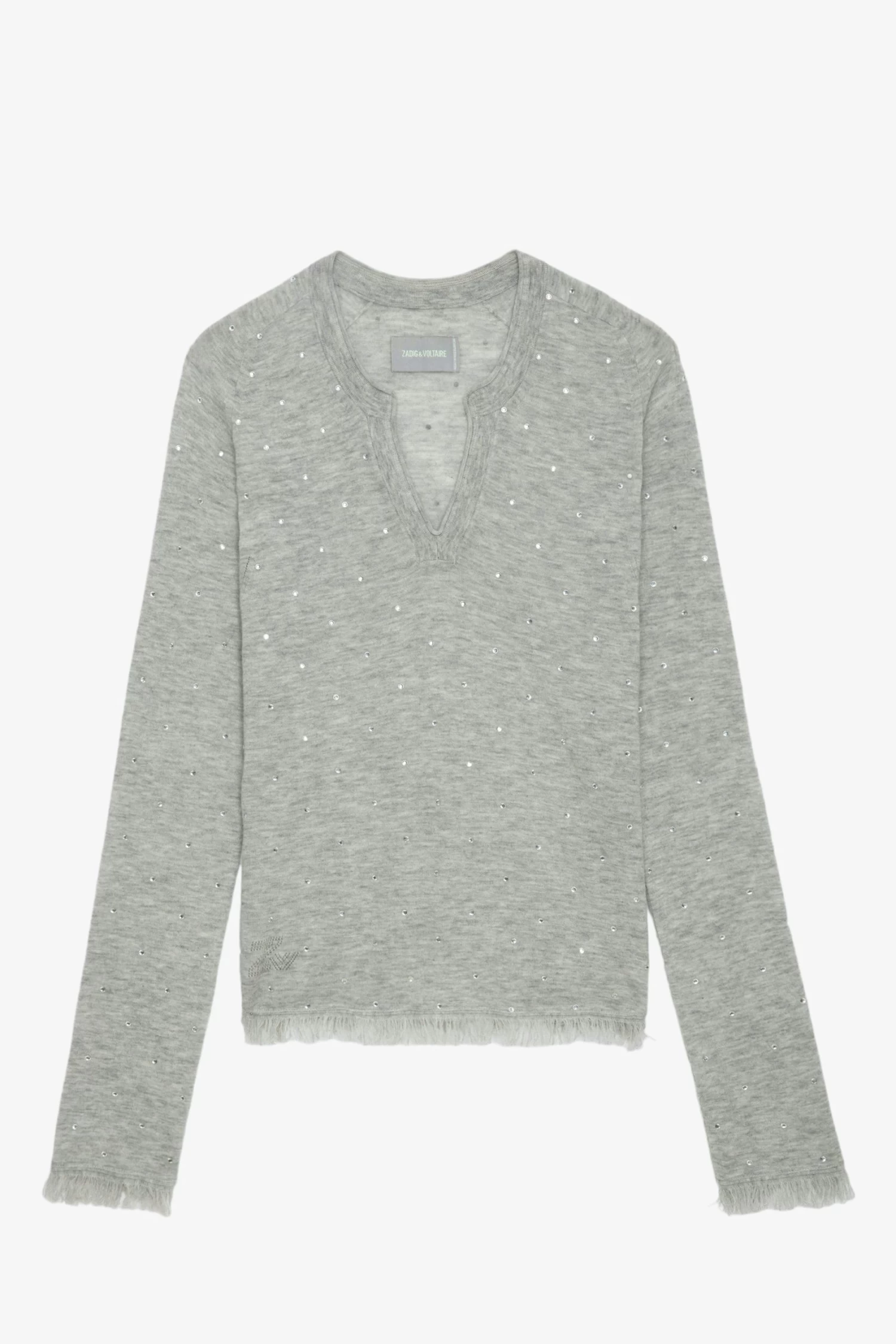 – Women’s grey light cashmere sweater – All over diamanté – V neckline – Long sleeves – ZV pointelle on hem – Distressed cuffs and hemModel is 174 cm / 5′ 8″ and is wearing a size S The cashmere for this product is produced according to The Good Cashmere Standard® by AbTF. The standard ensures the welfare of the cashmere goats, protects natural resources and supports the local farmers that produce it.