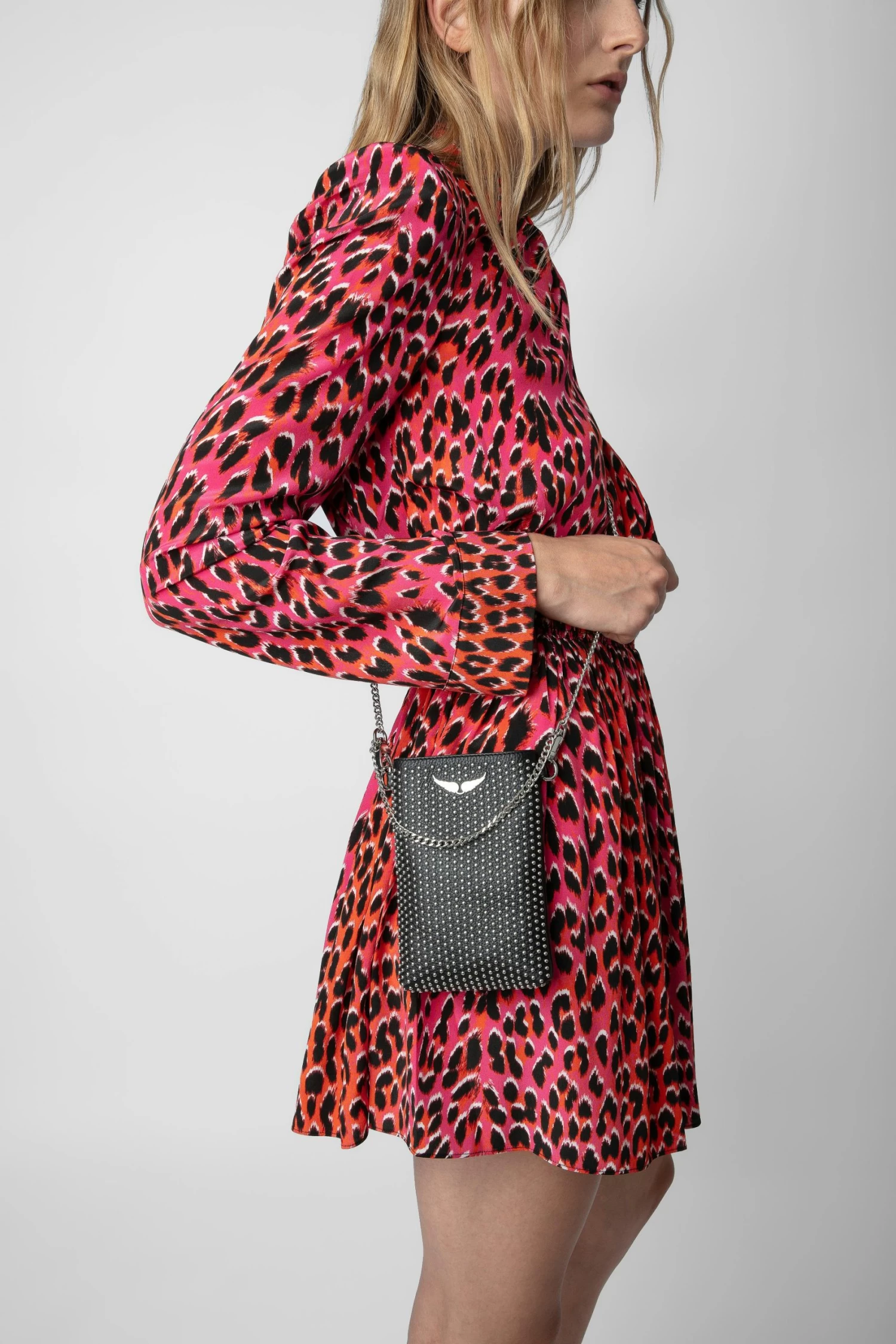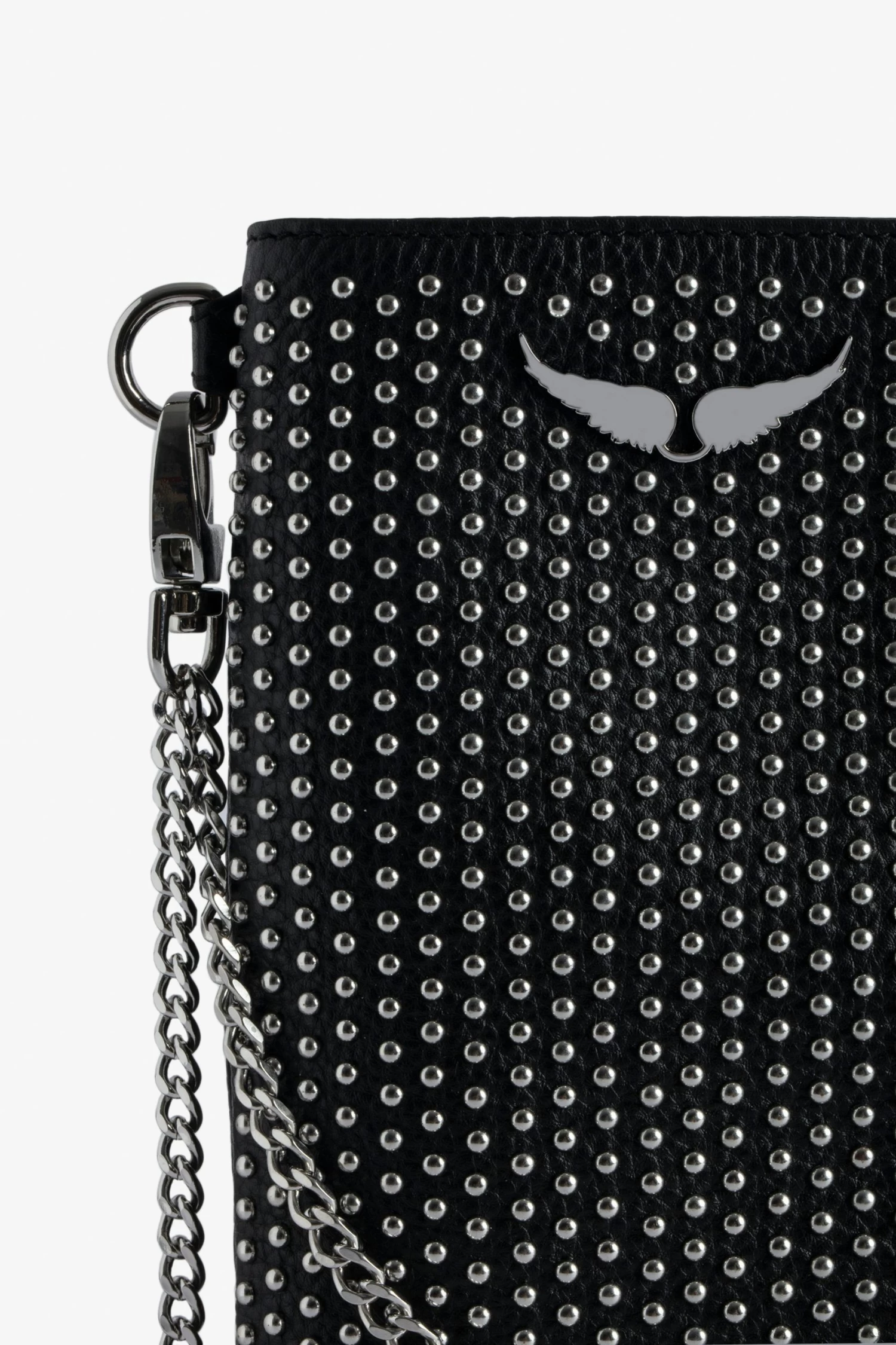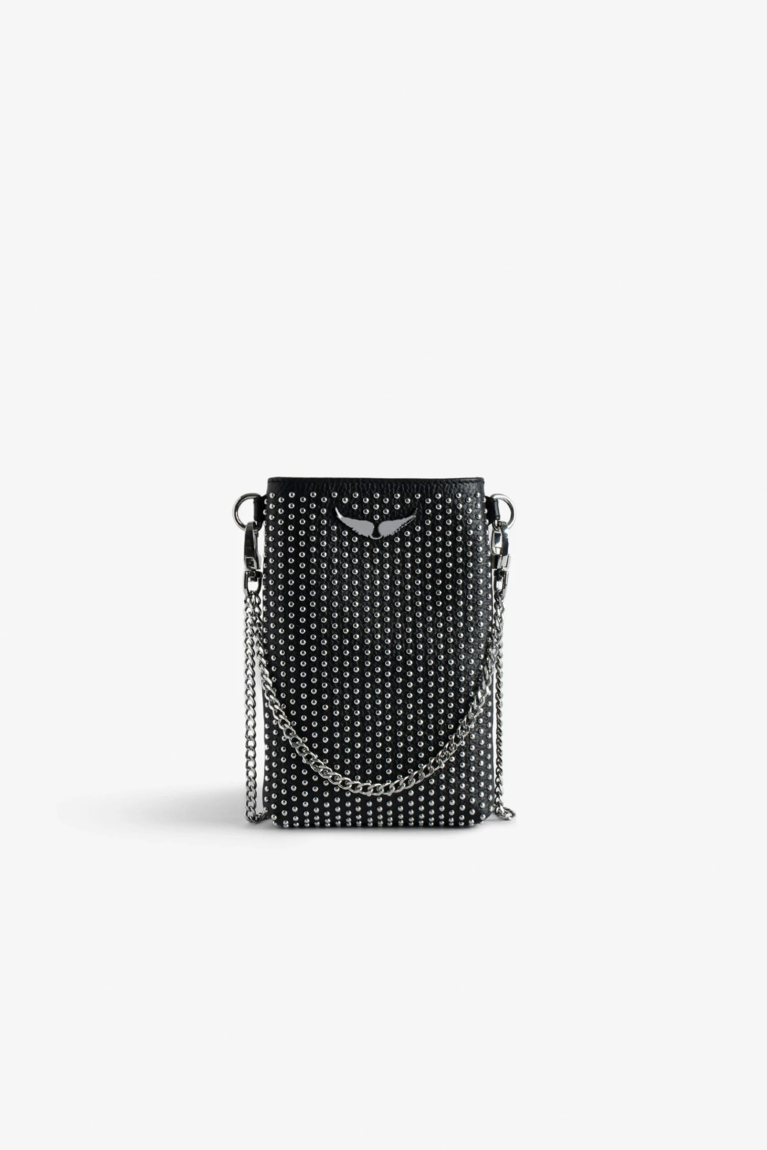 – Women’s black grained leather phone pouch – Shoulder strap with removable double metal chains – All over studded details – 3 card slots on inside and one zipped pocket on outside at back – Tone-on-tone wings charm The Leather Working Group/LWG is a membership organization comprised of brands, suppliers, leather manufacturers and other stakeholders within the leather manufacturing industry. The group has developed an auditing program which certifies leather manufacturing facilities based on their environmental compliance and performance capabilities