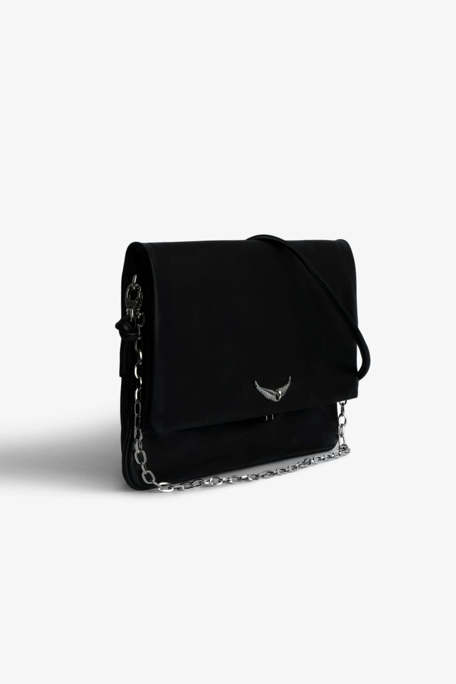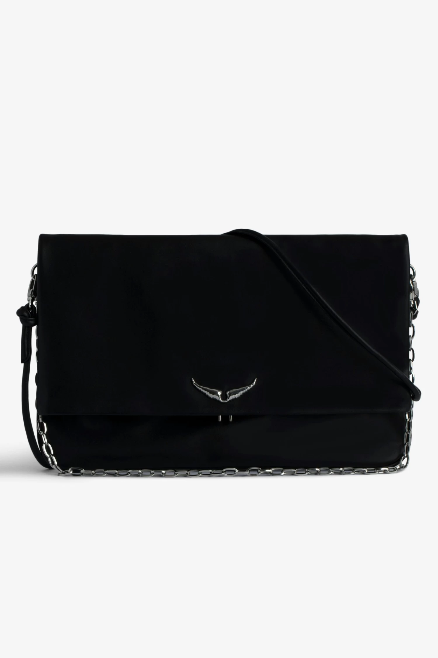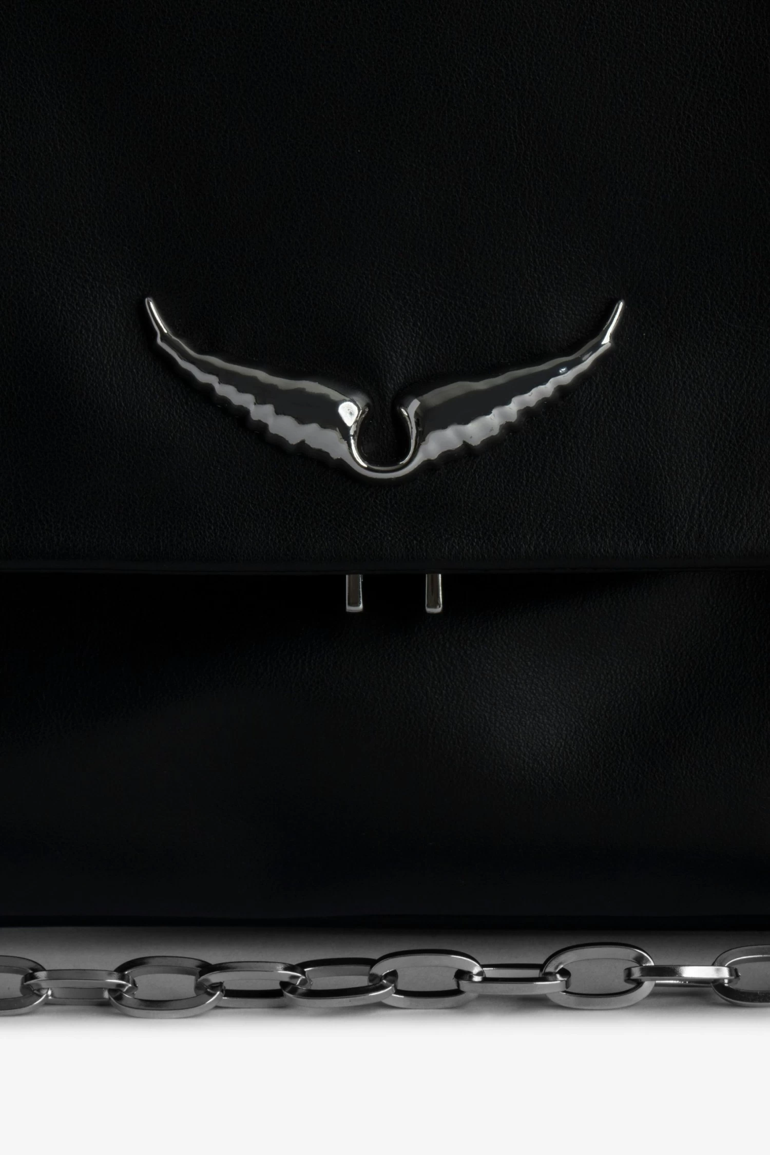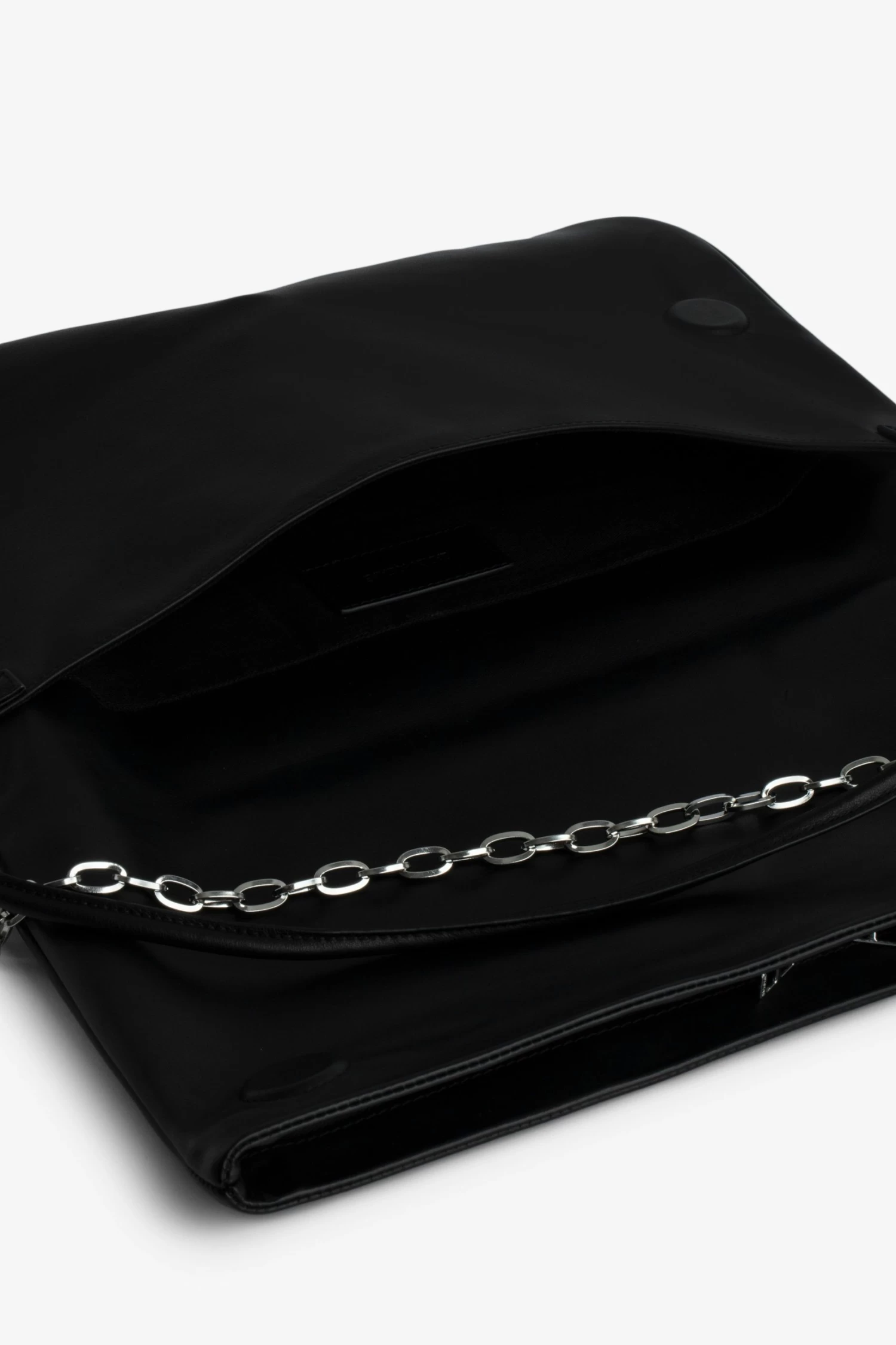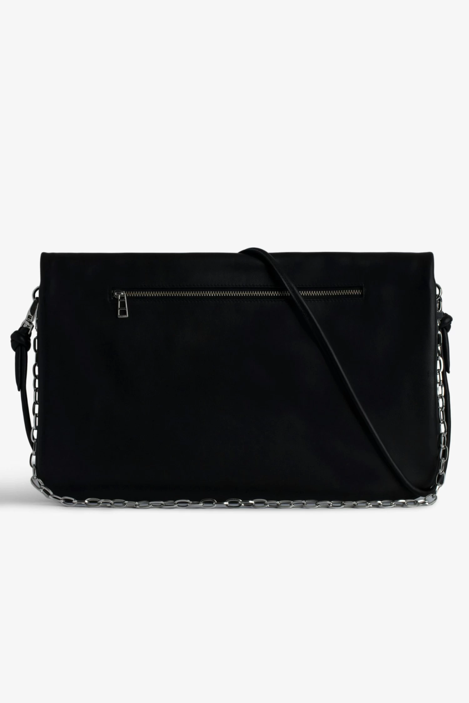 Rock XL black smooth leather clutch bag with double leather and metal chain strap.