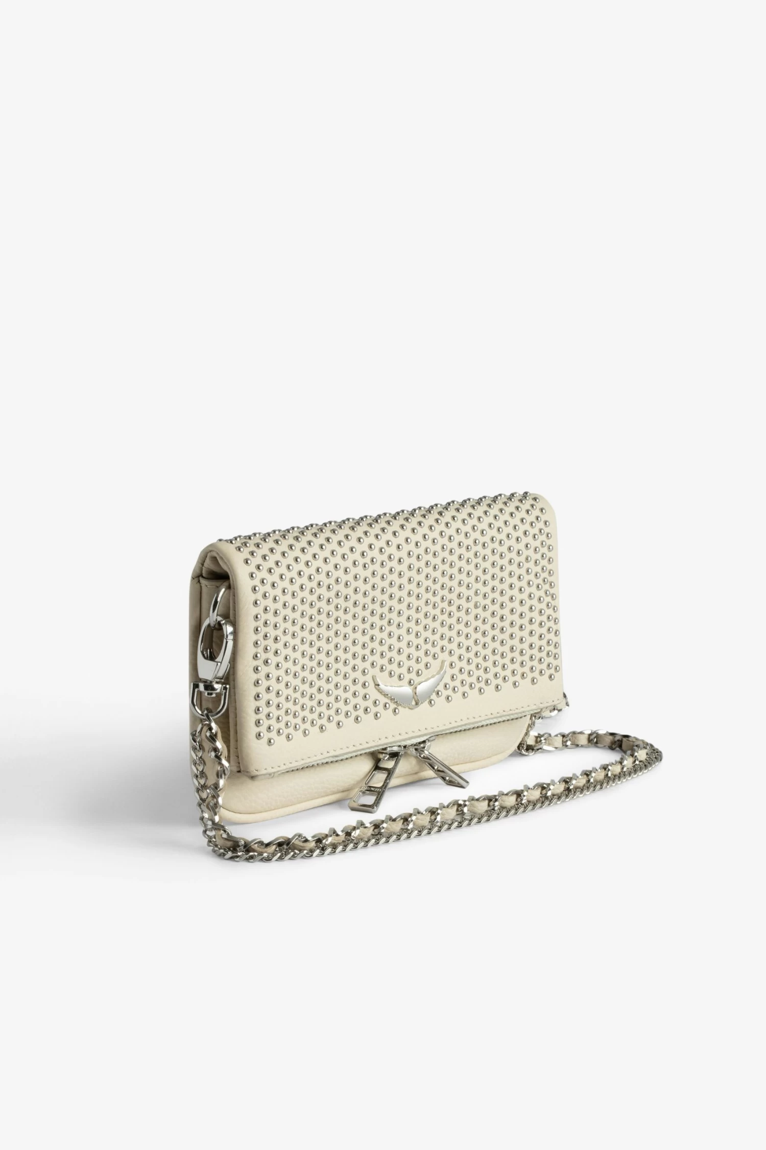 Women’s small white grained leather clutch with dotted Swiss studs, chains and wings.