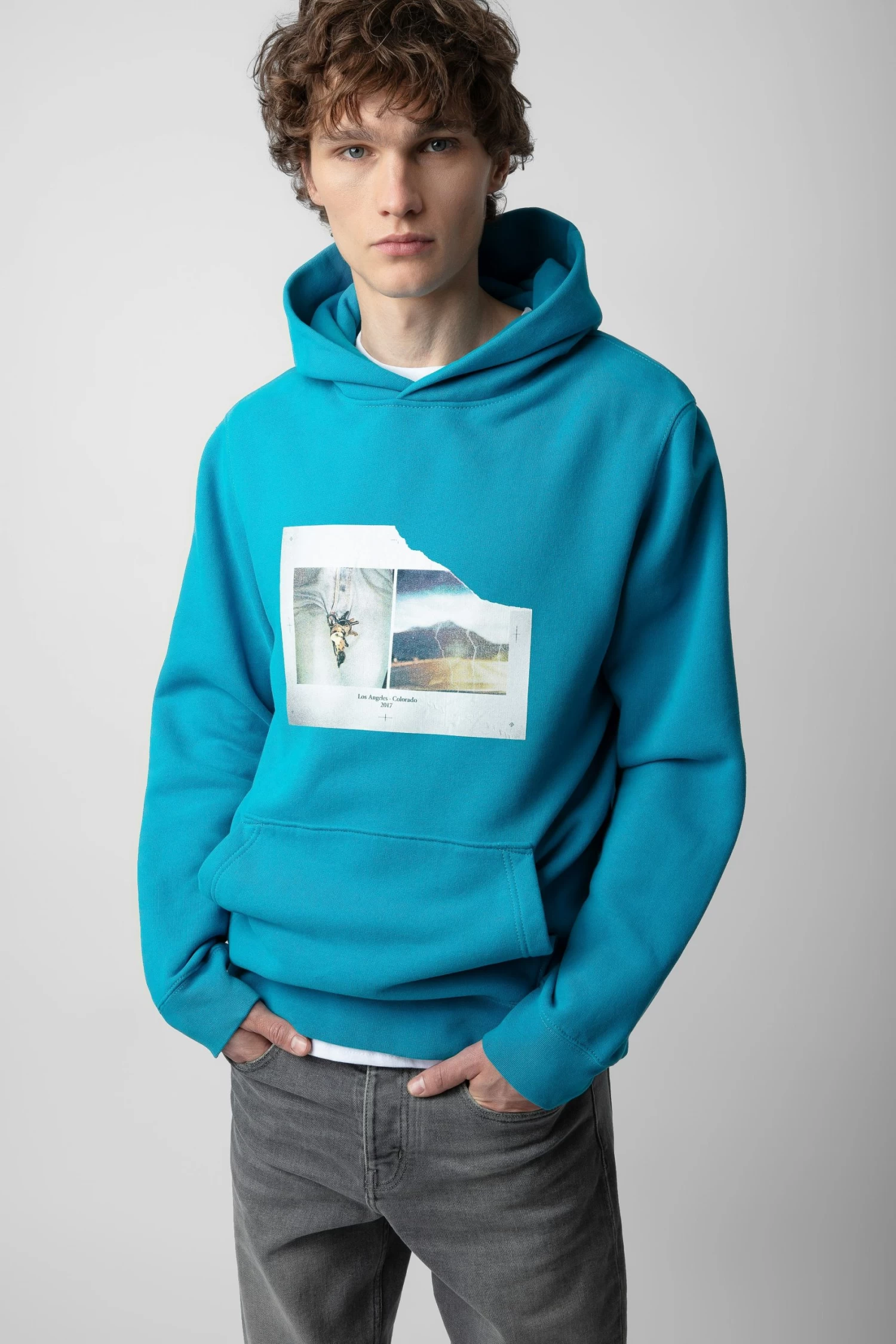 Teal blue long-sleeved hooded sweatshirt with photoprint and printed slogan.