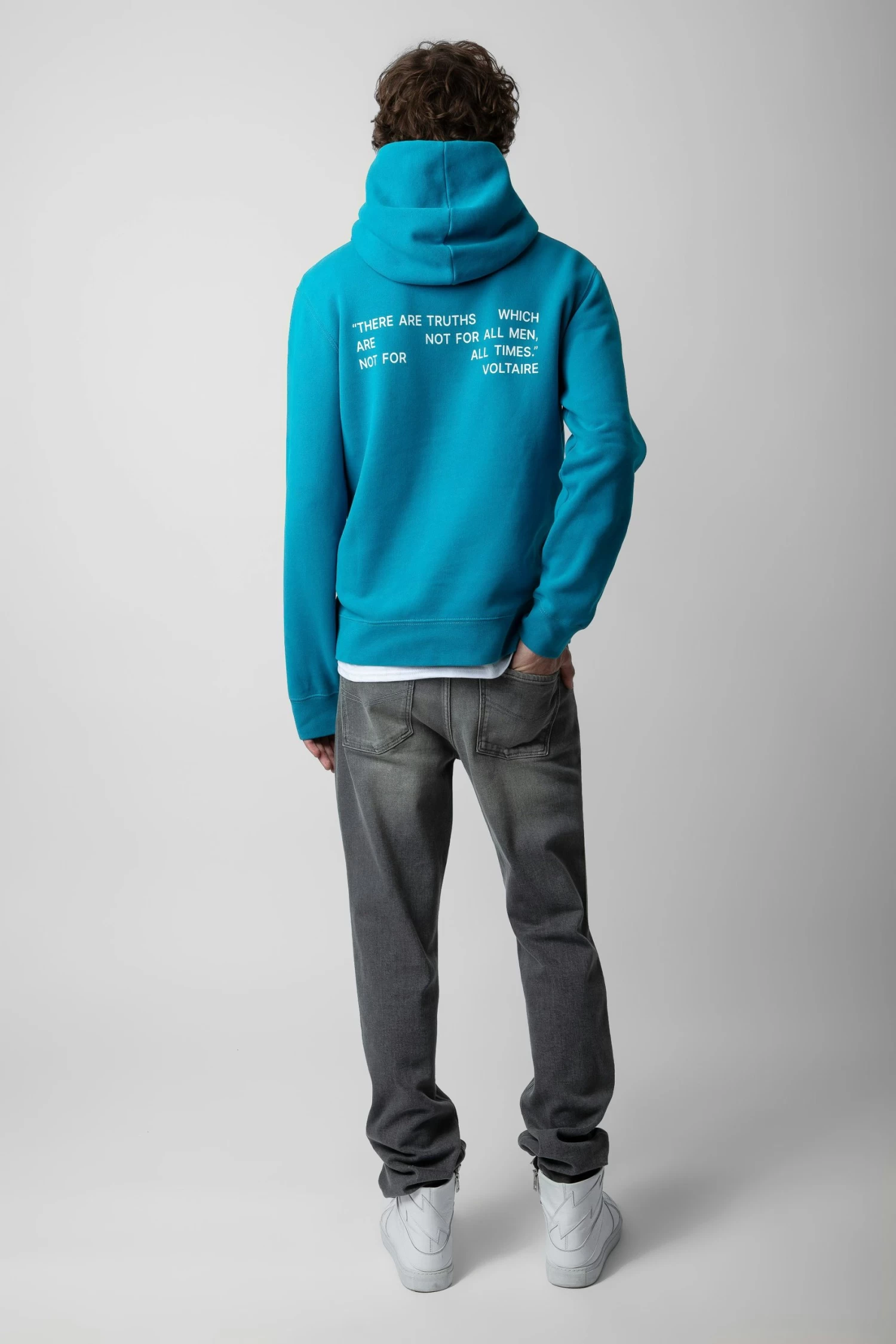 – Men’s Duck teal blue hooded sweatshirt – Photoprint on the front and “These are truths which are not for all men, not for all times” slogan on the back – Long sleeves and pocket on the front – Made in Portugal Model is 187 cm / 6′ 1″ and is wearing a size M**Fibers from organic farming